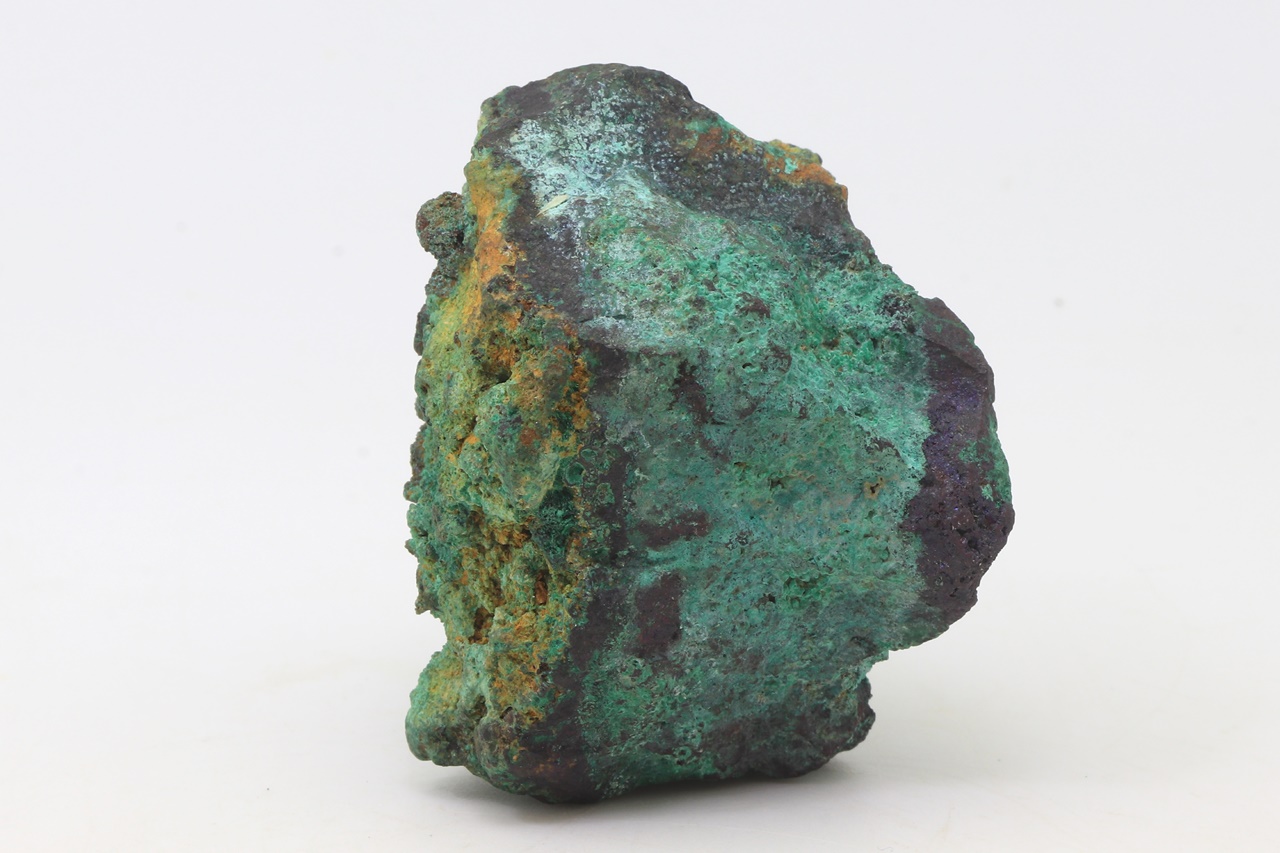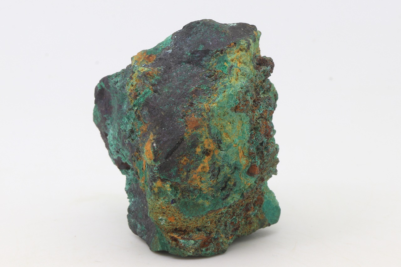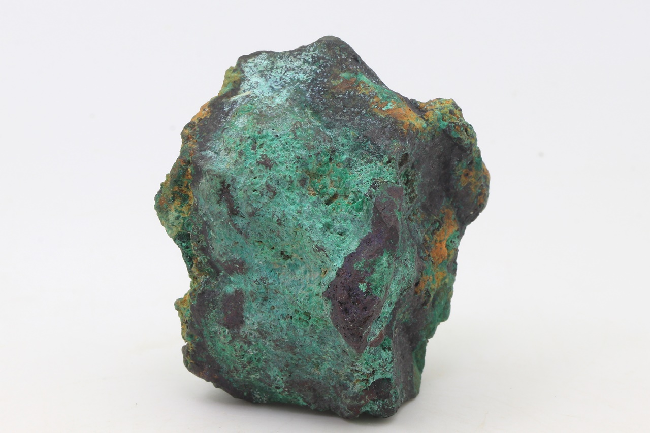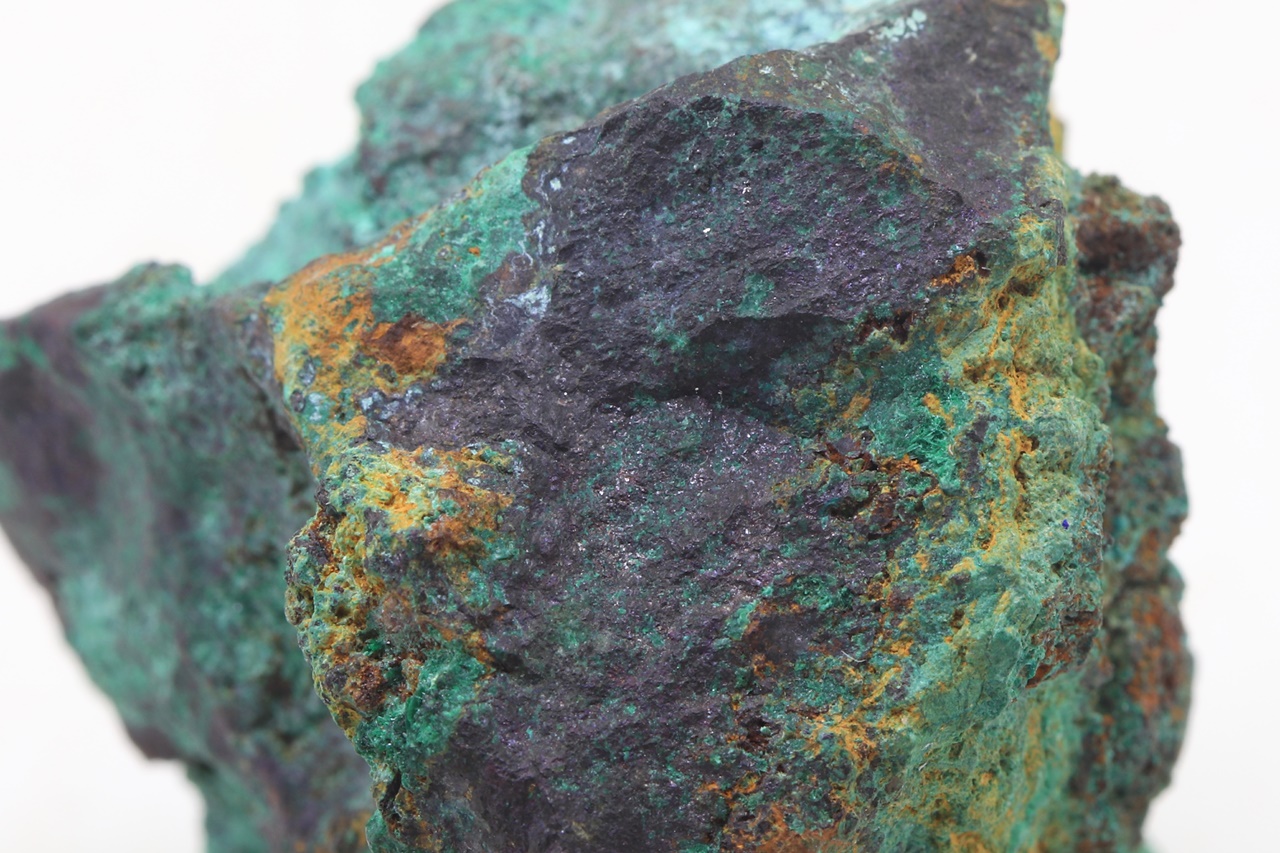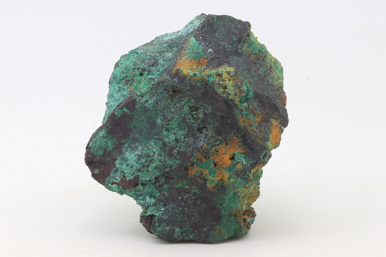 Schwarzer massiver Kuprit, überwachsen mit sekundärem grünem Malachit.