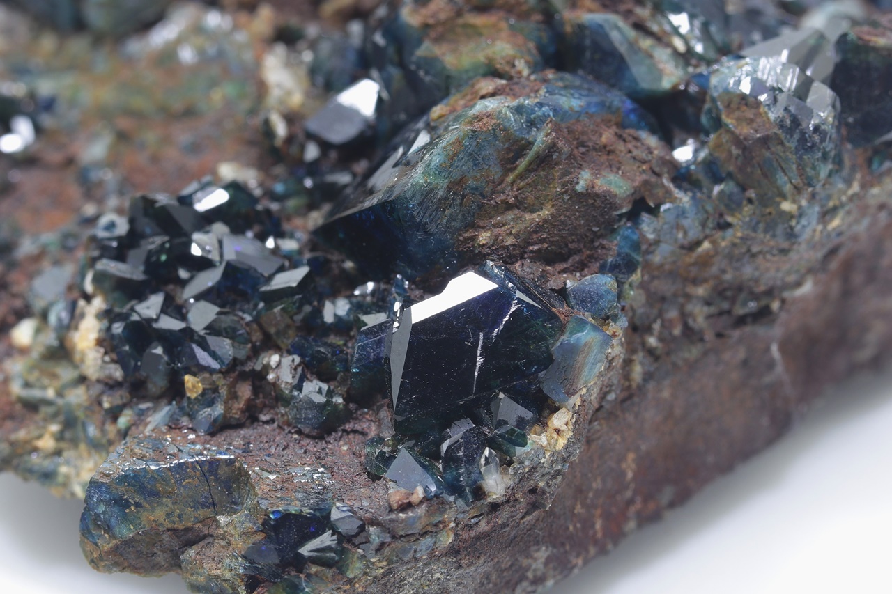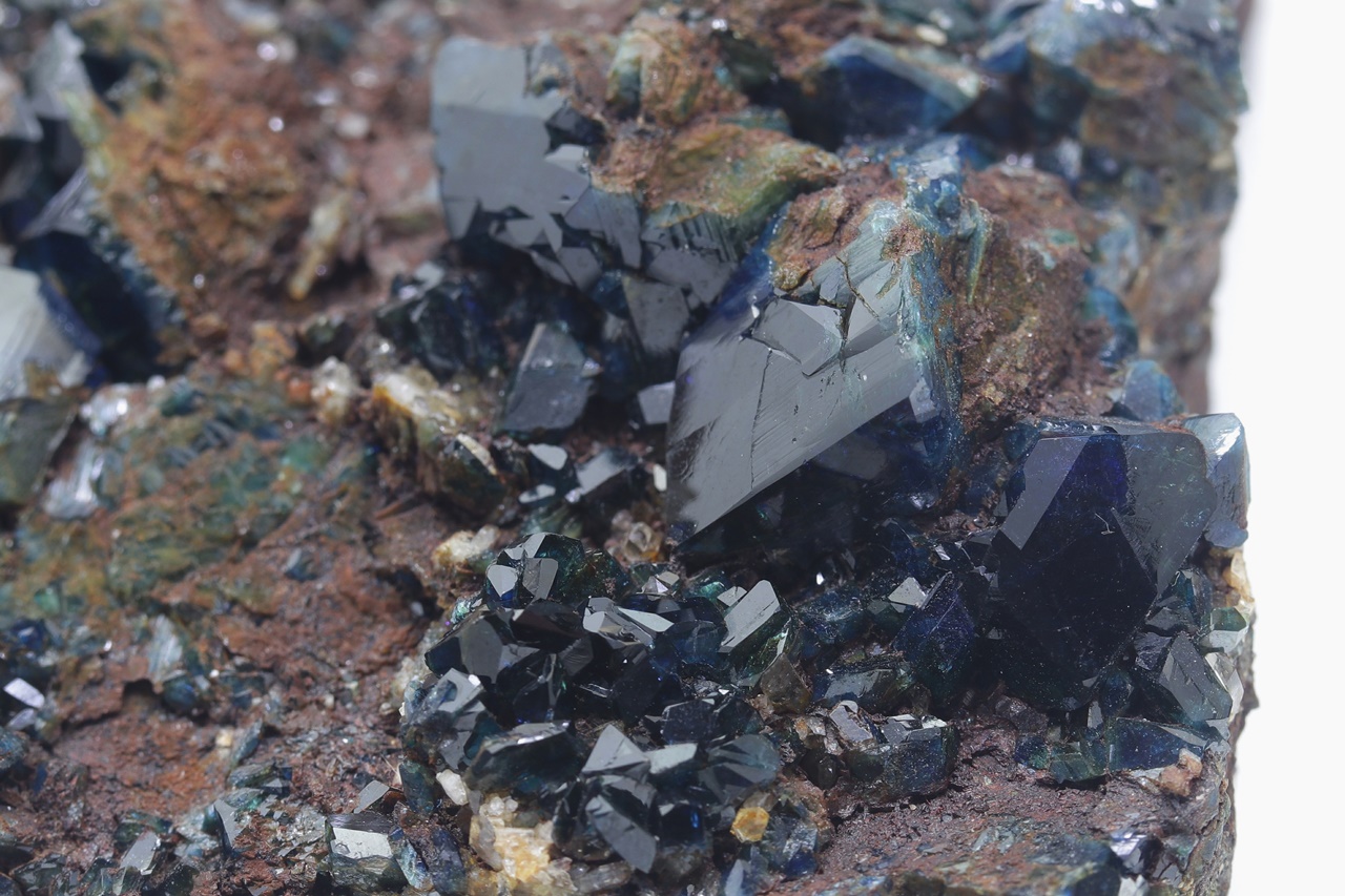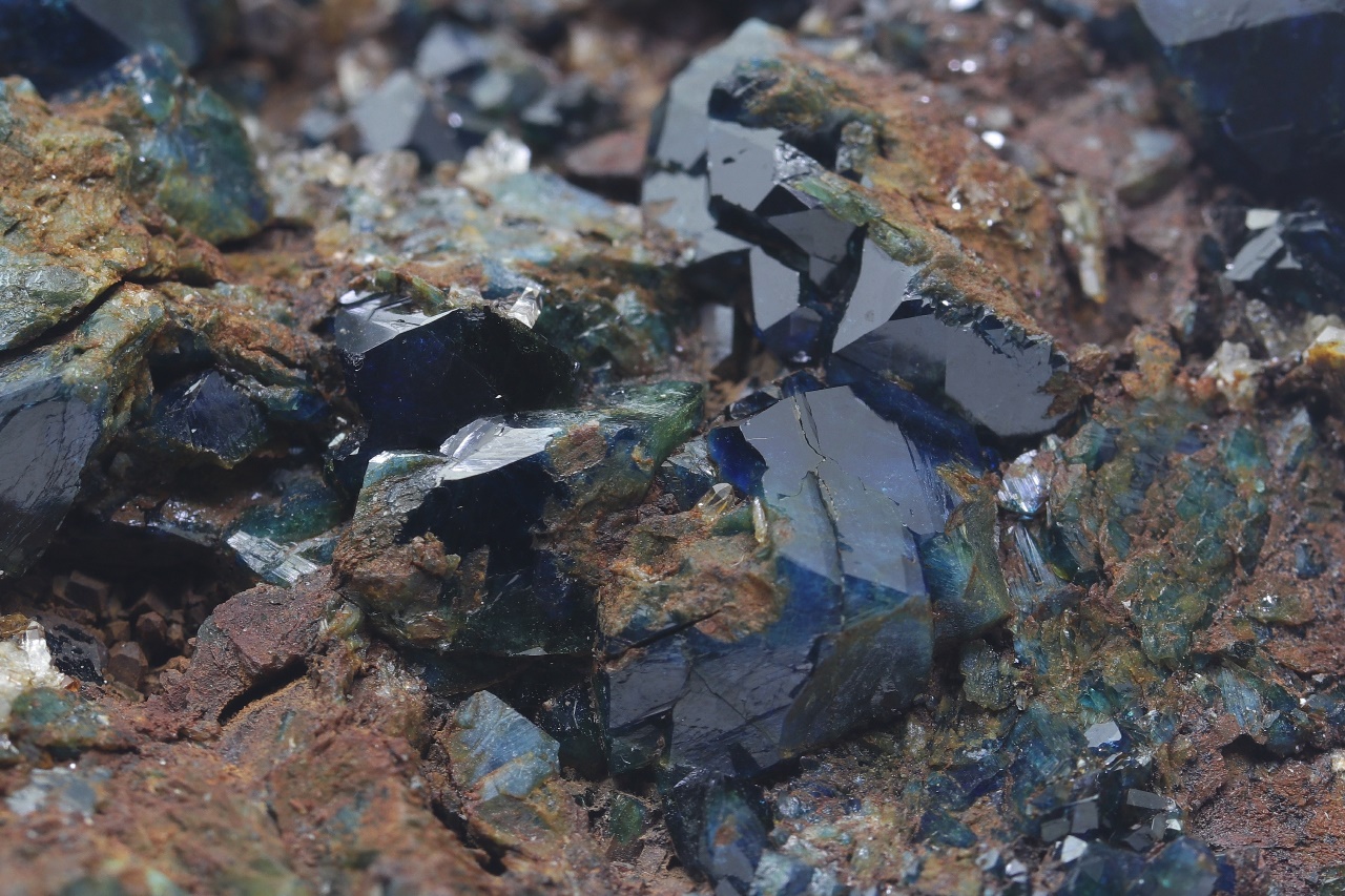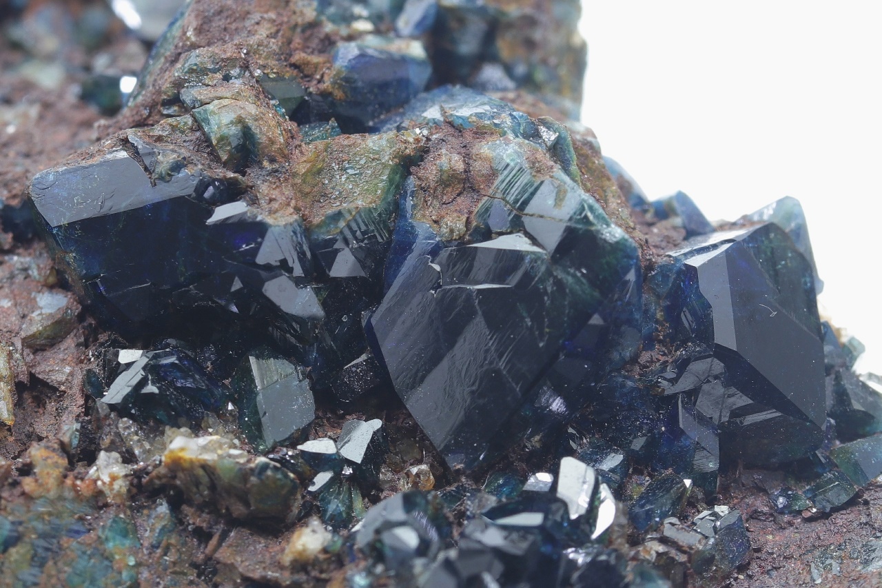 Druse wunderschöner, glänzender, dunkelblauer Kristalle von Magnesiumphosphat. Der größte Kristall ist 1,5 cm groß.