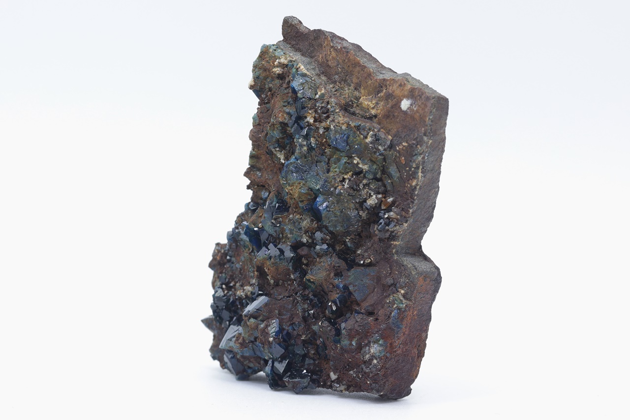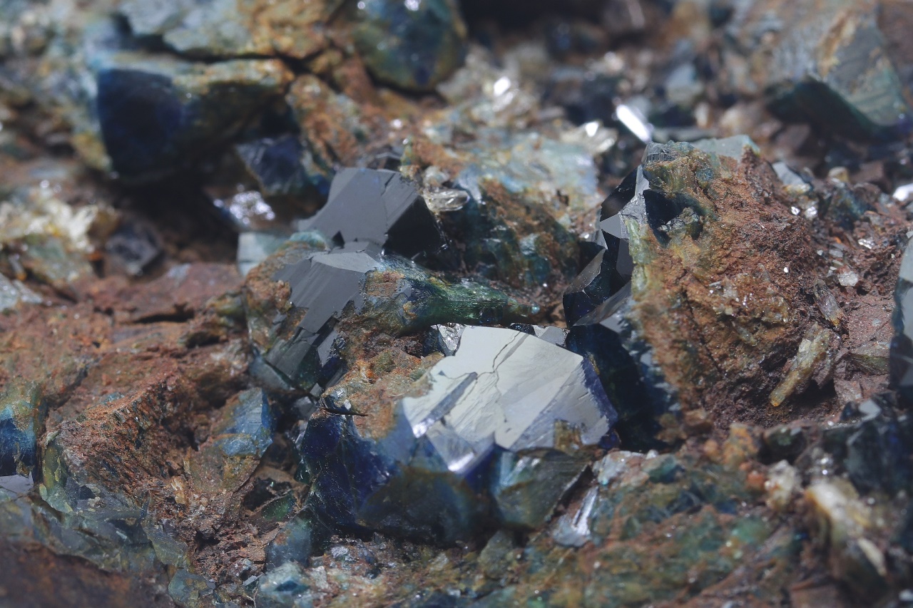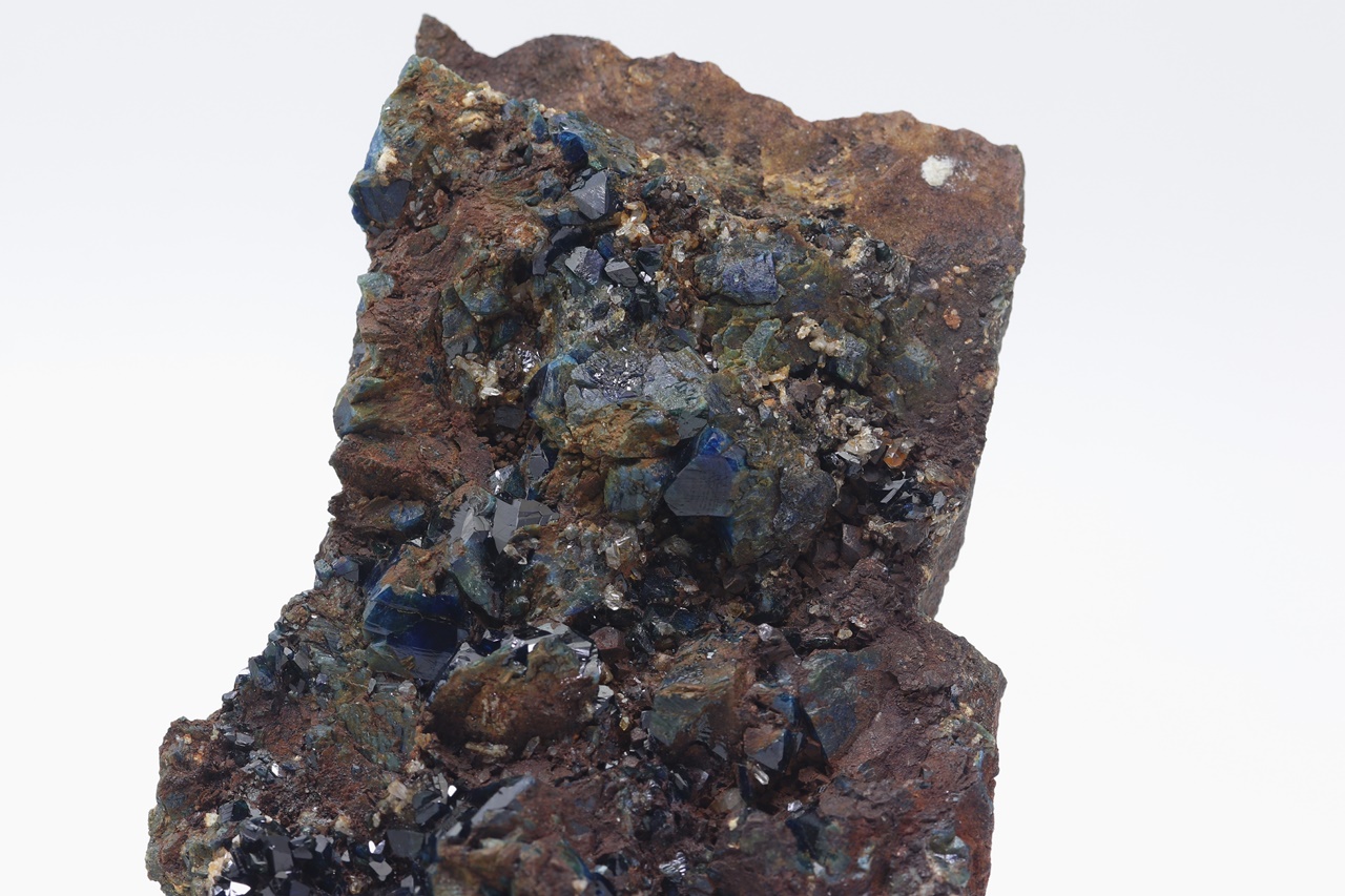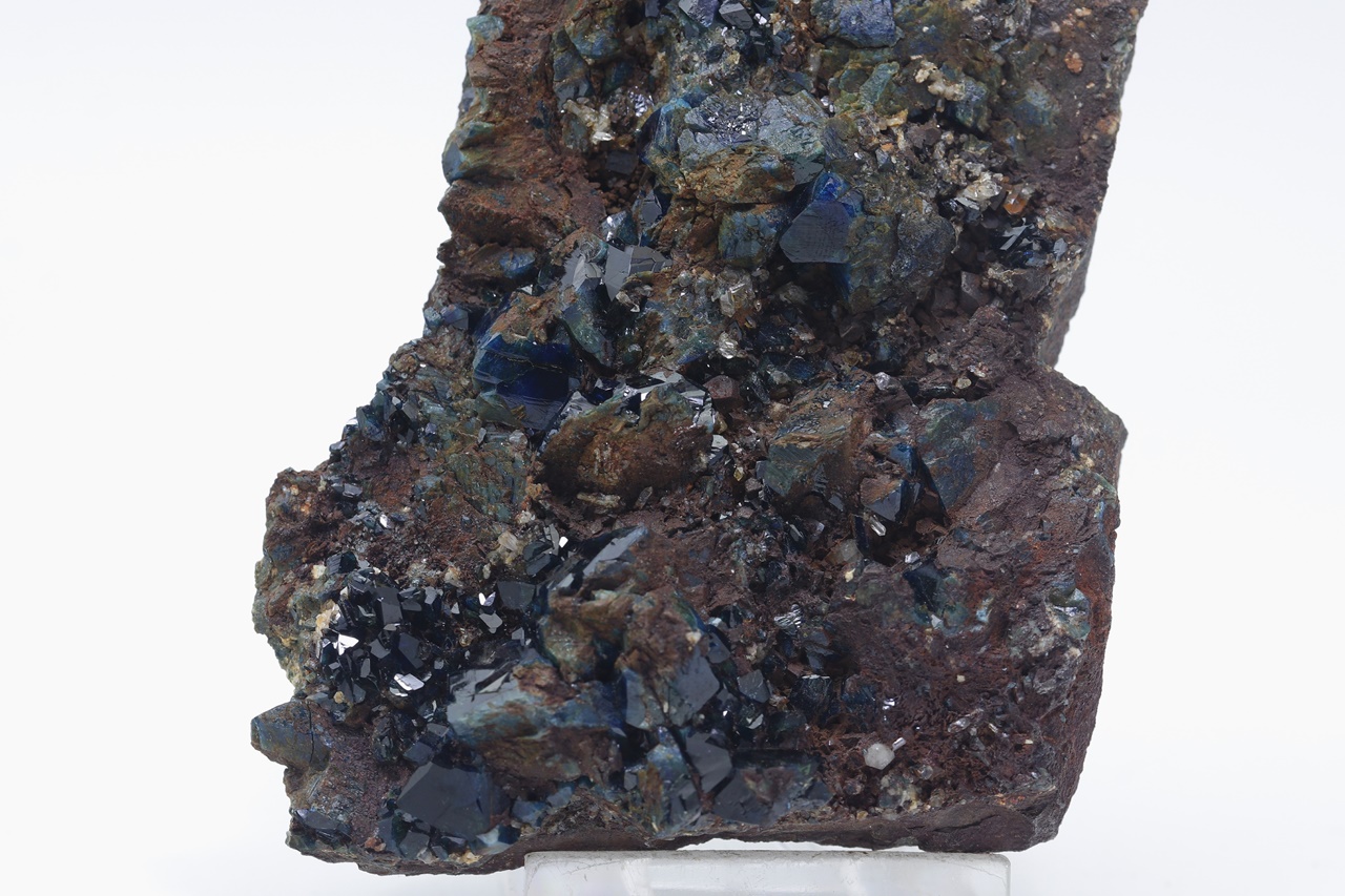 Druse wunderschöner, glänzender, dunkelblauer Kristalle von Magnesiumphosphat. Der größte Kristall ist 1,5 cm groß.