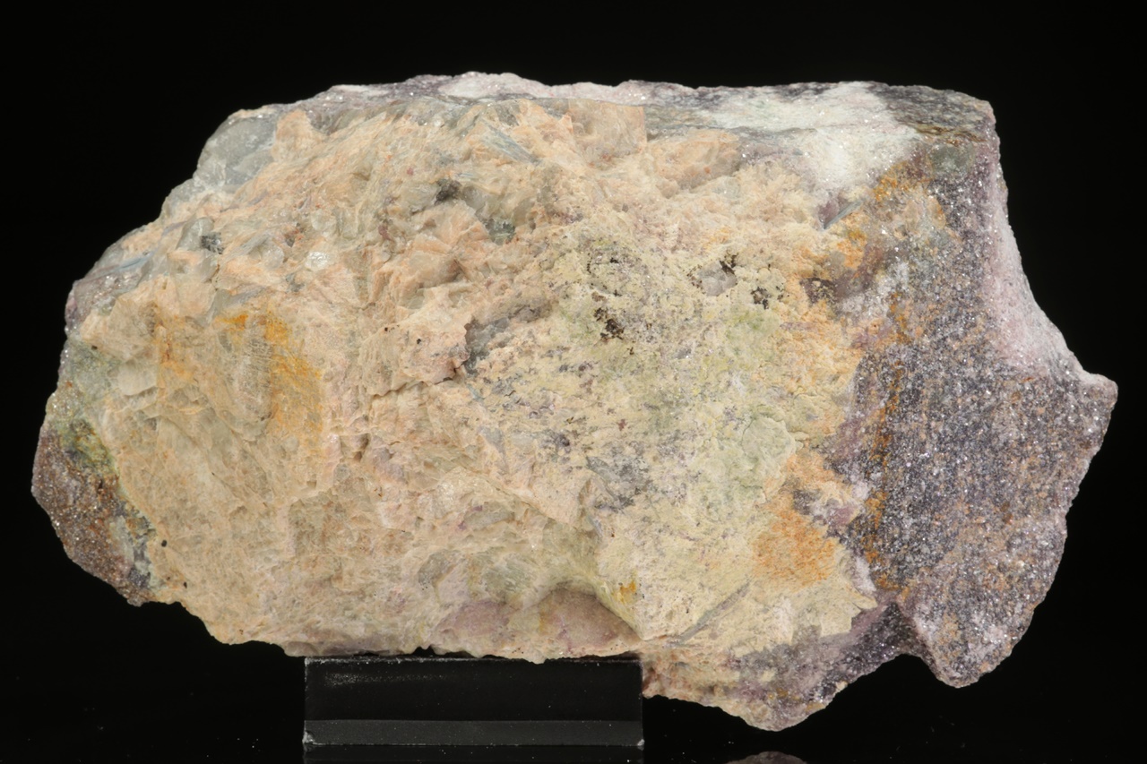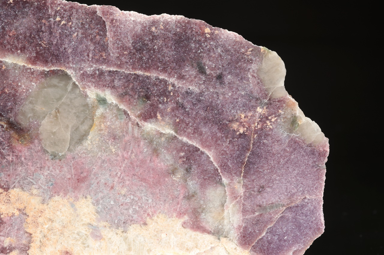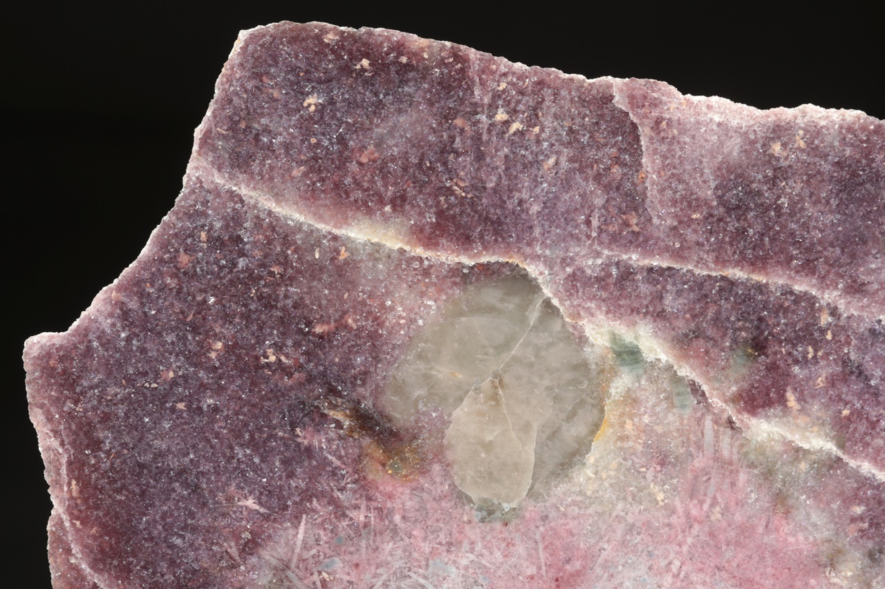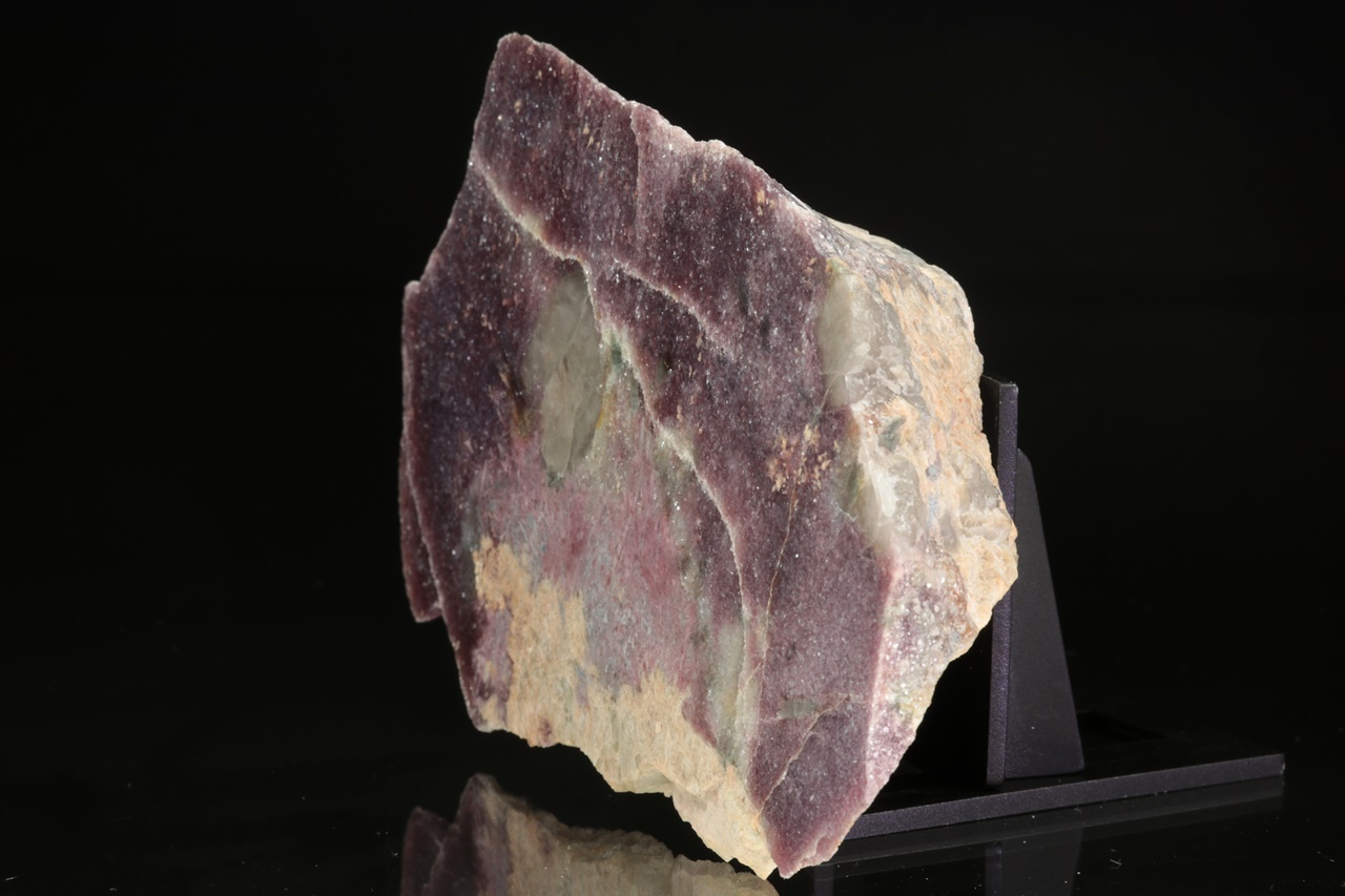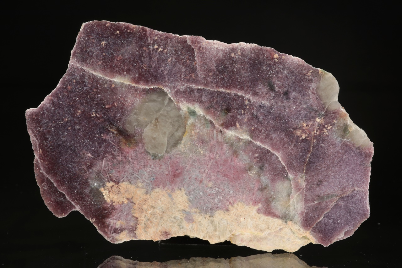 Polierter Muster eines massiven, sehr intensiv violett gefärbten Lepidolits mit rosa Turmalin-Stängeln.