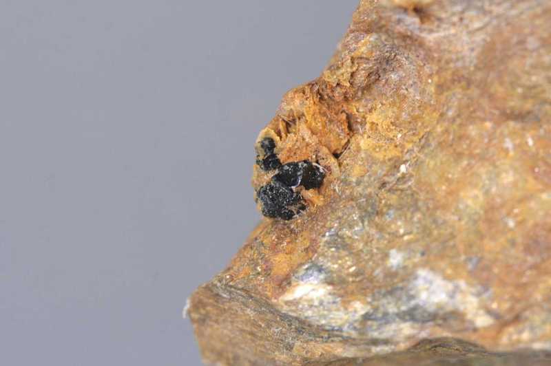 Schönes Beispiel eines seltenen Libethenit aus der Typlokalität. Srostlice dunkelgrüner Libethenit-Kristalle in einer mit Limonit bedeckten Quarzhöhle .