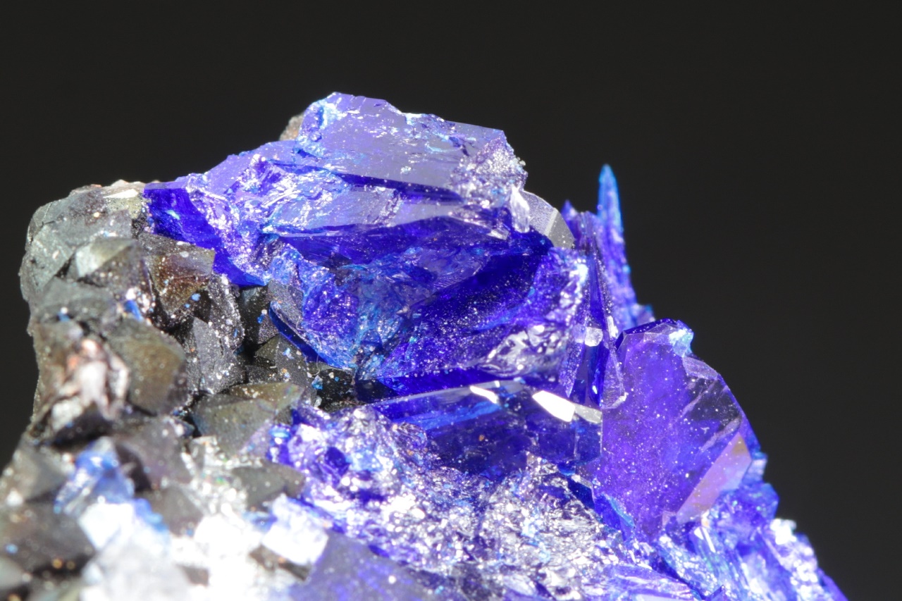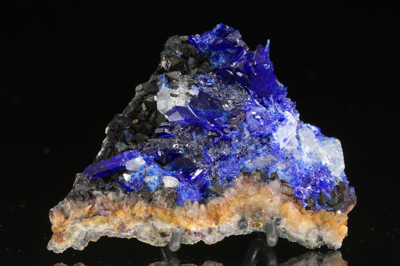 Reiche Probe von intensiv blauen, glänzenden Kristallen aus Bleisulfat und Kupfer – Linarit von einer renommierten amerikanischen Lokalität. Der größte Kristall in der Mitte der Probe ist bis zu 8 mm groß.