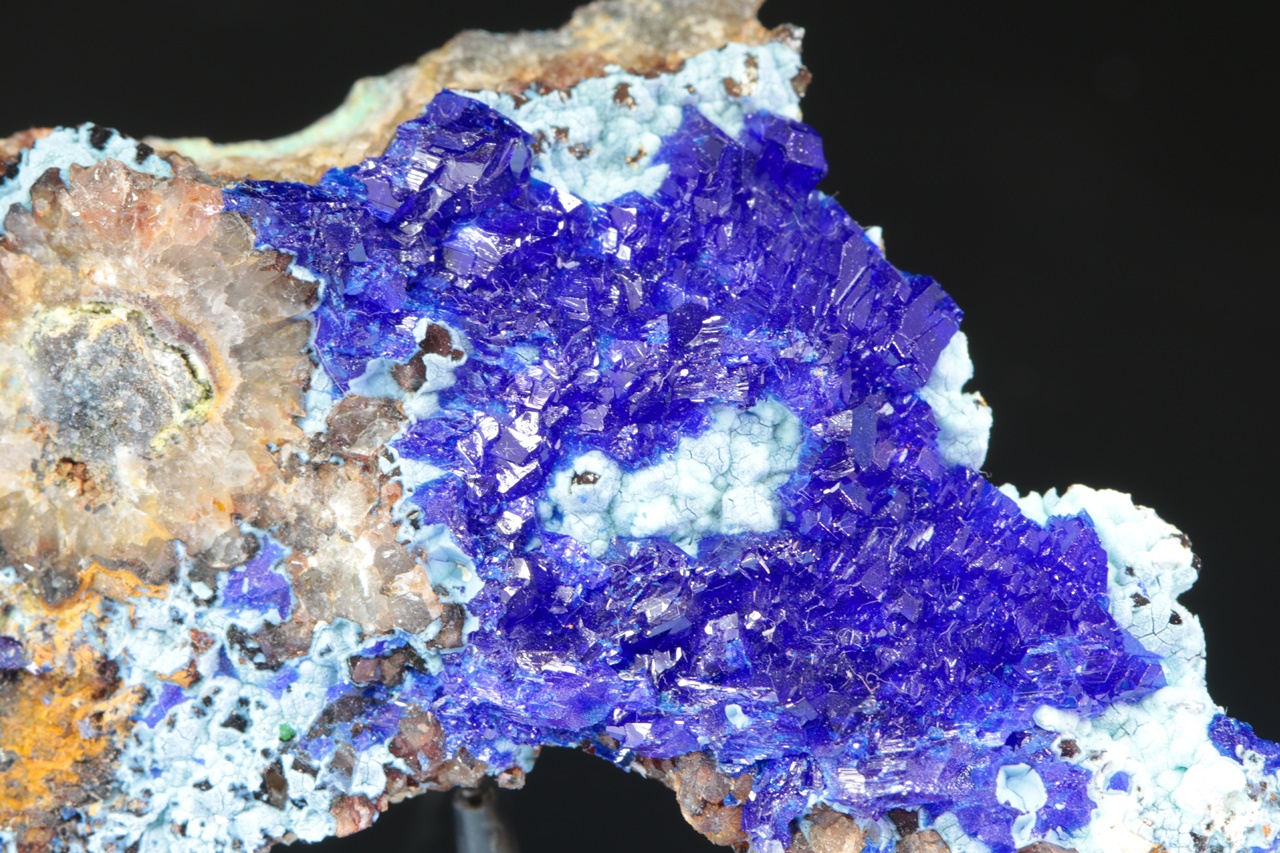 Intensiv blau leuchtende, glänzende Kristalle von Linarit.