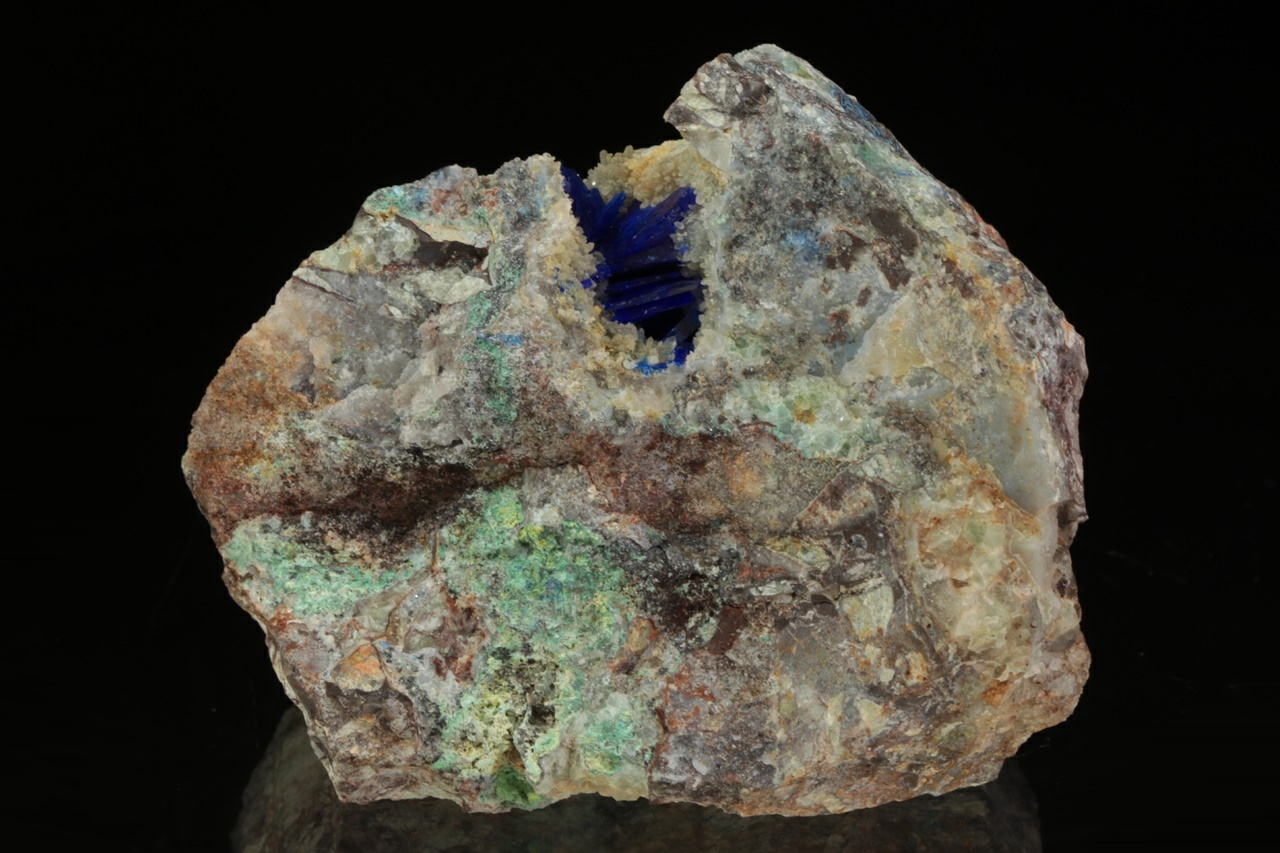Einzigartiges Exemplar von unbeschädigten, über 1 cm großen, glänzenden Kristallen in intensivem Blau, die in einer Quarzhöhle gewachsen sind. Die Abmessungen der Höhle sind ungefähr 2 × 1 cm.