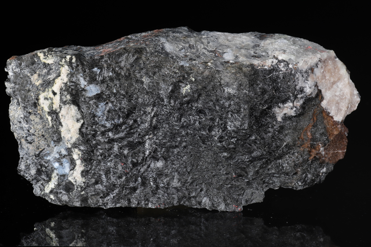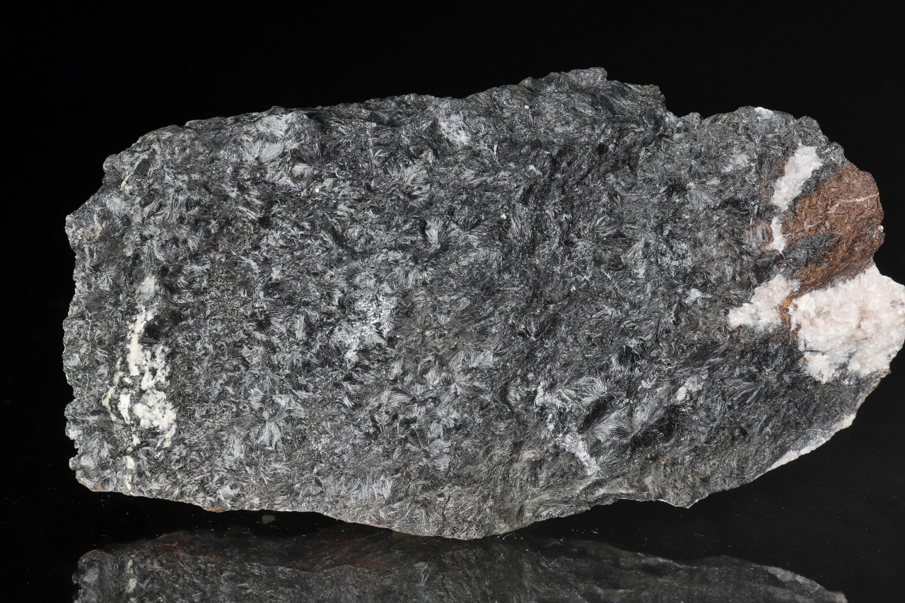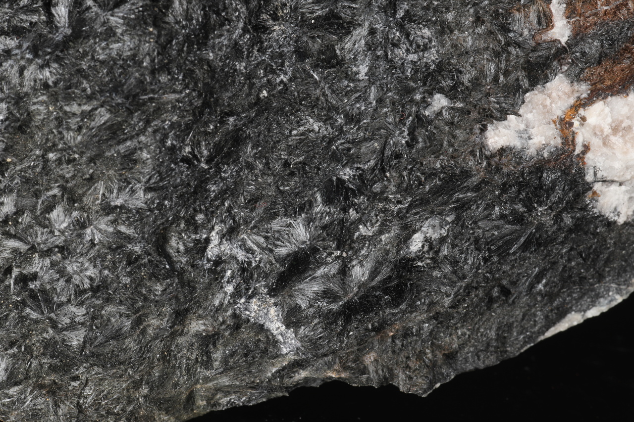 Massives Stück, das hauptsächlich aus faserigem, radial-strahlenförmigem schwarzem Ludwigitem besteht. Ludwigitem ist ein nicht sehr häufig vorkommendes Eisen- und Magnesiumborat. Diese reiche Probe stammt von seiner Typlokalität Ocna de Fier in Rumänien.