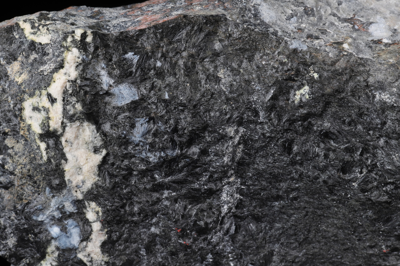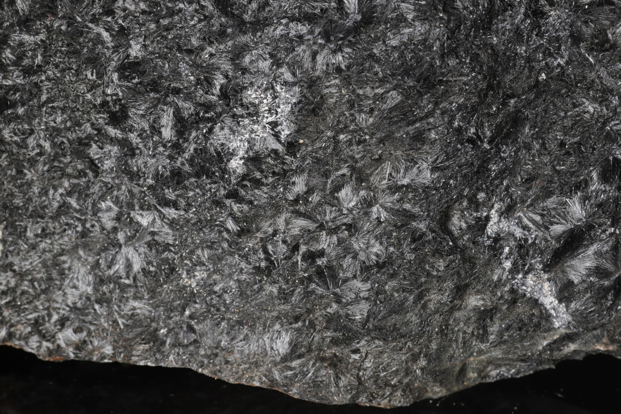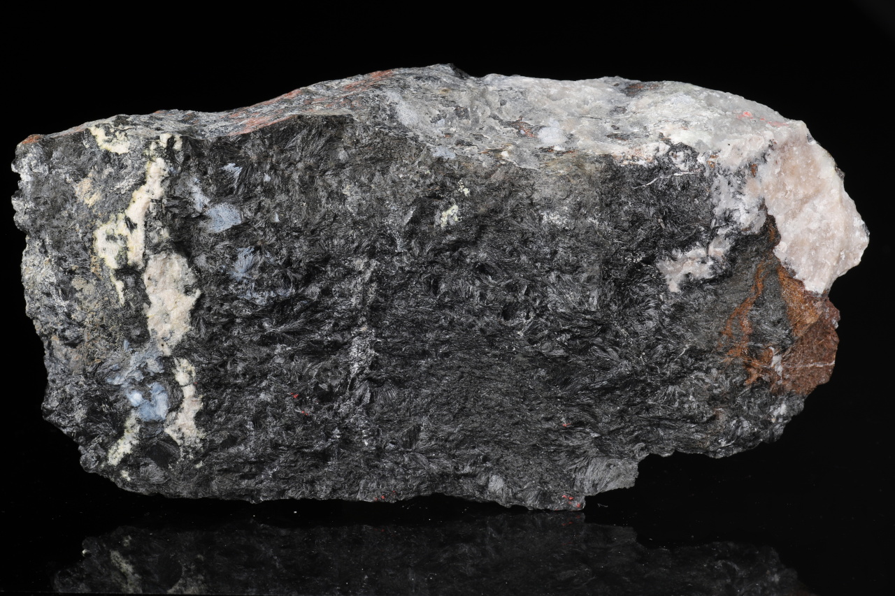 Massives Stück, das hauptsächlich aus faserigem, radial-strahlenförmigem schwarzem Ludwigitem besteht. Ludwigitem ist ein nicht sehr häufig vorkommendes Eisen- und Magnesiumborat. Diese reiche Probe stammt von seiner Typlokalität Ocna de Fier in Rumänien.