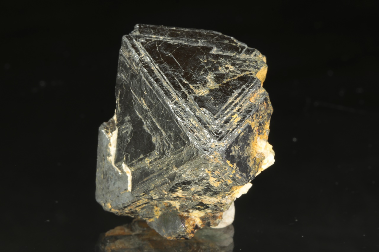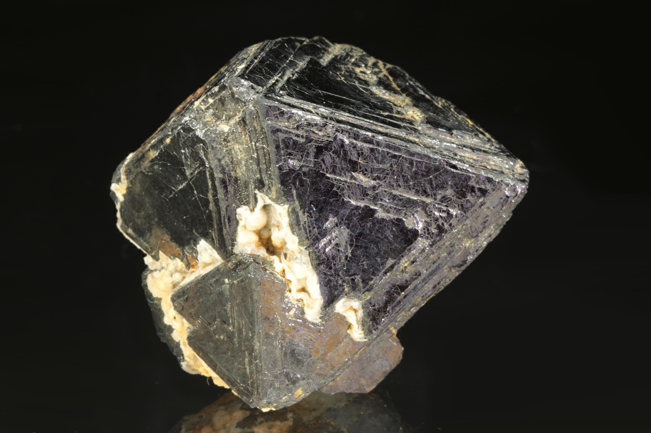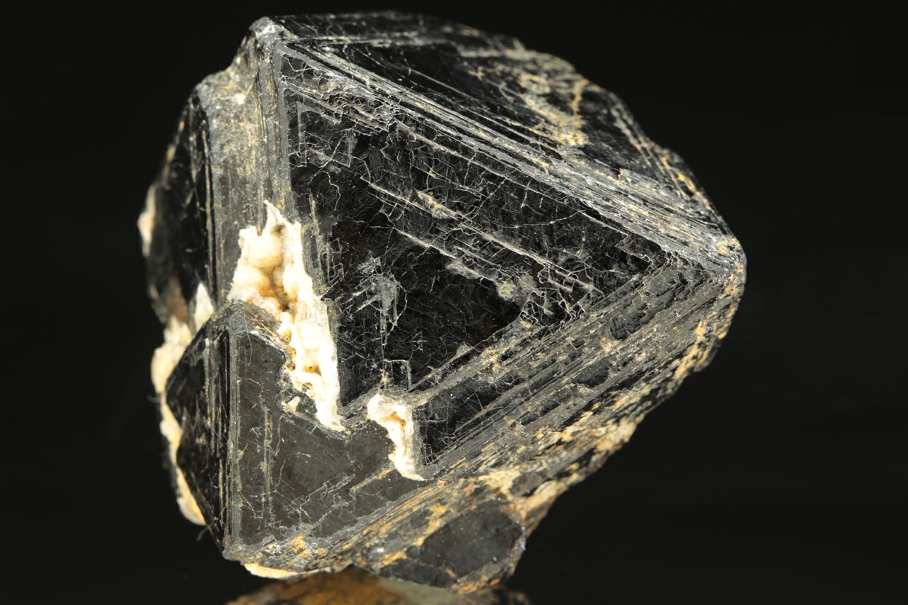 Metallically glossy incomplete octahedron of megnetite with white feldspar.