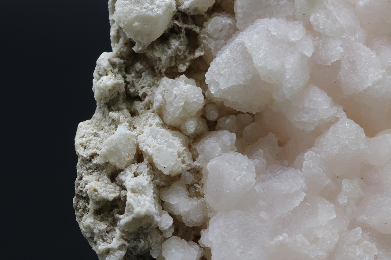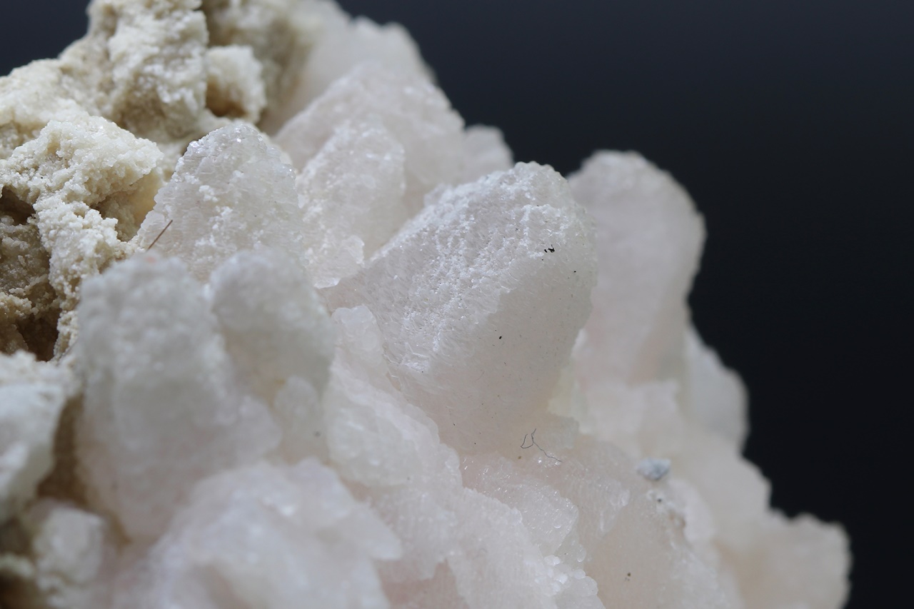Hypoparallel verwachsene Aggregate aus manganreichem Kalcit, gewachsen auf korrodiertem Dolomit.