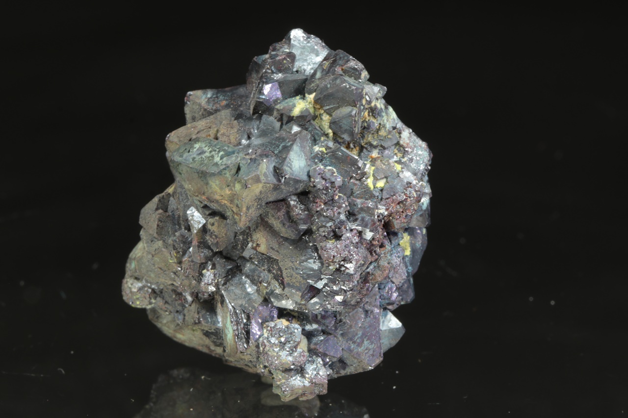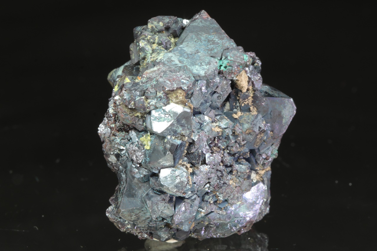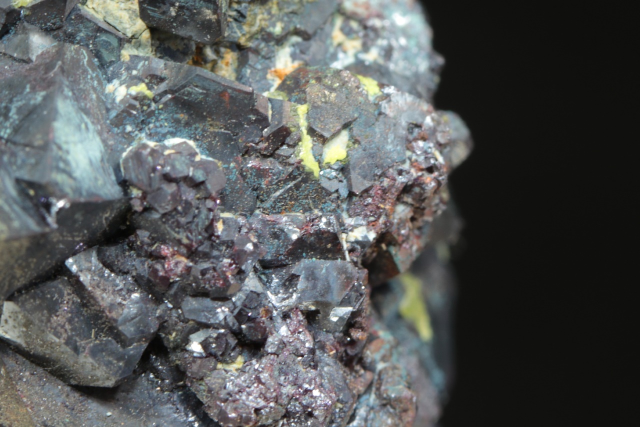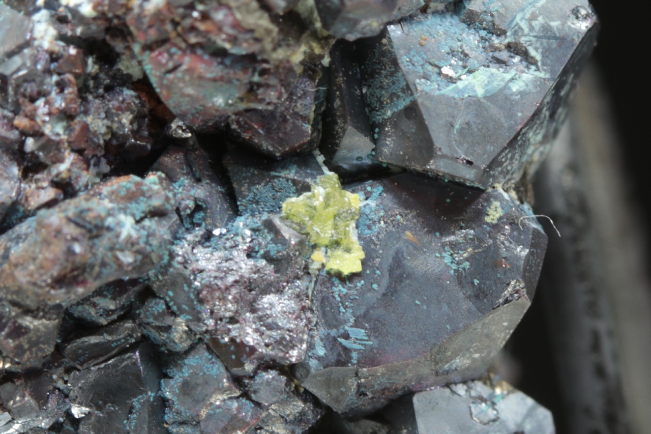 Druse von metallisch glänzenden Oktaedern des Kuprit mit Büschen aus weißem Silber. Auf den Kuprit wachsen gelbe Kristalle des sehr seltenen Kupfer- und Silberjodids – Miersit, das nur an wenigen Weltfundorten beschrieben wurde. Der größgrößte Kupritkristall ist 1 cm groß.