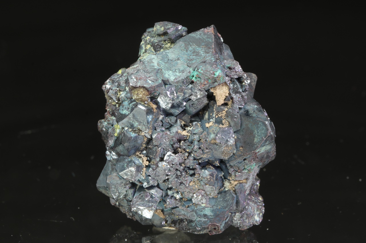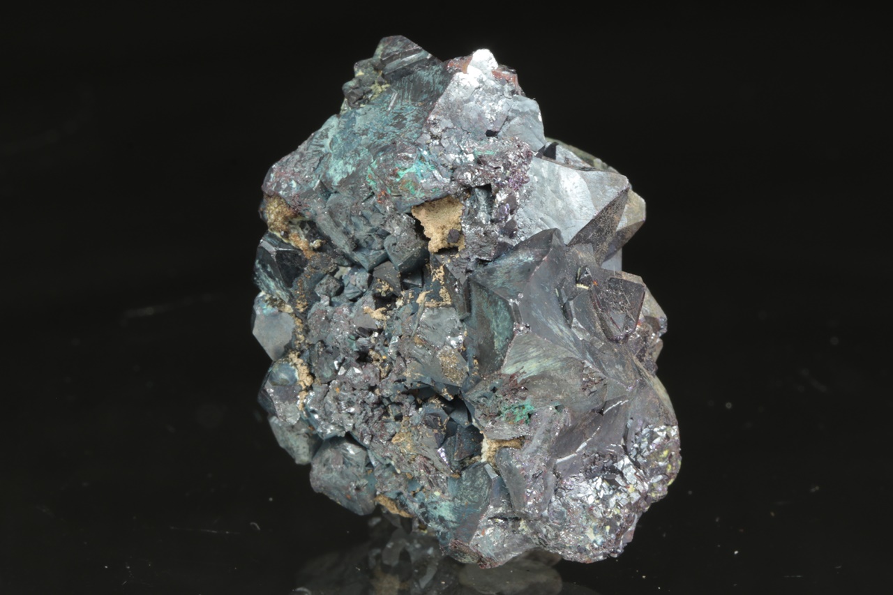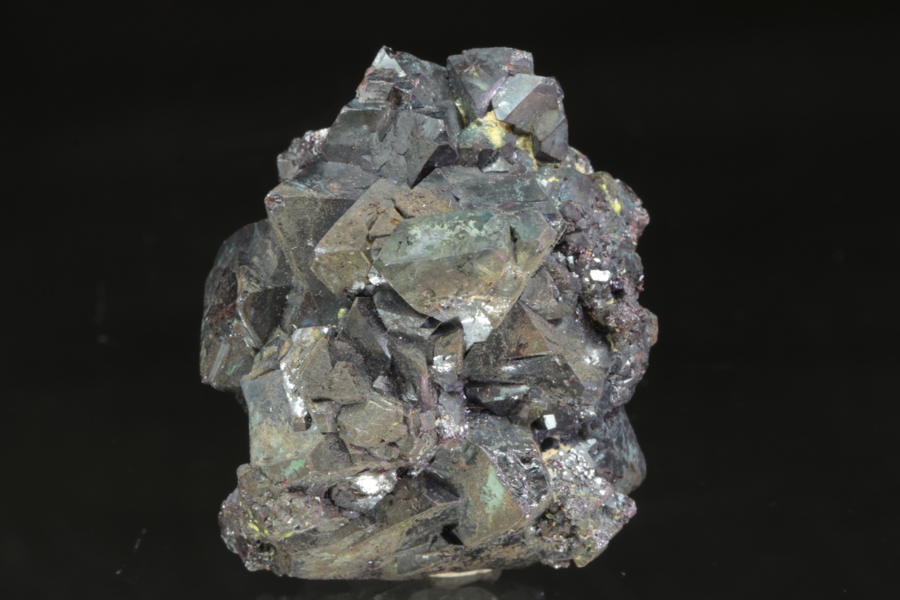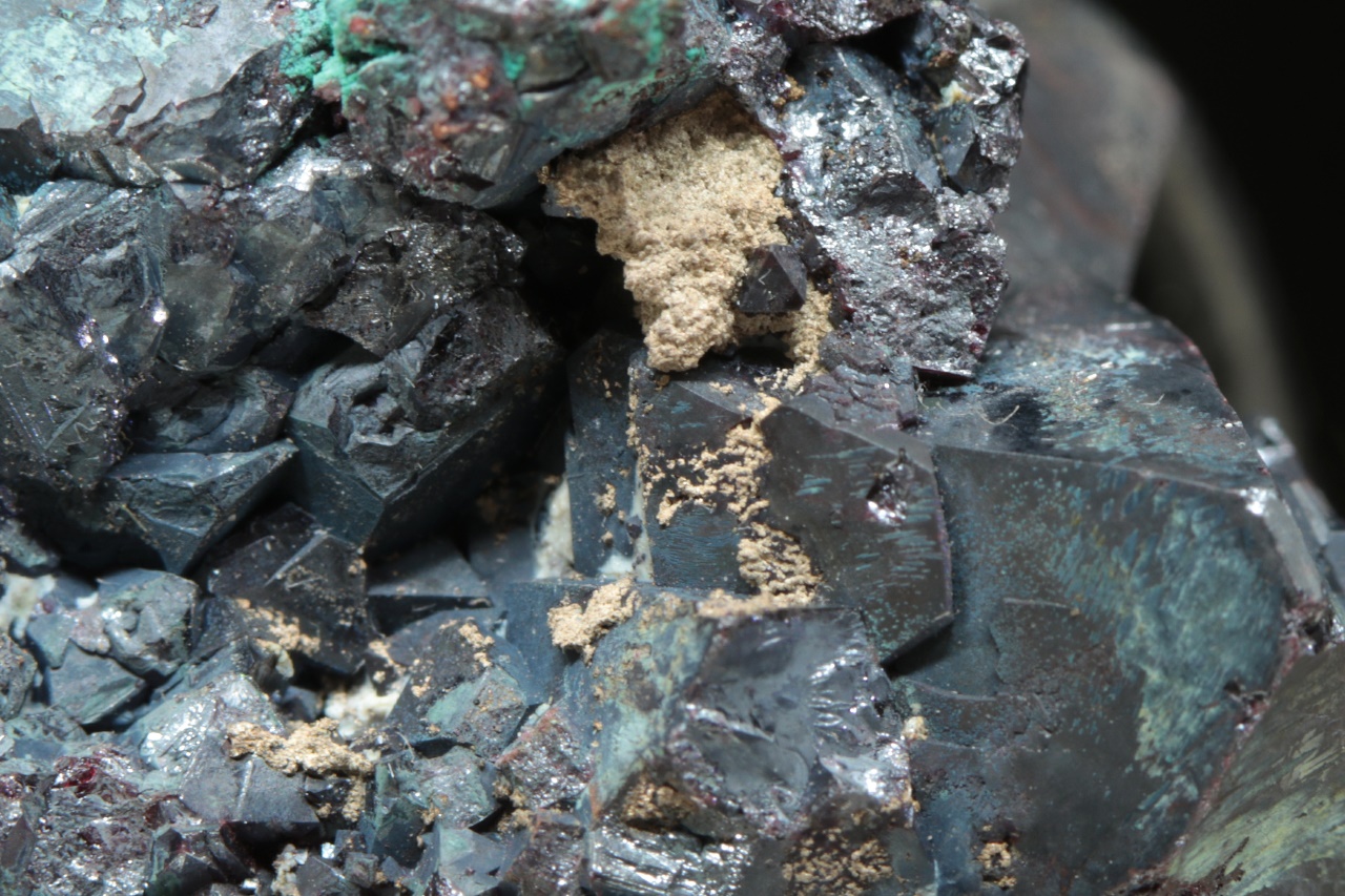 Druse von metallisch glänzenden Oktaedern des Kuprit mit Büschen aus weißem Silber. Auf den Kuprit wachsen gelbe Kristalle des sehr seltenen Kupfer- und Silberjodids – Miersit, das nur an wenigen Weltfundorten beschrieben wurde. Der größgrößte Kupritkristall ist 1 cm groß.