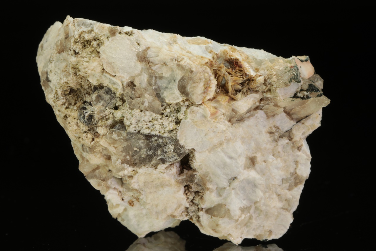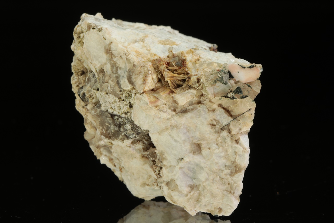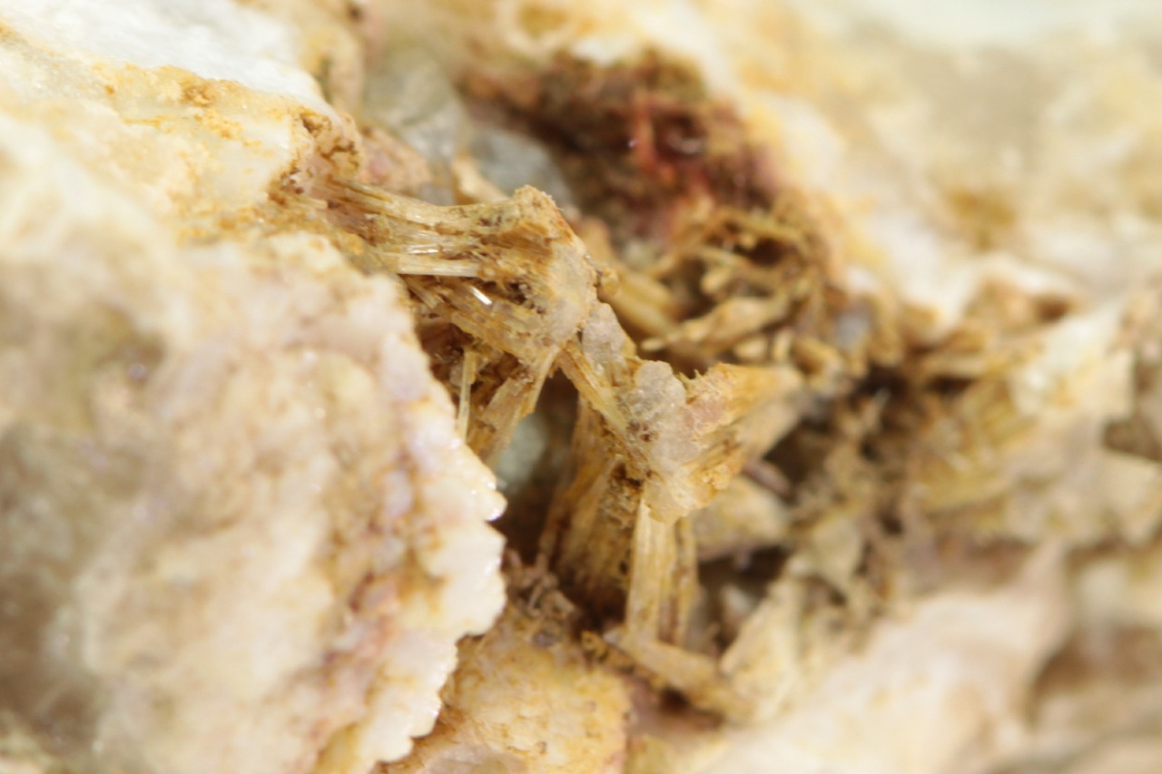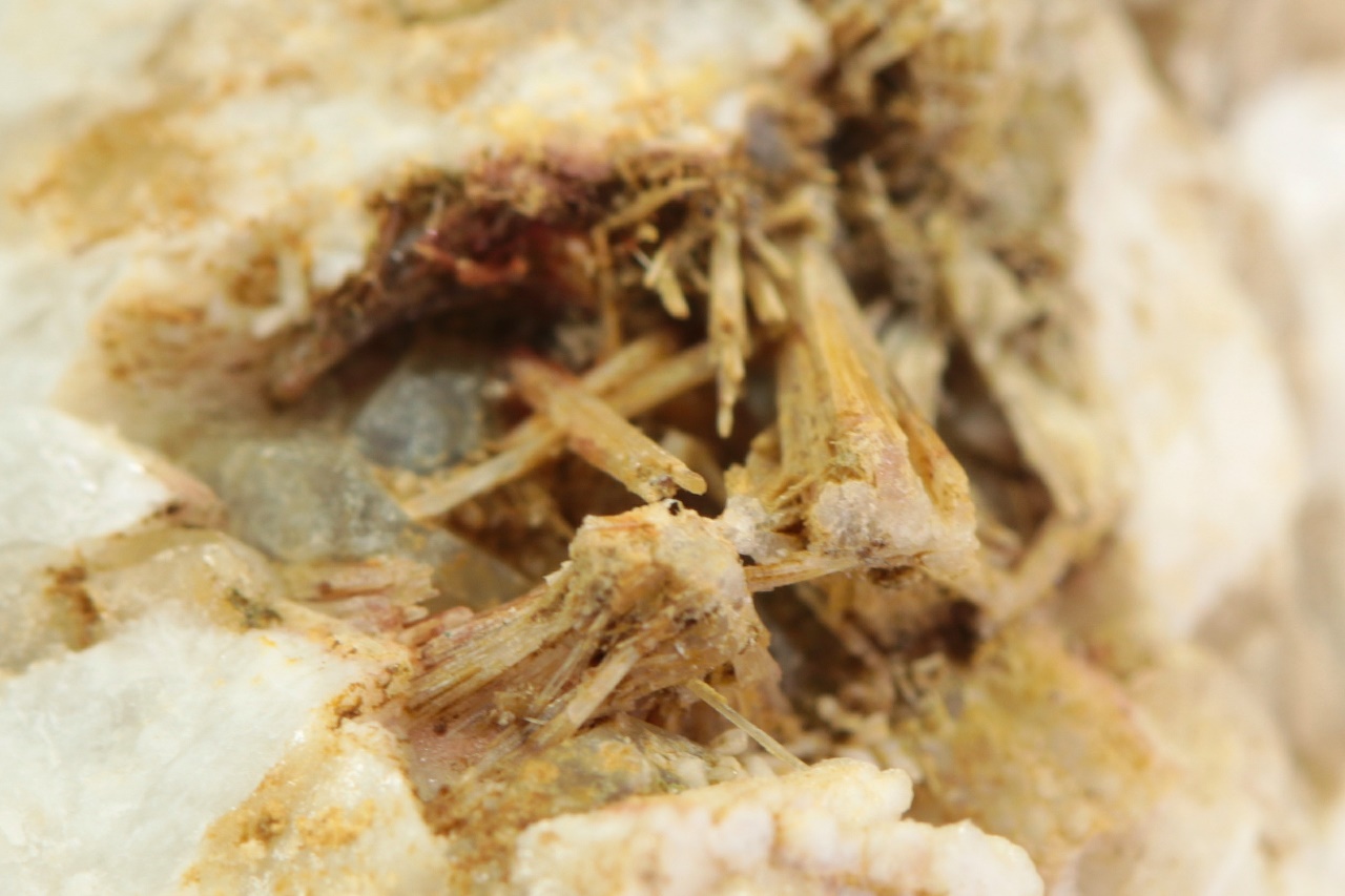 Stängelige Aggregate des seltenen Silikats Beryll im weißen Feldspat. Die größere Höhlung ist 1 cm groß.