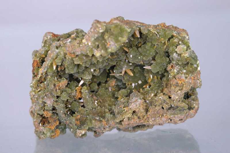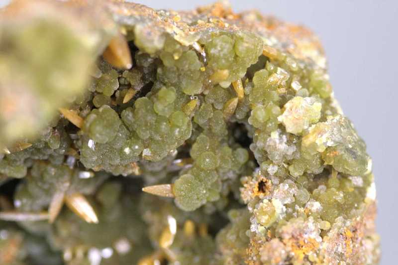 Reichhaltiges Mimetit-Beispiel mit Wulfenit aus dem mexikanischen Mapimi. Sehr hochwertiges Beispiel von schön entwickelten kugelförmigen Mimetit-Aggregaten in Grün, begleitet von klassischen spätkäseförmigen gelb-orangenen Wulfenit-Kristallen .