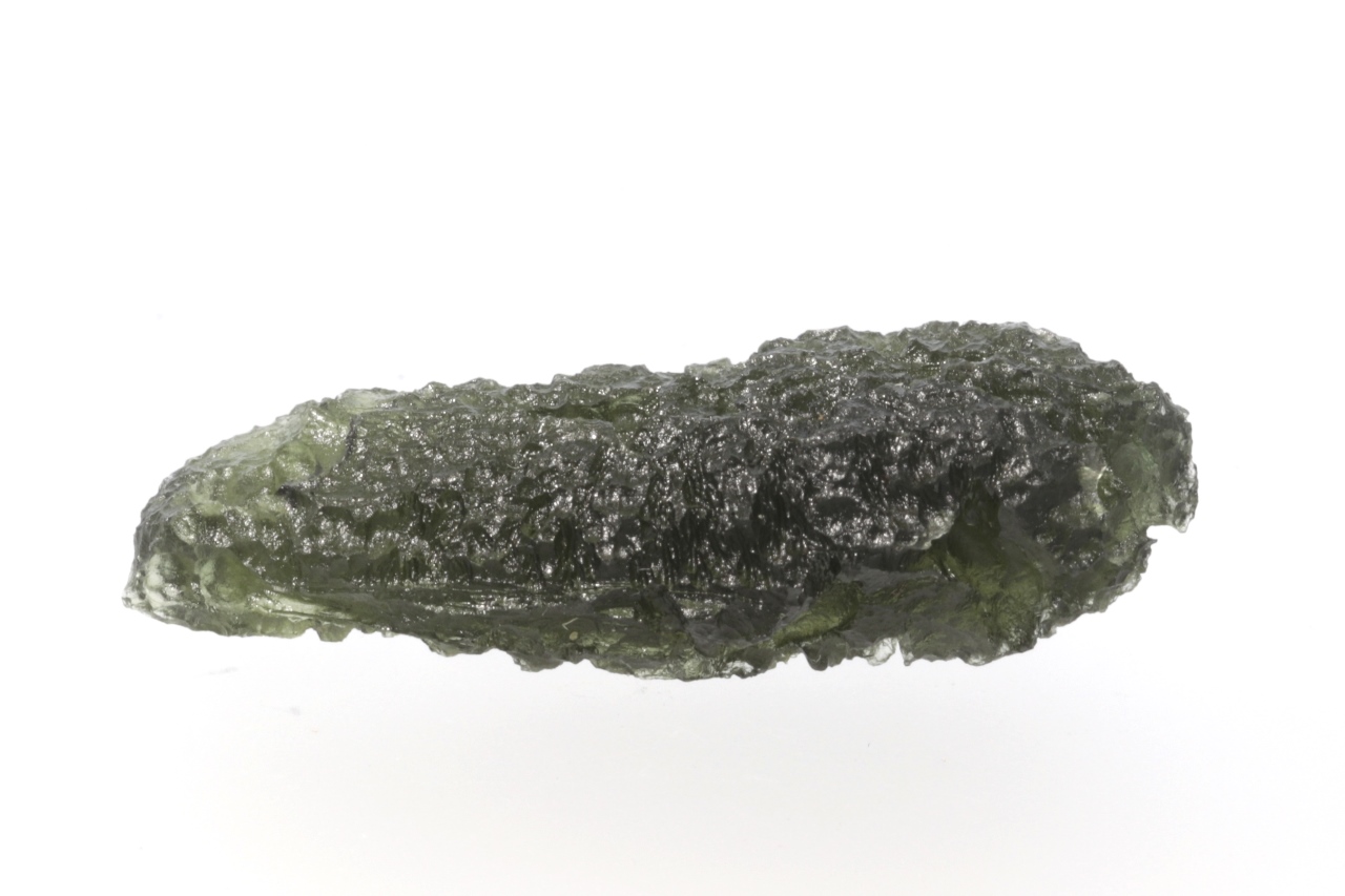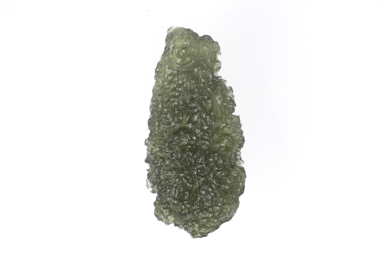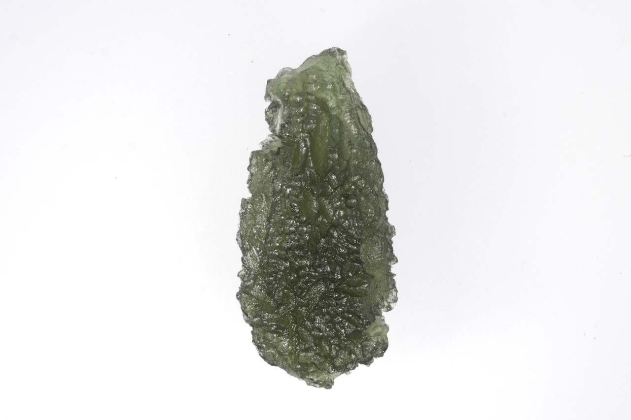 Ästhetischer Moldavit mit ausgeprägter Skulptur. Der Moldavit weist zwei unbedeutende halbmillimetergroße Beschädigungen auf der Innenseite der Vertiefungen der Skulptur auf.