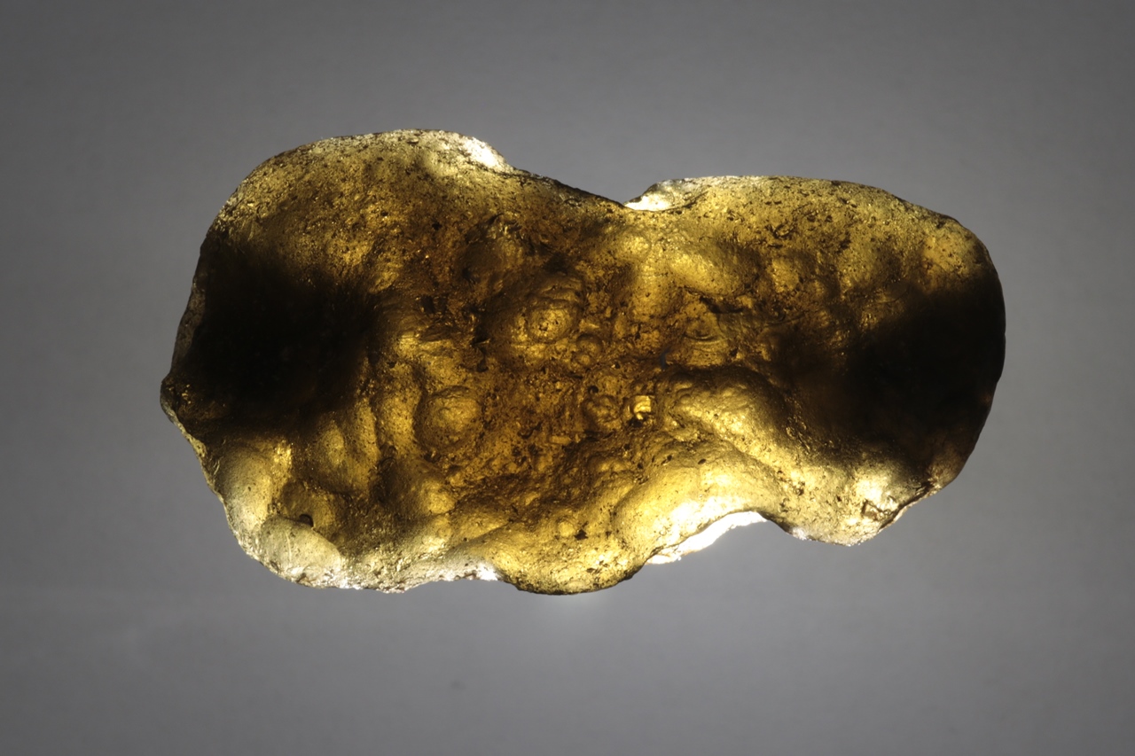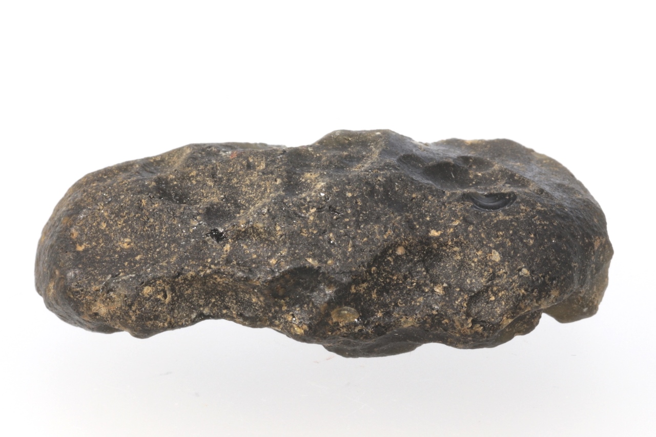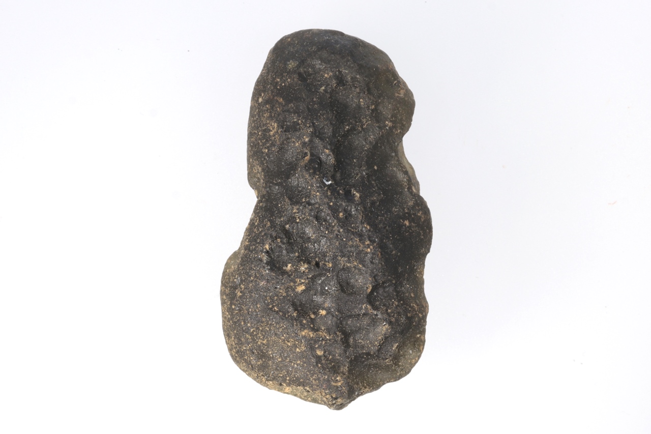 Dunkelbrauner mährischer Moldavit mit ausgeprägterer Skulptur. Der Moldavit stammt aus Feldsammlungen. Auf einer Seite ist er an zwei Stellen beschädigt (ungefähr 5 × 3 und 4 × 2 mm), auf der anderen hat er mehrere kleinere Beschädigungen von etwa 1 mm Größe.