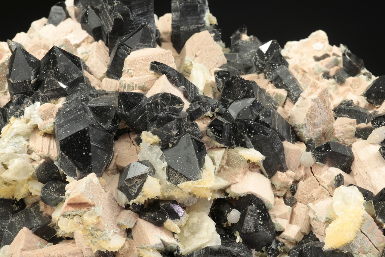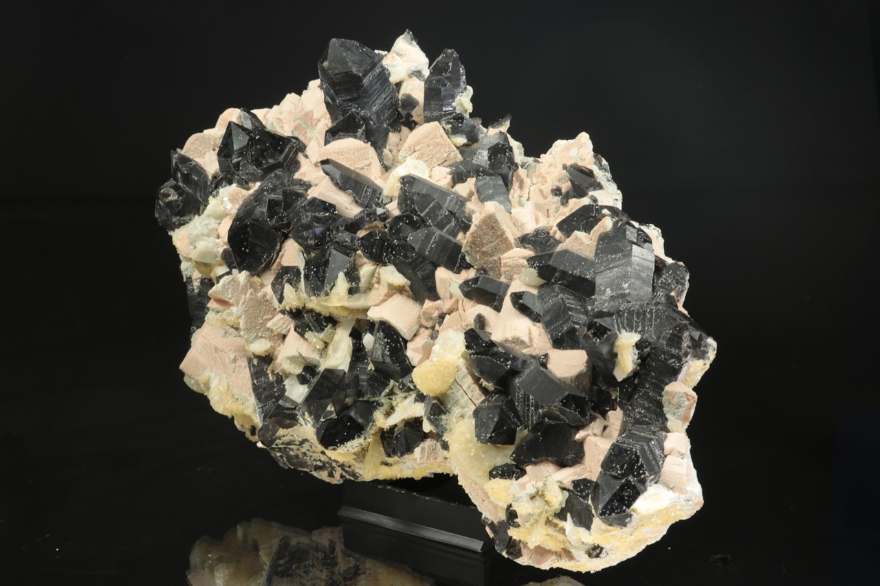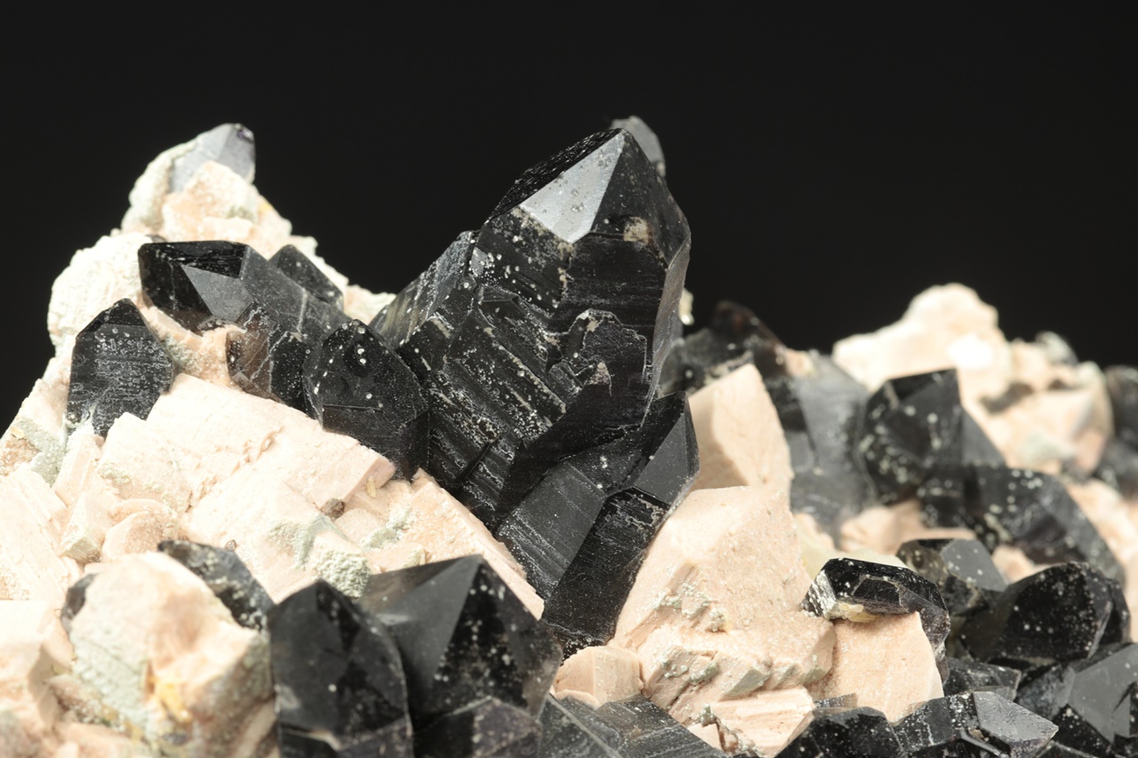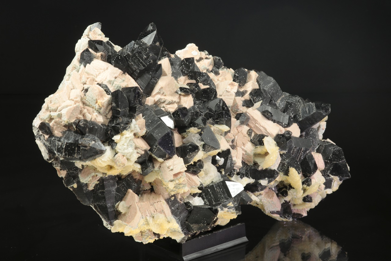 Außergewöhnlich reiche, sehr ästhetische Druse sehr dunkler Rauchquartz-Kristalle, die mit Kristallen des altrosa Orthoklases durchwachsen sind. Auf der Druse wächst stellenweise jüngerer zweigenerationen Kalcit. Der größte Rauchquartz-Kristall ist 4 cm groß.