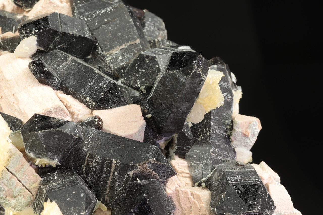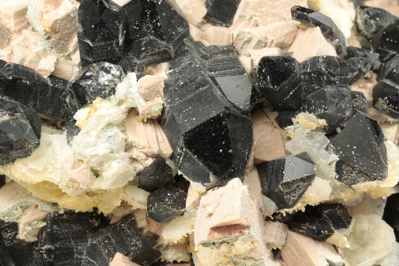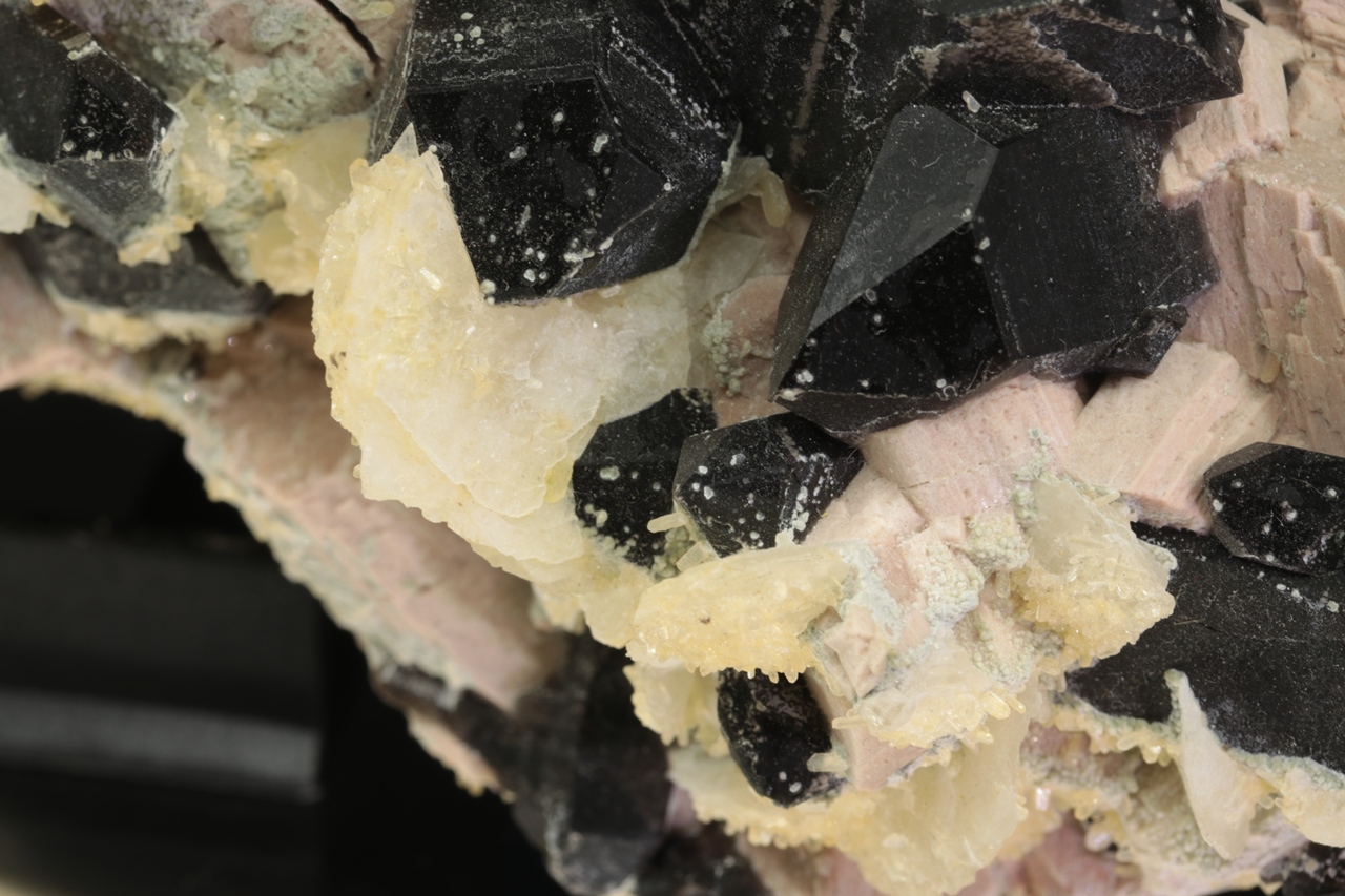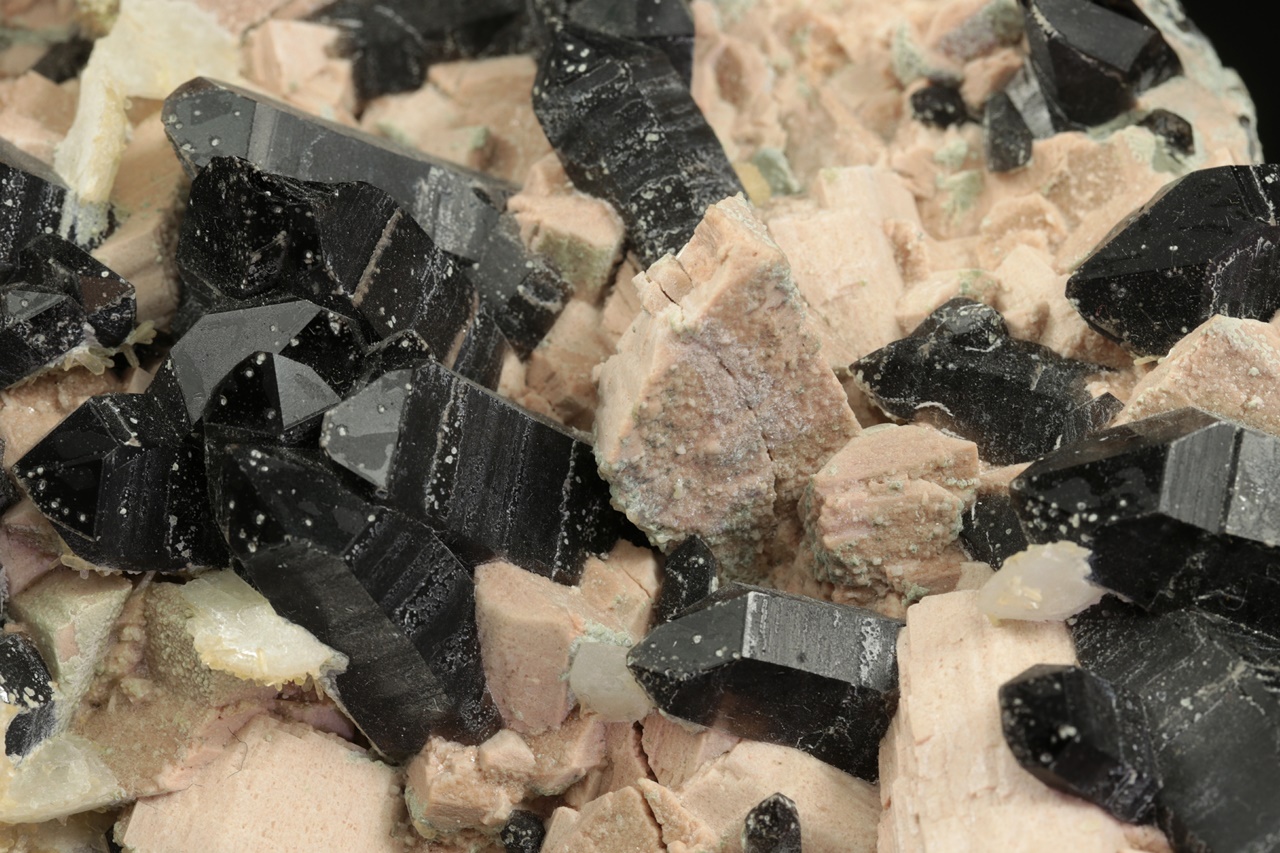 Außergewöhnlich reiche, sehr ästhetische Druse sehr dunkler Rauchquartz-Kristalle, die mit Kristallen des altrosa Orthoklases durchwachsen sind. Auf der Druse wächst stellenweise jüngerer zweigenerationen Kalcit. Der größte Rauchquartz-Kristall ist 4 cm groß.