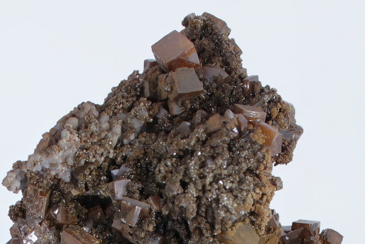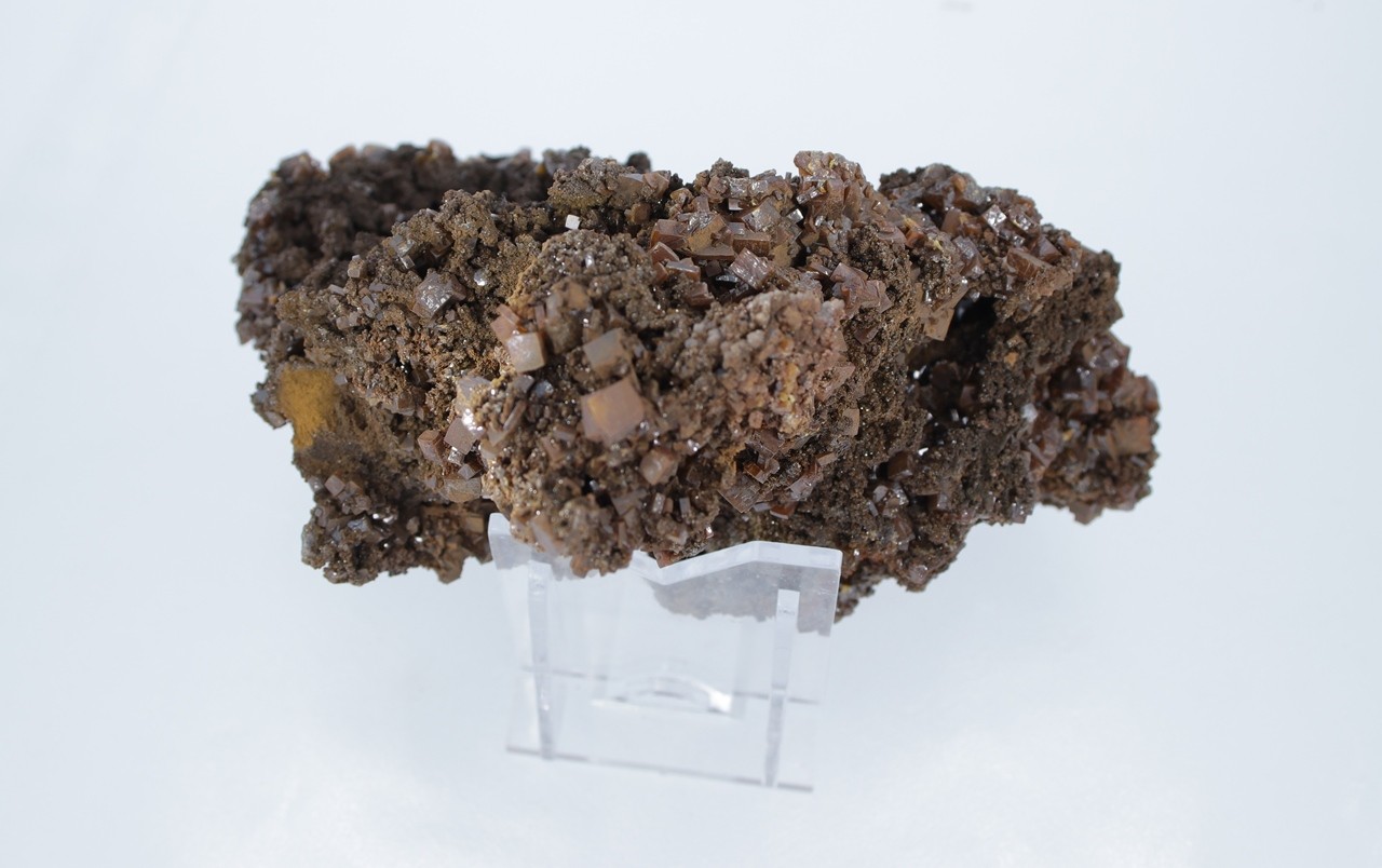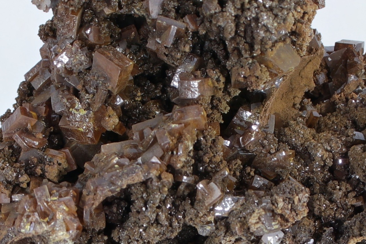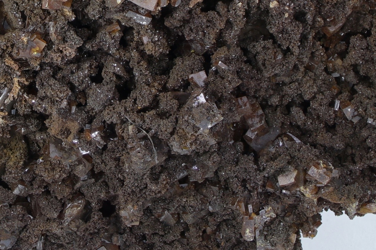 Probe besteht aus kristallinem, glänzendem, dunkelbraunem Mottramit, der mit glänzenden, karamellfarbenen Wulfenit-Plättchen bewachsen ist.