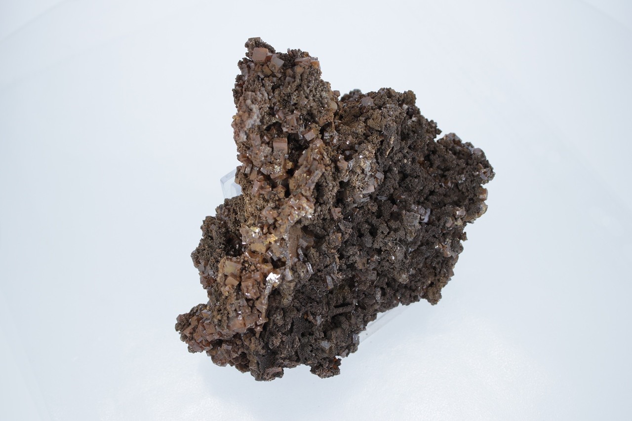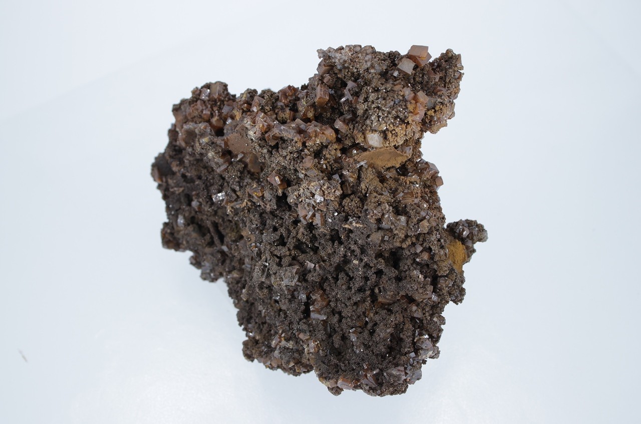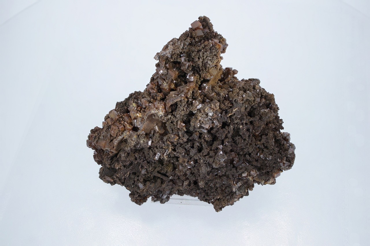 Probe besteht aus kristallinem, glänzendem, dunkelbraunem Mottramit, der mit glänzenden, karamellfarbenen Wulfenit-Plättchen bewachsen ist.
