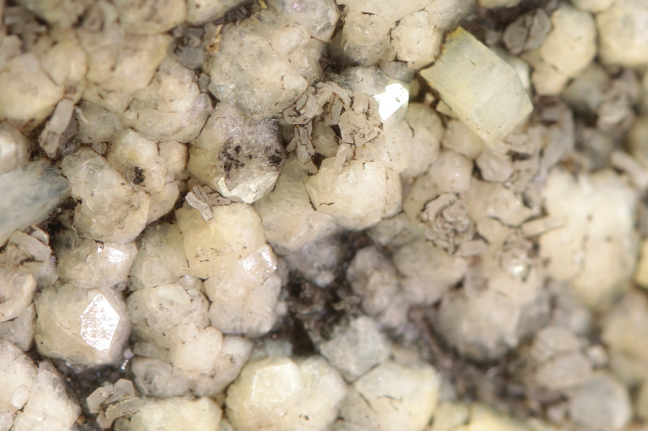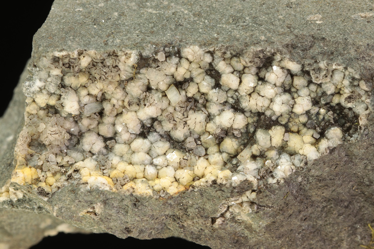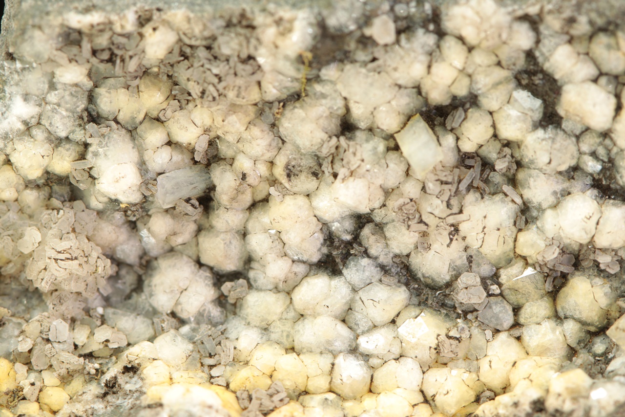 Weiße isometrische Kristalle von Analcim mit etwa 3 mm großen Säulchen von Natrolit und tabellarischen Kristallen von Calcit.