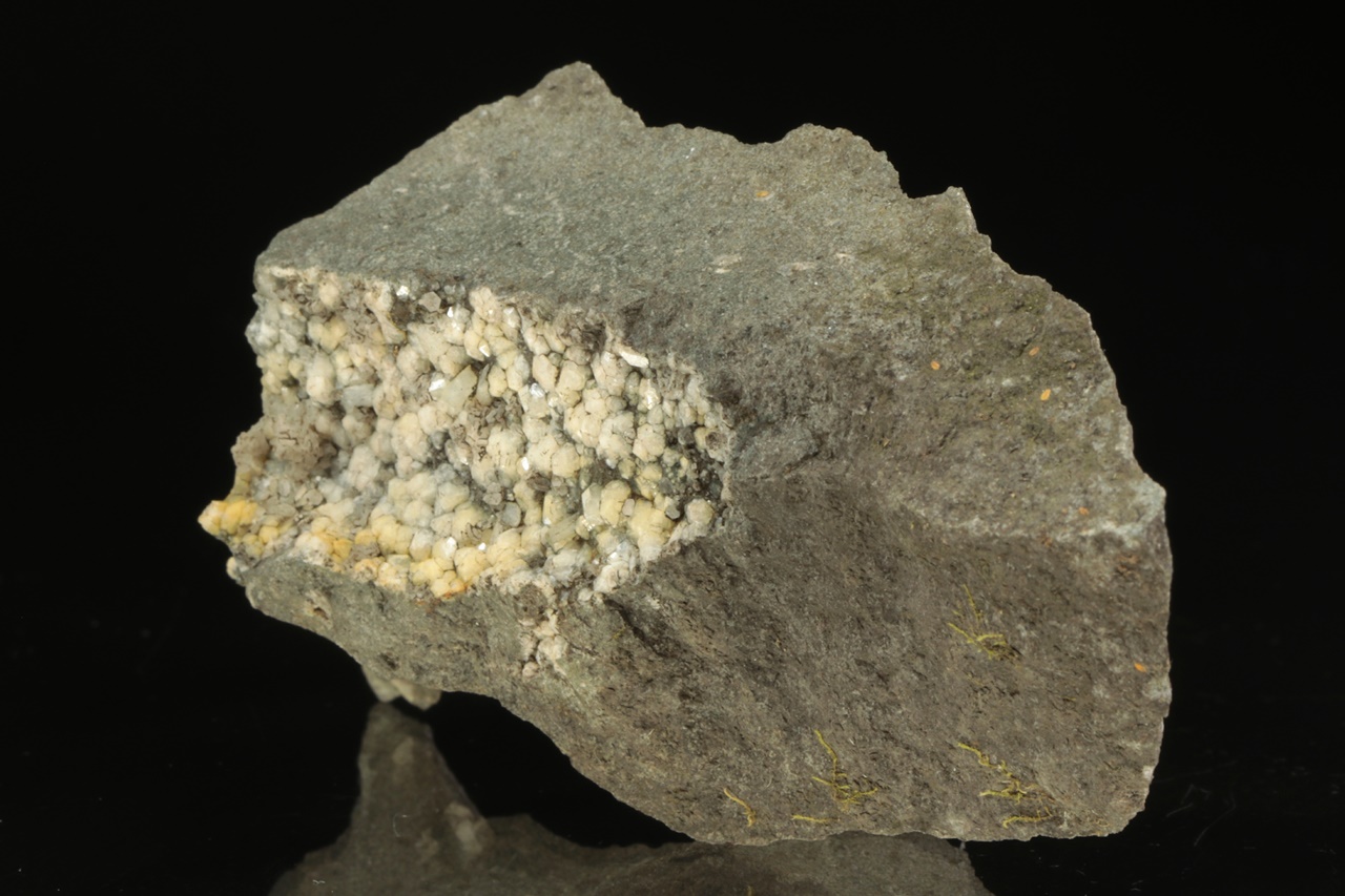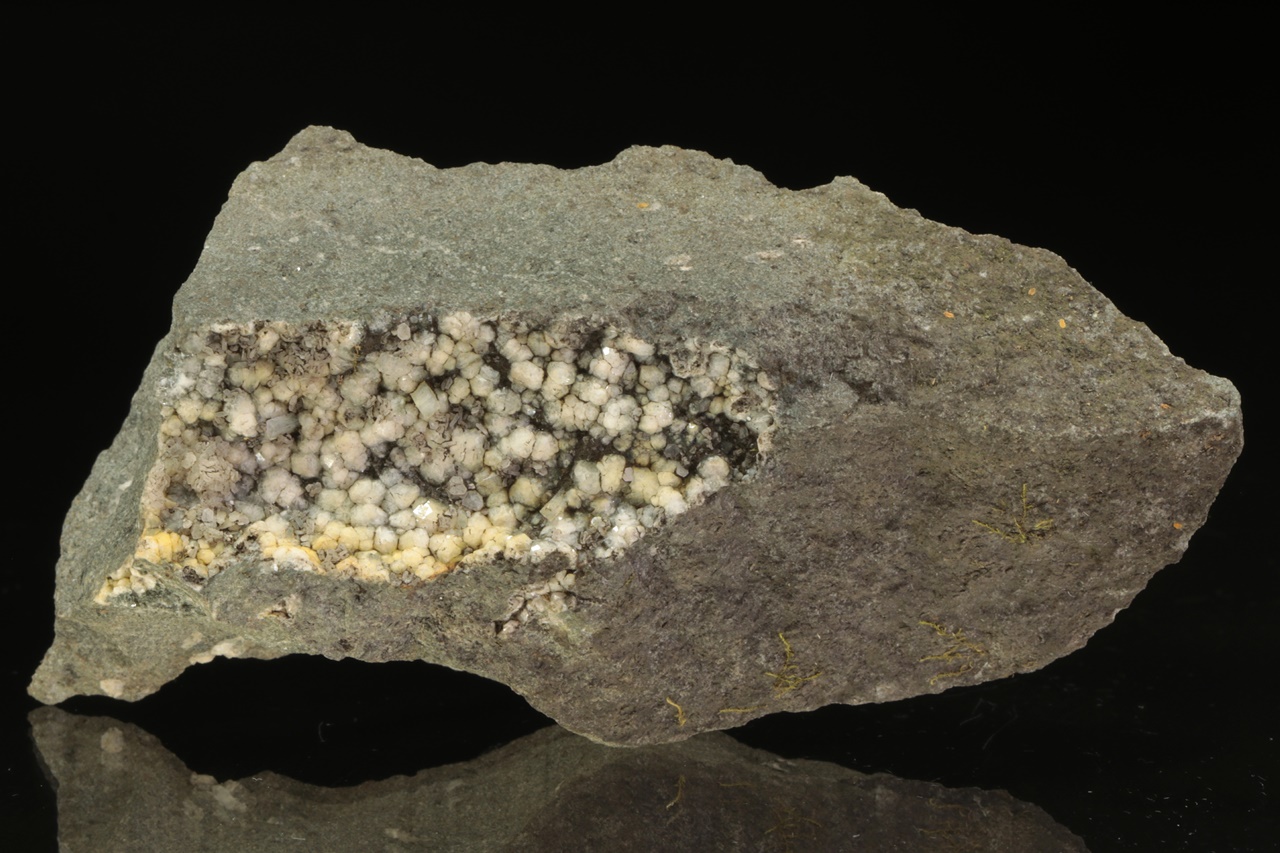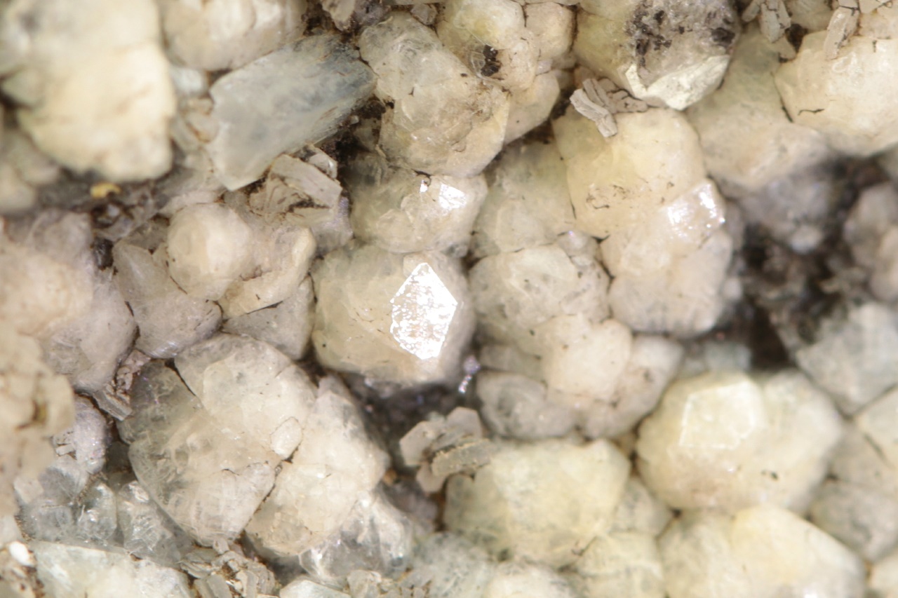 Weiße isometrische Kristalle von Analcim mit etwa 3 mm großen Säulchen von Natrolit und tabellarischen Kristallen von Calcit.