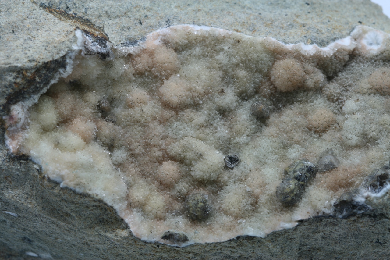 Kugelförmige Aggregate von beigem Natrolit mit braunem Kalcit. Die Aggregate beider Minerale sind etwa 5 mm groß.