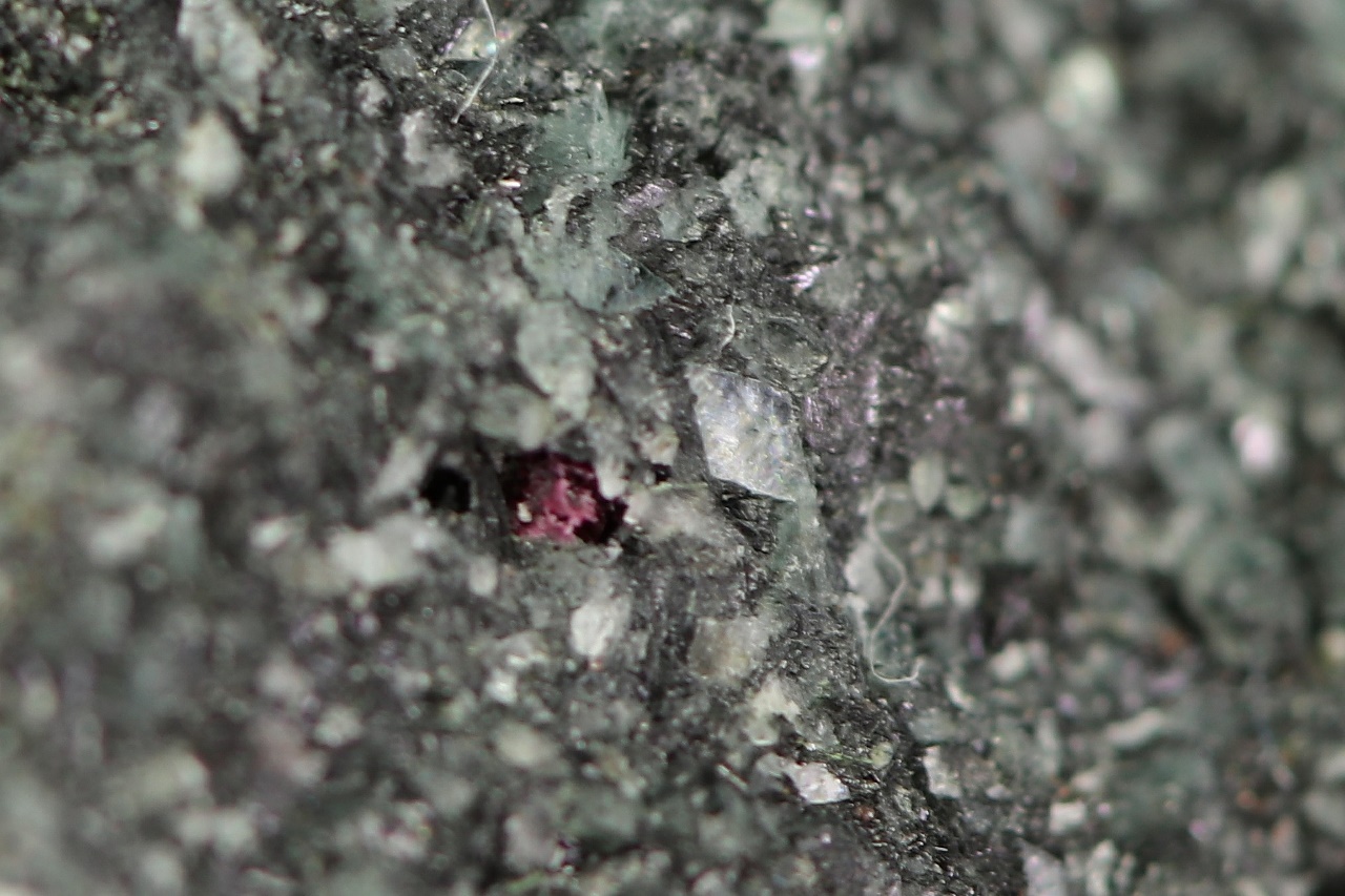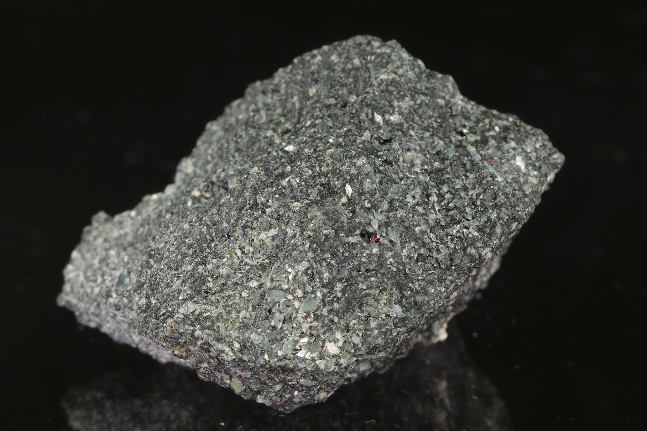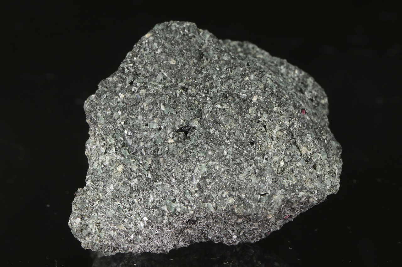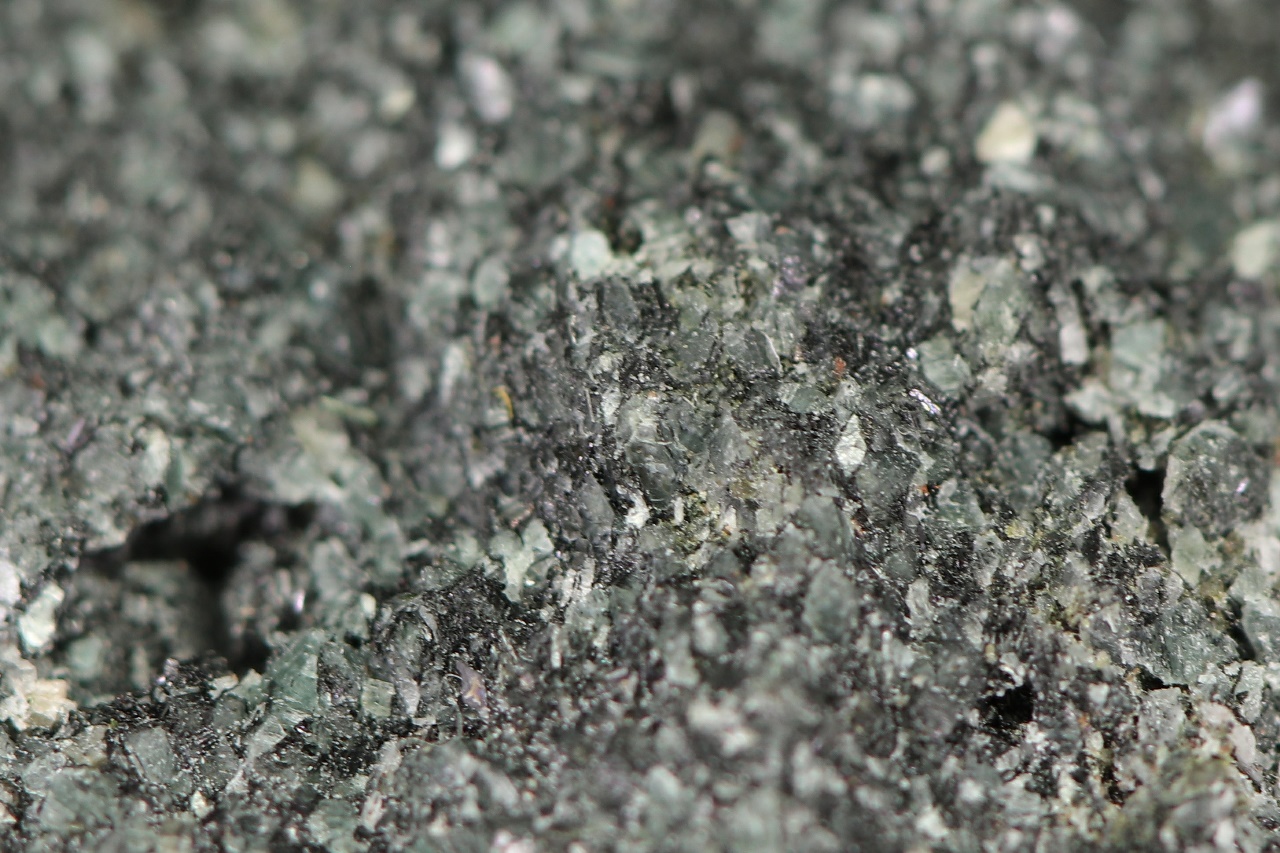 Probe eines Gesteins voller kleiner, hellgrüner Kristalle des seltenen Naujakasitu, eines Minerals, das nur an wenigen Orten auf der Welt vorkommt.