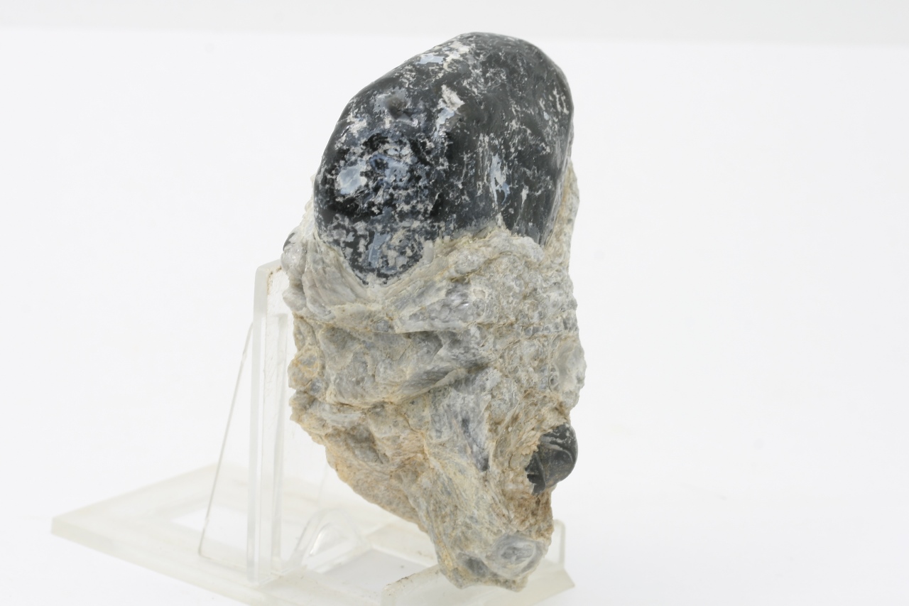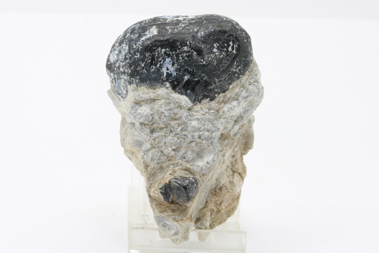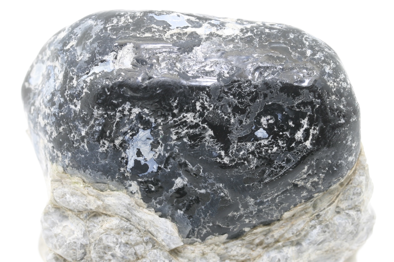 Ansprechende Probe von schwarzem kugelförmigem Obsidian mit dem lokalen Namen „Apache-Tränen“.