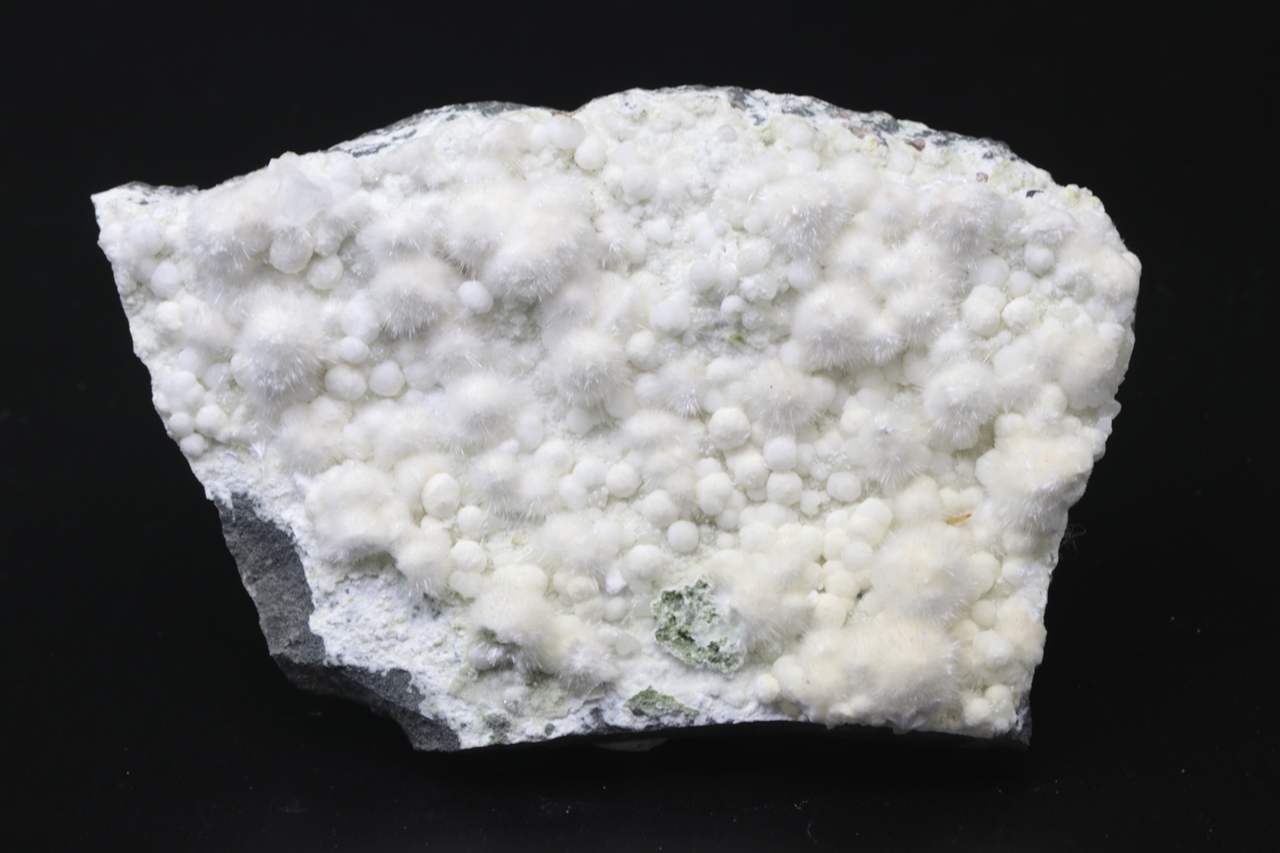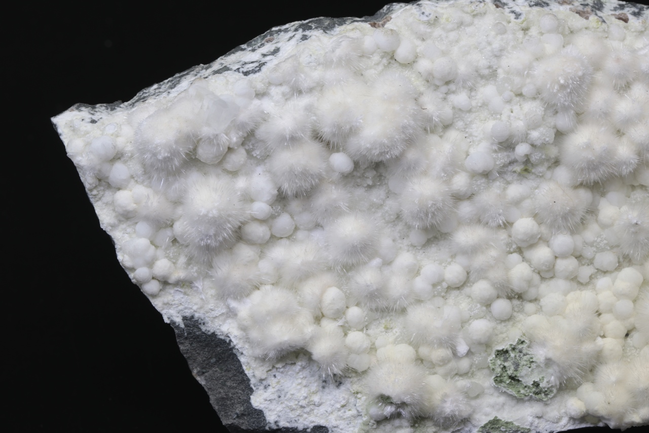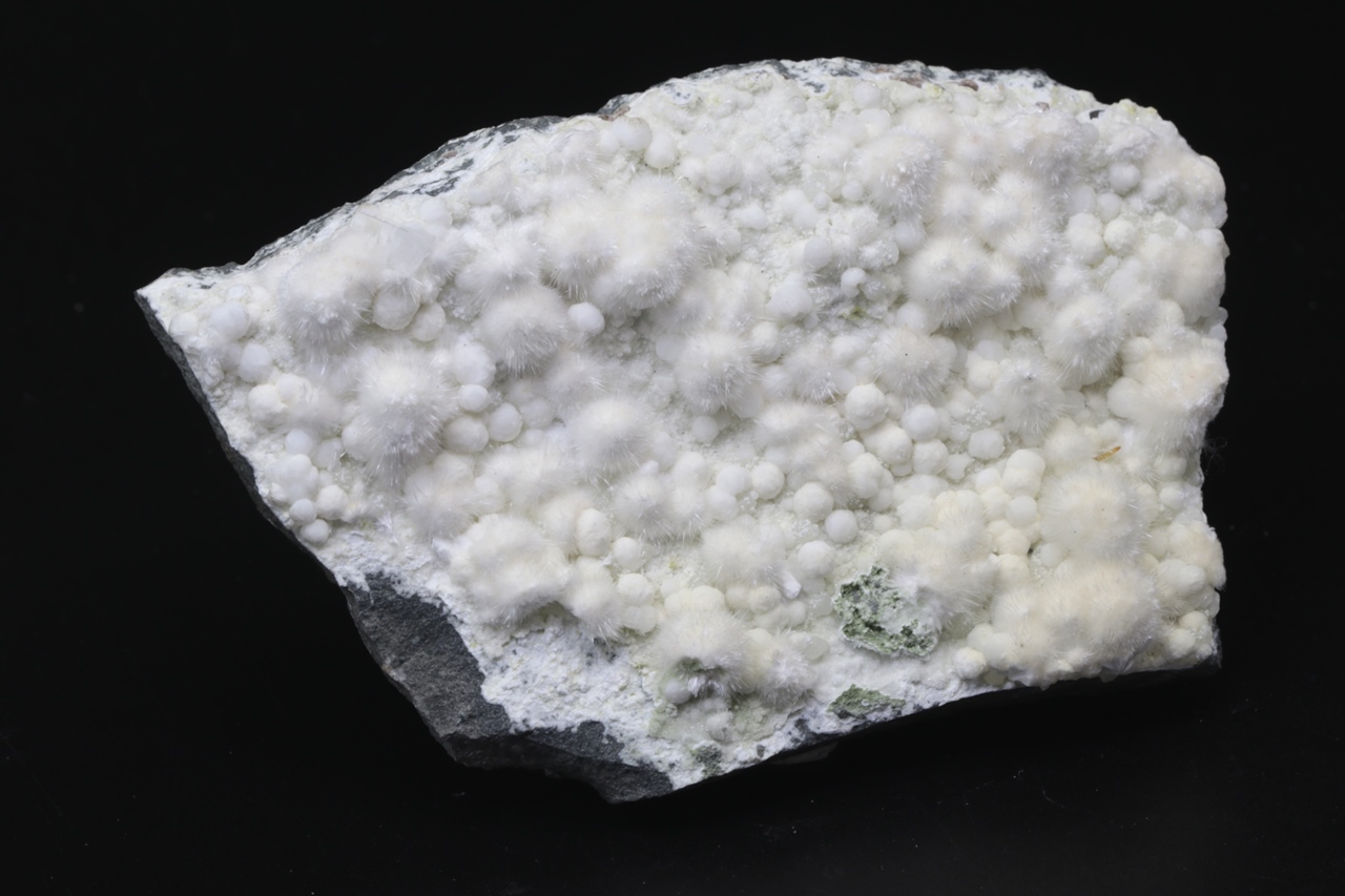 Okenit im Muster bildet seidig-weiße kugelförmige Aggregate, die bis zu 1 cm groß werden und auf dunkles Grundgestein wachsen. Aufgrund der Kombination aus weißer und grauer Farbe ist das gesamte Muster sehr ästhetisch. Es handelt sich auch um ein sehr reichhaltiges Muster, bei dem einzelne kugelförmige Aggregate gegenseitig aufeinander wachsen und verschiedene Größen erreichen. Diese Probe stammt von der weltbekannten Zeolith-Fundstelle Poona, Indien. Die Stufe ist unbeschädigt .