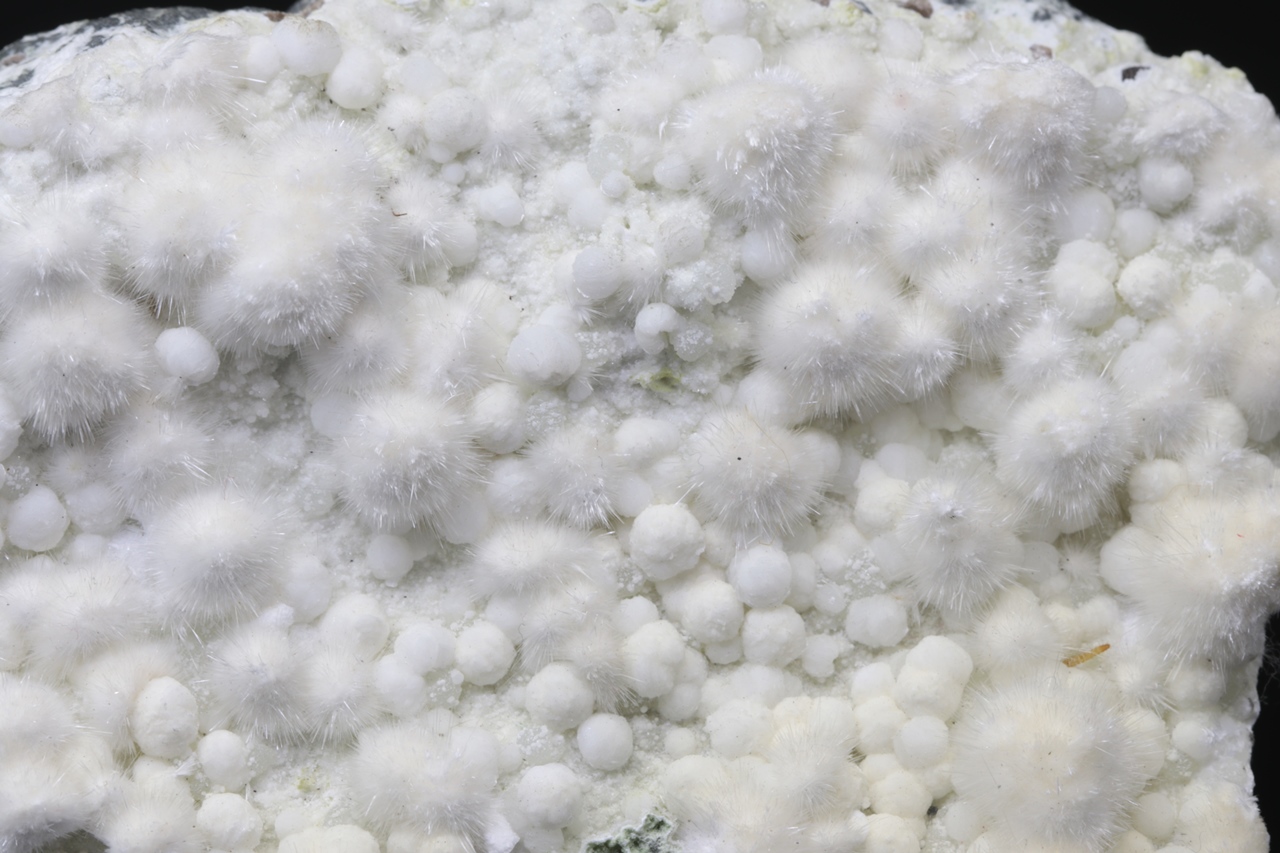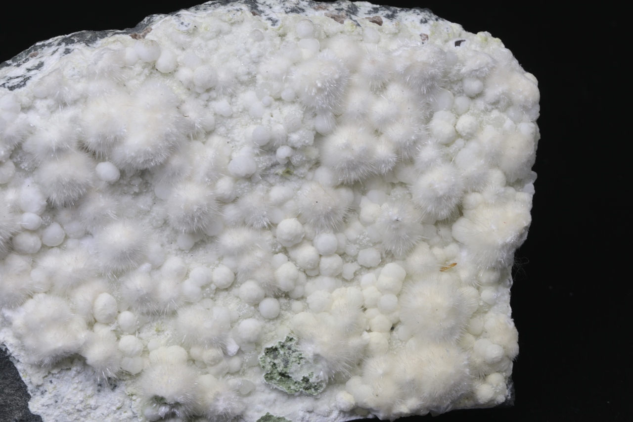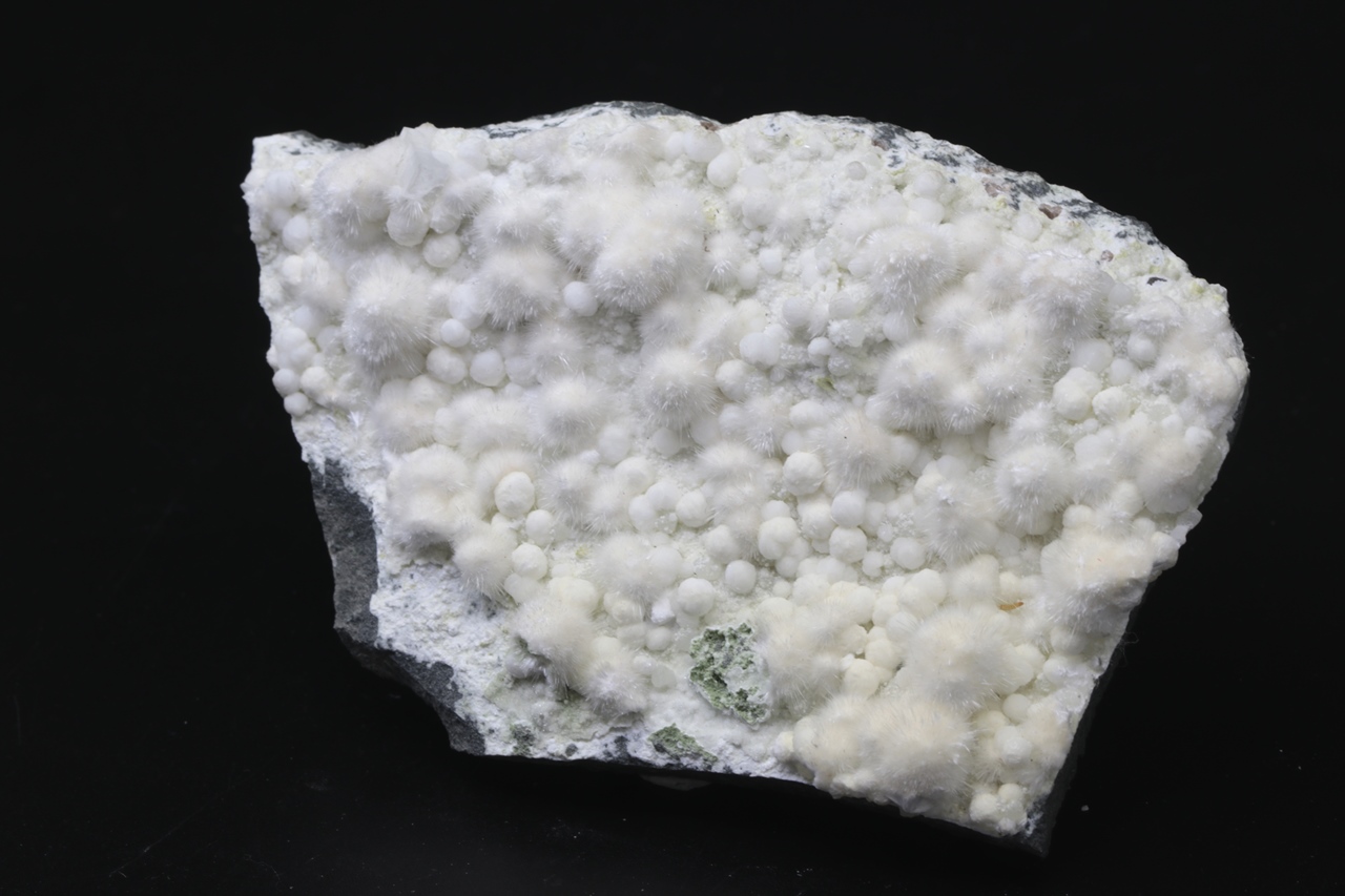 Okenit im Muster bildet seidig-weiße kugelförmige Aggregate, die bis zu 1 cm groß werden und auf dunkles Grundgestein wachsen. Aufgrund der Kombination aus weißer und grauer Farbe ist das gesamte Muster sehr ästhetisch. Es handelt sich auch um ein sehr reichhaltiges Muster, bei dem einzelne kugelförmige Aggregate gegenseitig aufeinander wachsen und verschiedene Größen erreichen. Diese Probe stammt von der weltbekannten Zeolith-Fundstelle Poona, Indien. Die Stufe ist unbeschädigt .