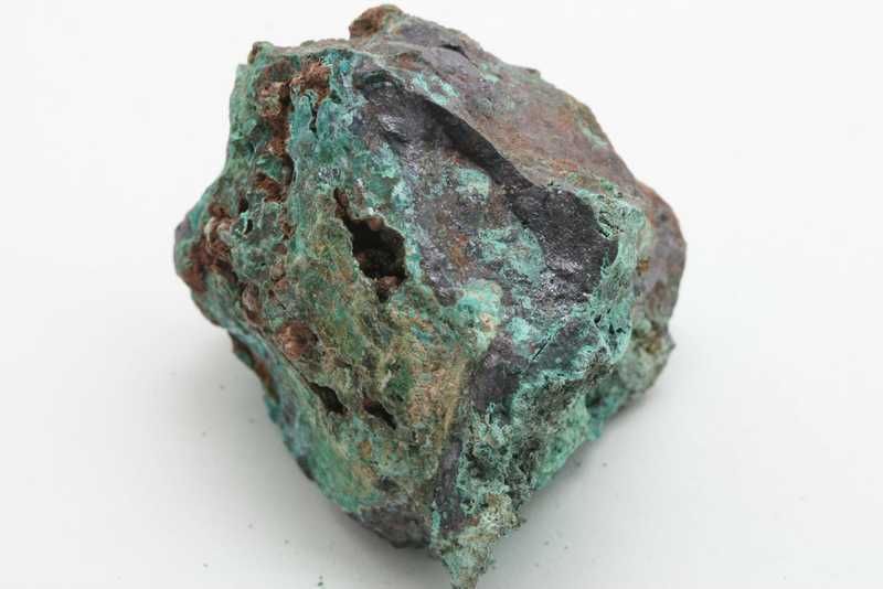 Interessantes Exemplar von Kuprit mit Olivin aus Běloves bei Náchod. Eine schöne Probe einer nicht großen „Kern“ bestehend aus Kuprit, in dessen Hohlräumen sich grüne Kupfersekundärminerale befinden, einschließlich der nicht sehr häufigen leuchtend grünen Aggregate von Olivin .