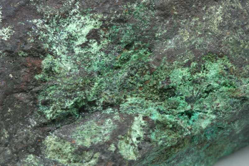 Probe eines nicht sehr gebräuchlichen Kupferarsenats von Olivenit und Kuprit. Probe von dunkelgrünen Aggregaten und Beschichtungen von Olivenit aus Běloves bei Náchod, Tschechische Republik.
