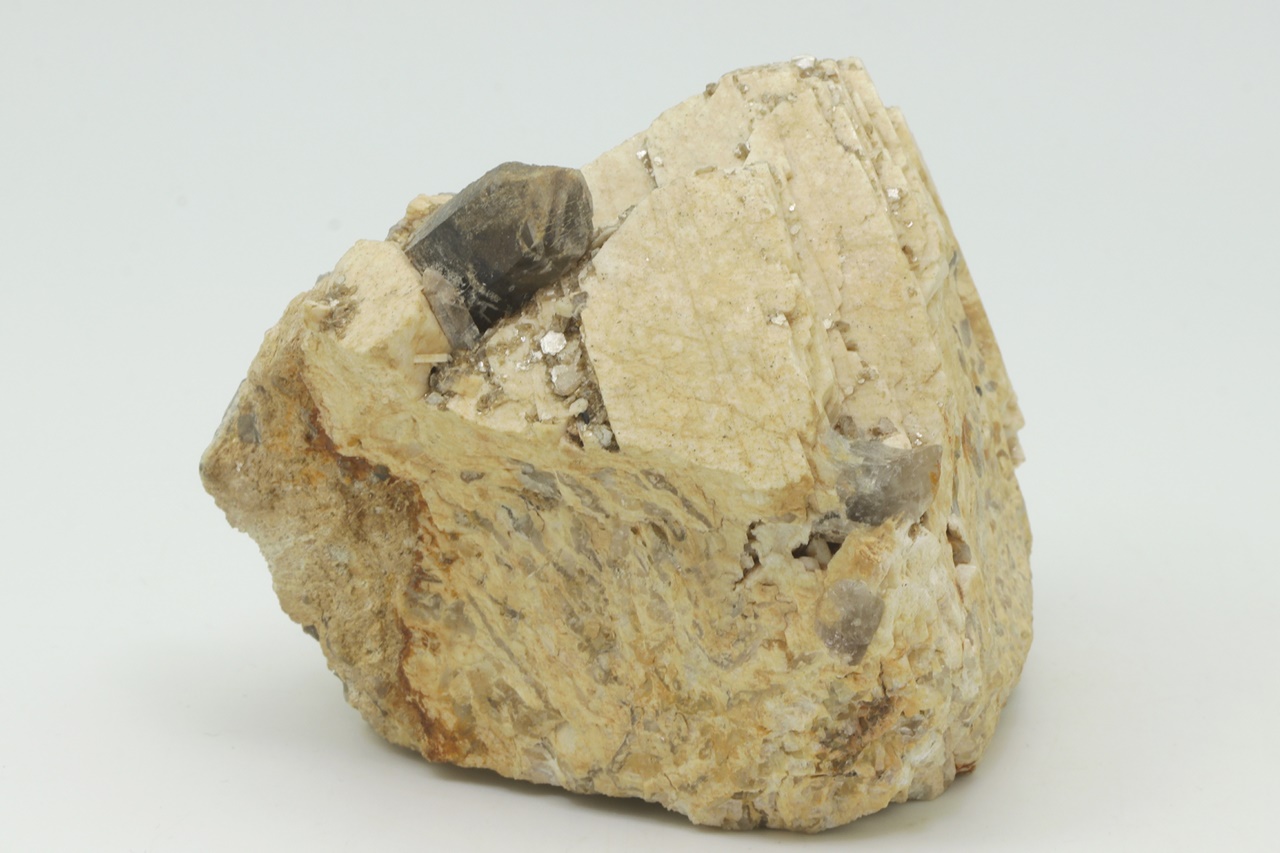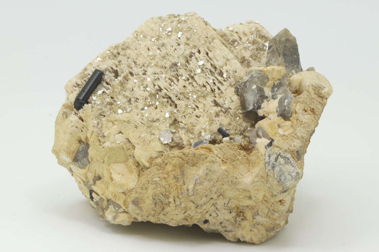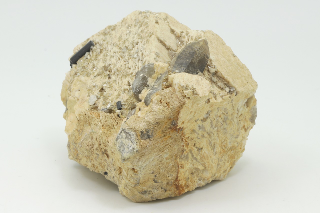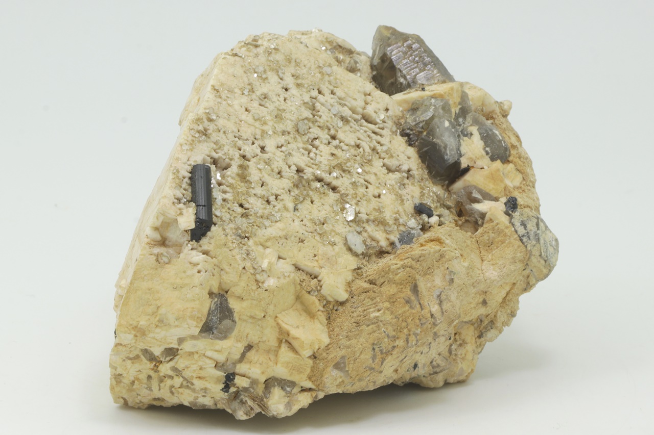 Große Orthoklas-Kristalle mit einem Rauchquarz- und einem schwarzen Turmalin-Kristall. Die Größe des Rauchquarz-Kristalls beträgt 2,5 cm, der Turmalin ist 1,5 cm groß. Im unteren Teil ist der Orthoklas verwachsen mit einem Quarz in einem pimenkovitähnlichen Muster.