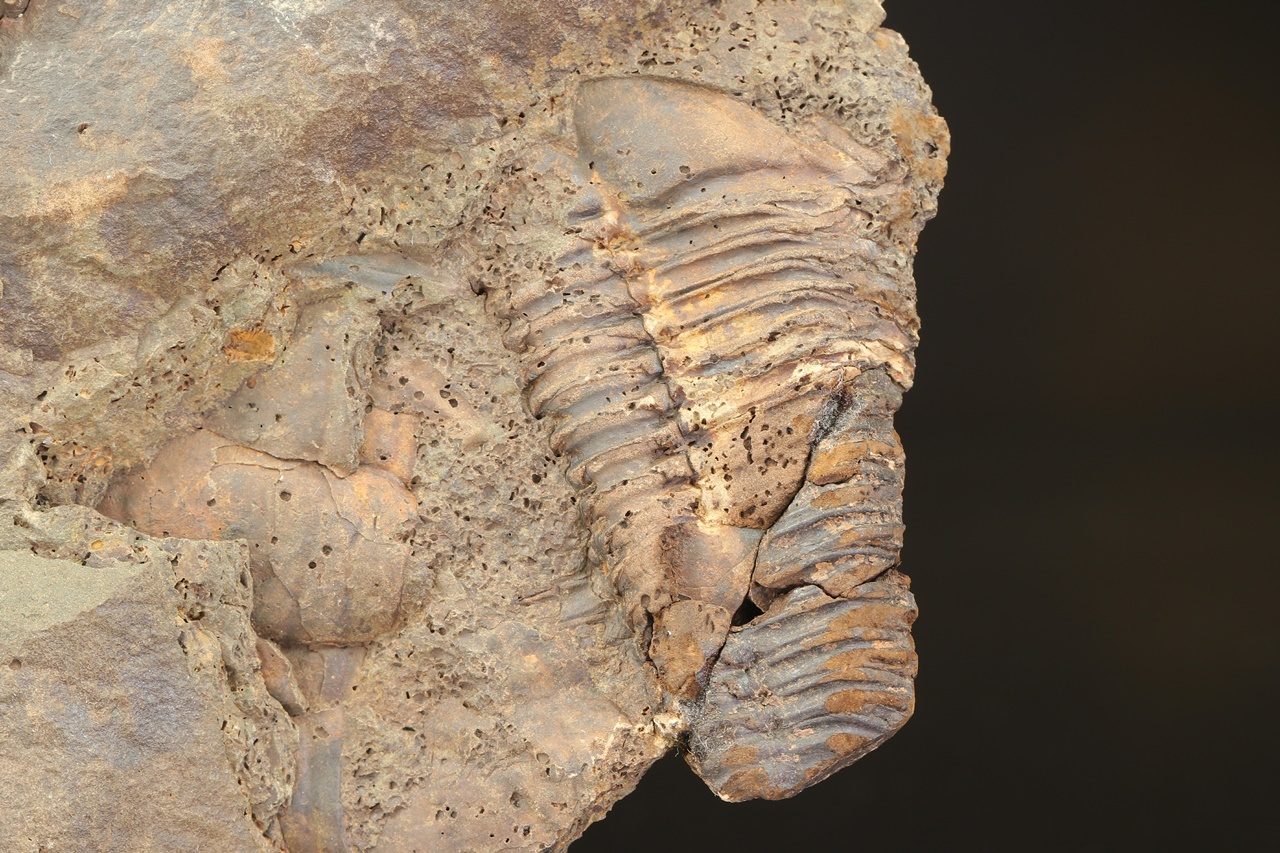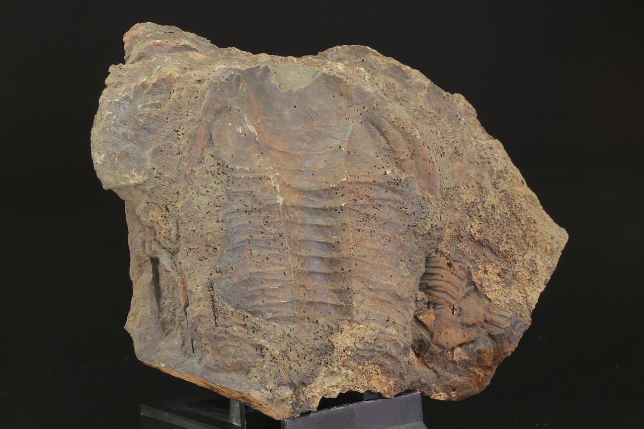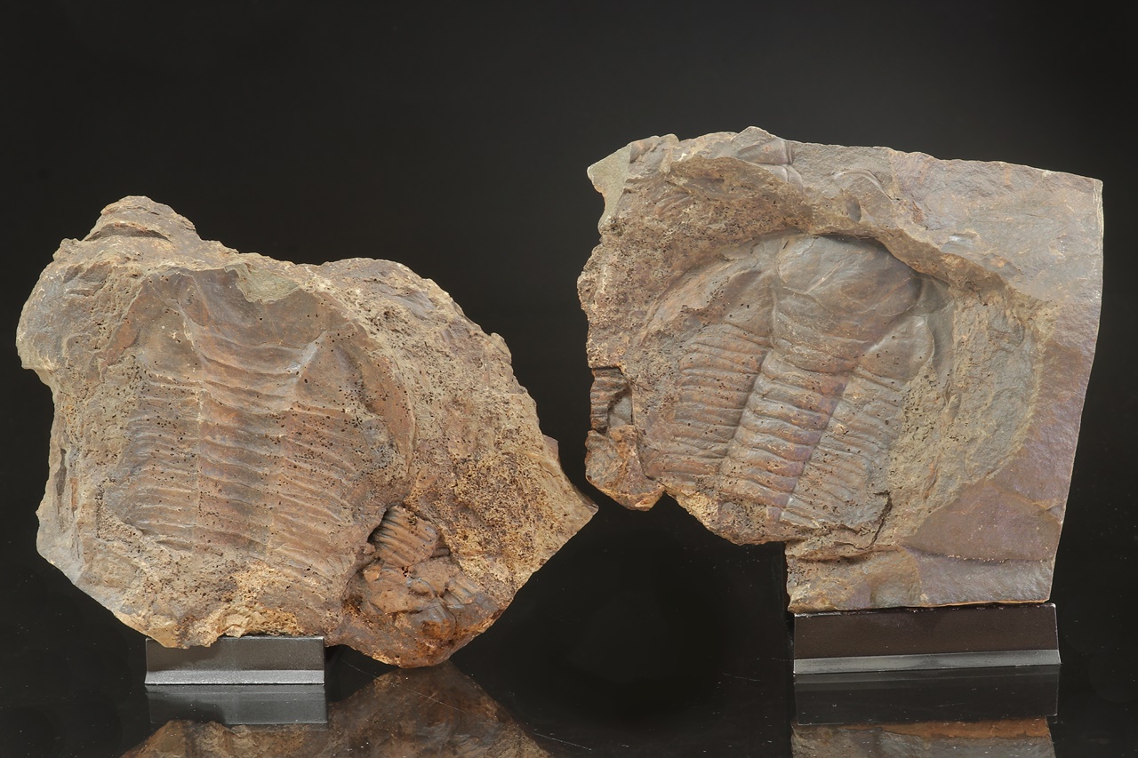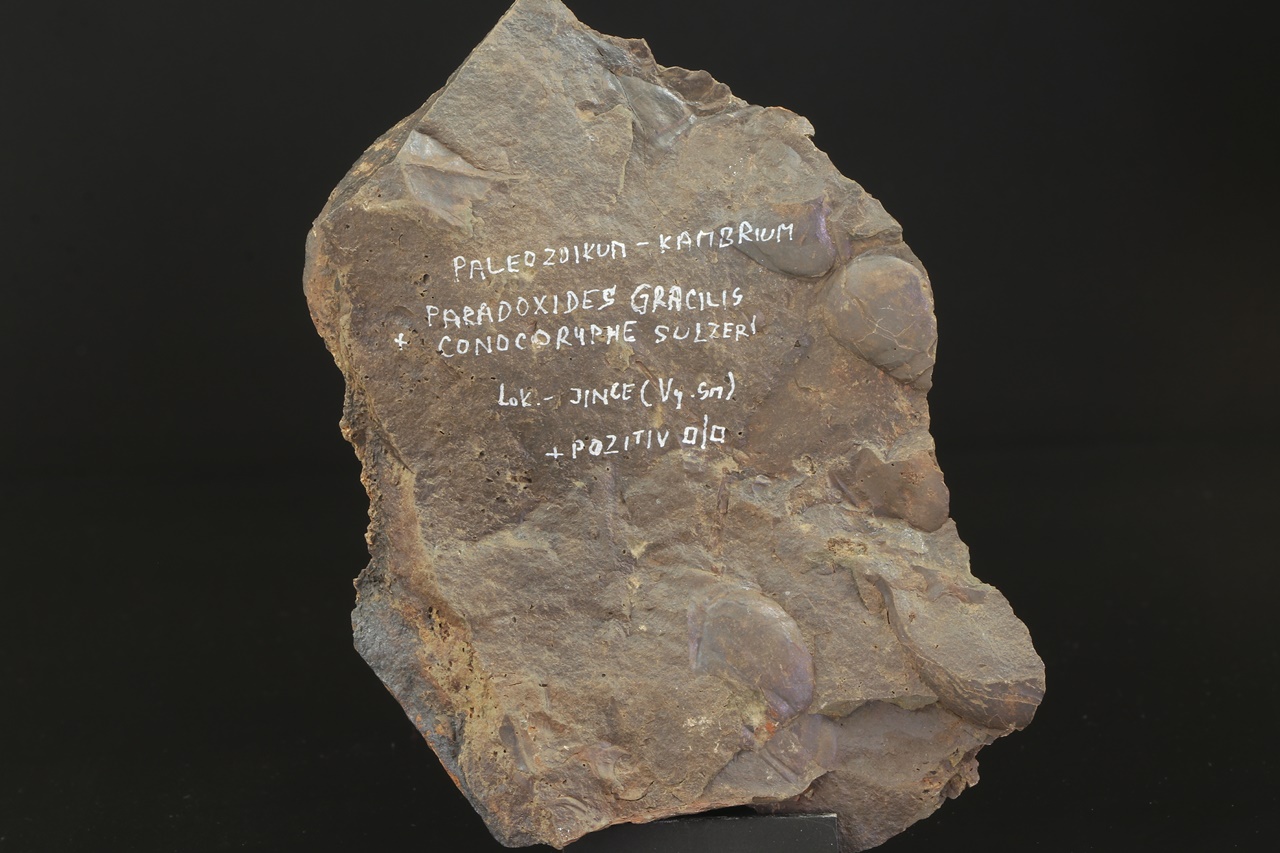 Unvollständiger kambrianischer Trilobit der Art Paradoxides gracilis (Positiv + Negativ) mit den Maßen 7 × 7 cm mit fast vollständigem Trilobiten der Art Conocoryphe sulzeri auf der gegenüberliegenden Seite des Positivs (Größe des Trilobiten ist 5,5 cm).
