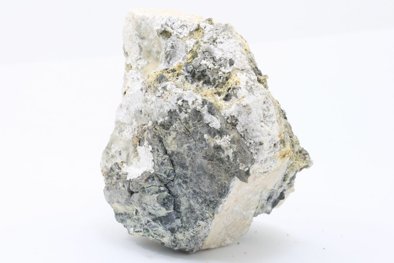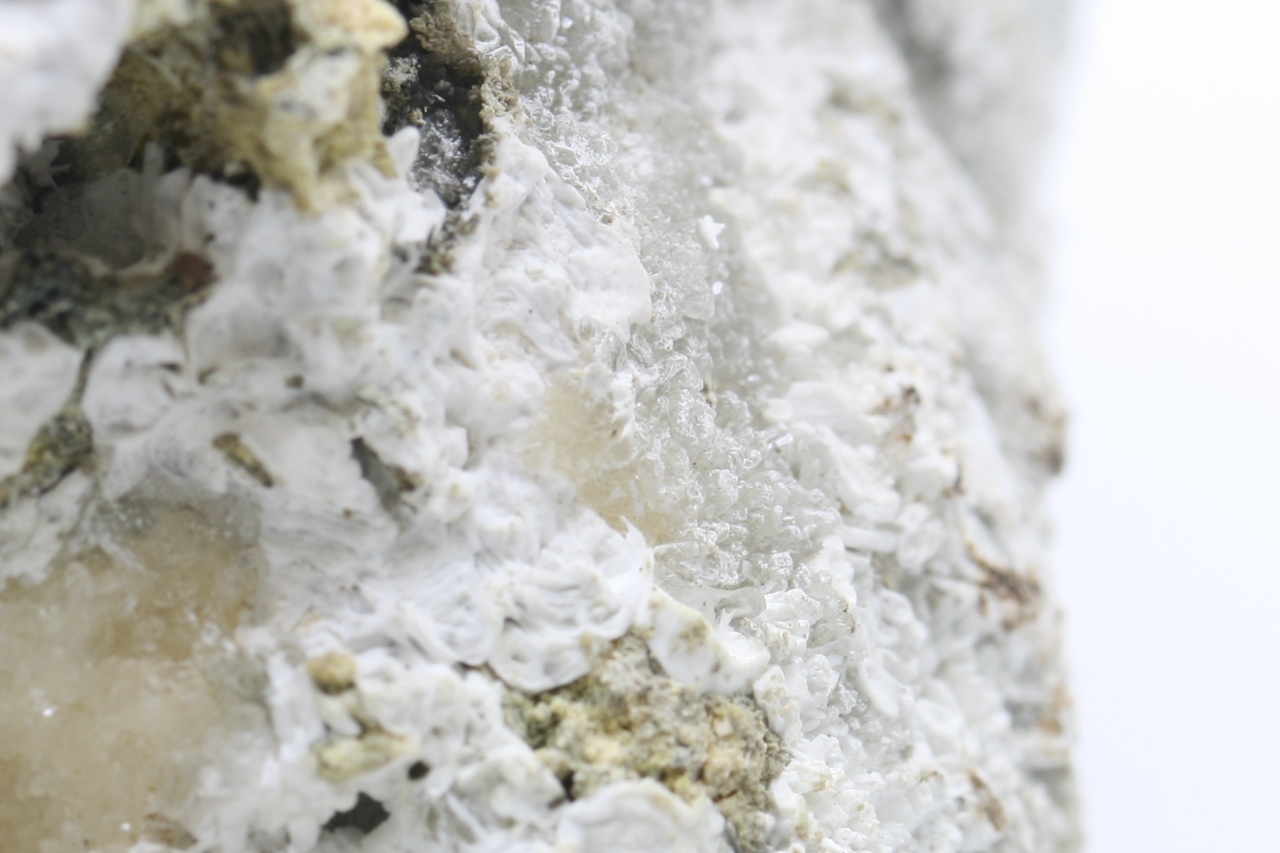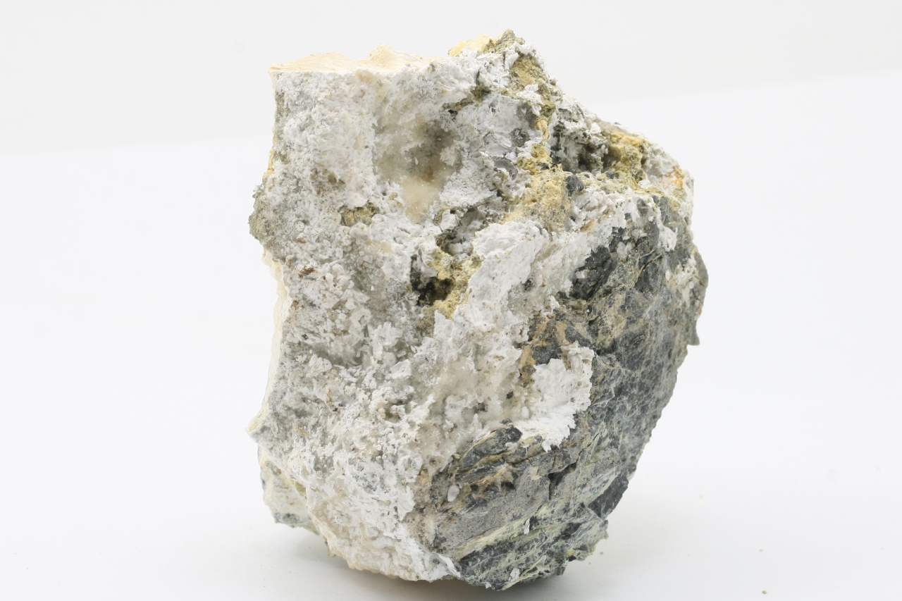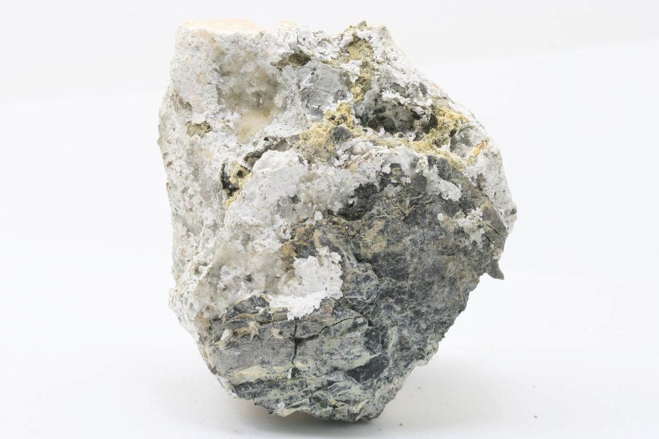 Kreide-weiße Kristalle von Brassit (Typlokalität) mit Büschen von fettig glänzendem Pharmakolith.