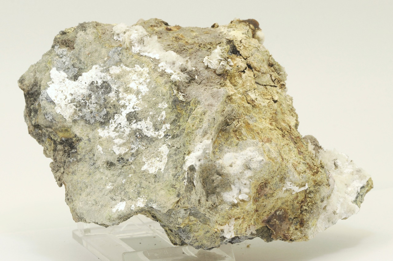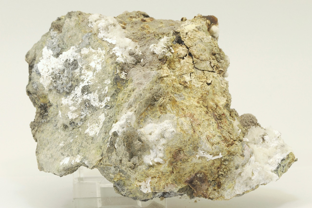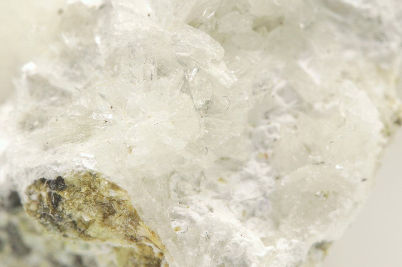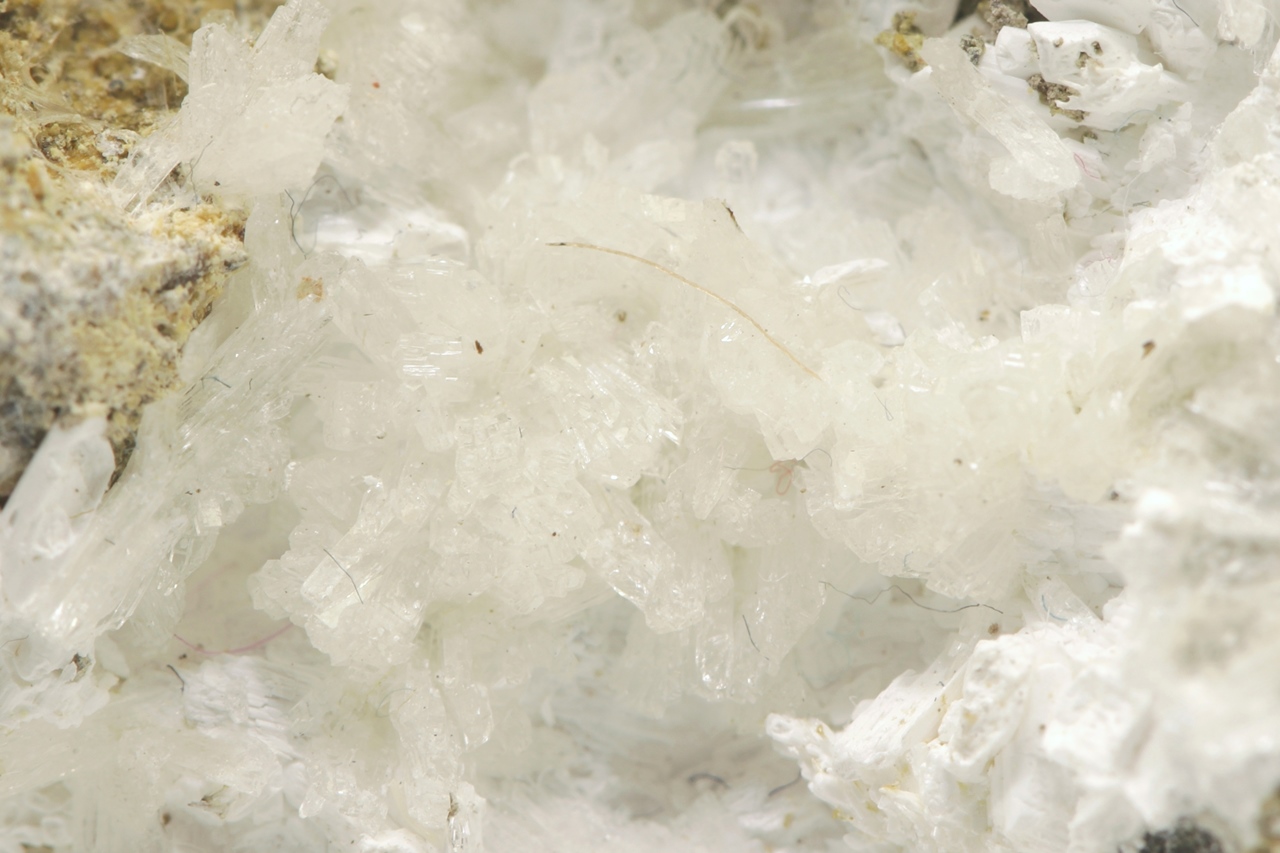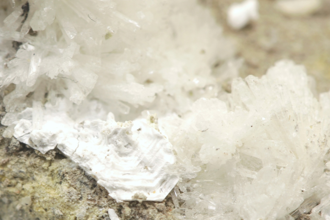 Reicher Fund von säulenförmigen, kreideweißen Brassite-Kristallen mit Sträuchern aus weißem Pharmakolit .