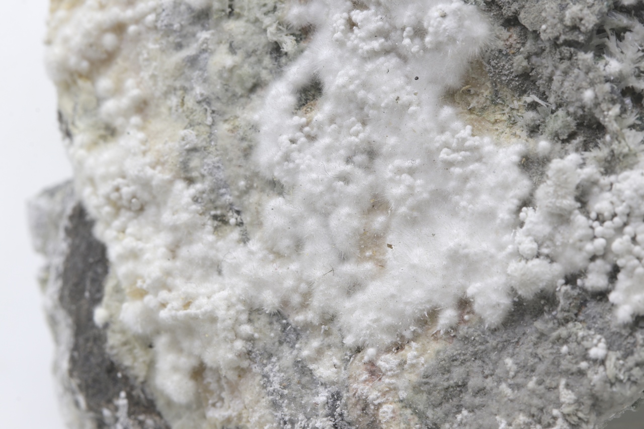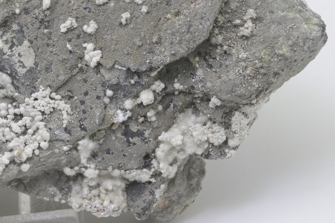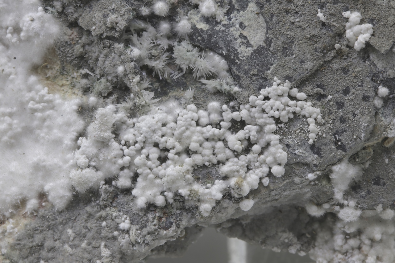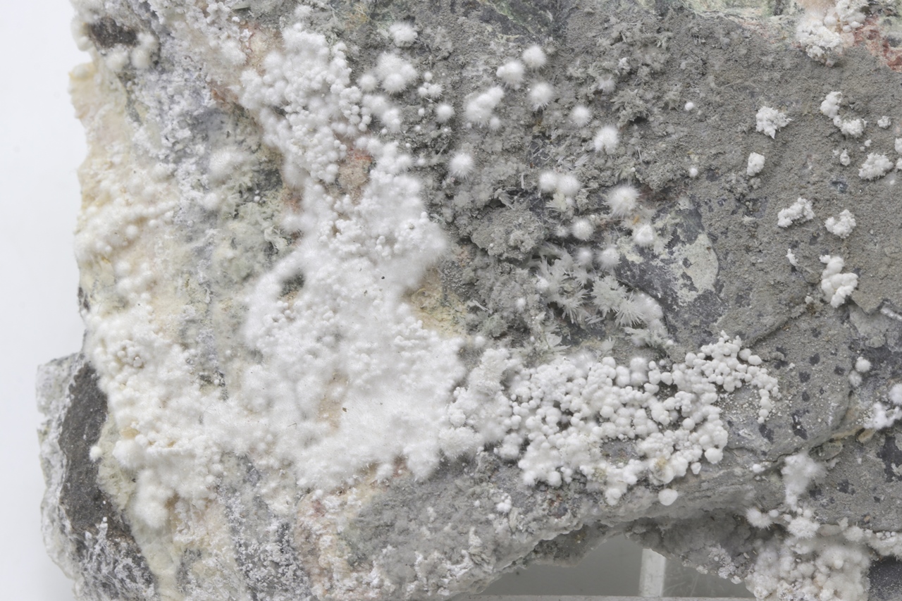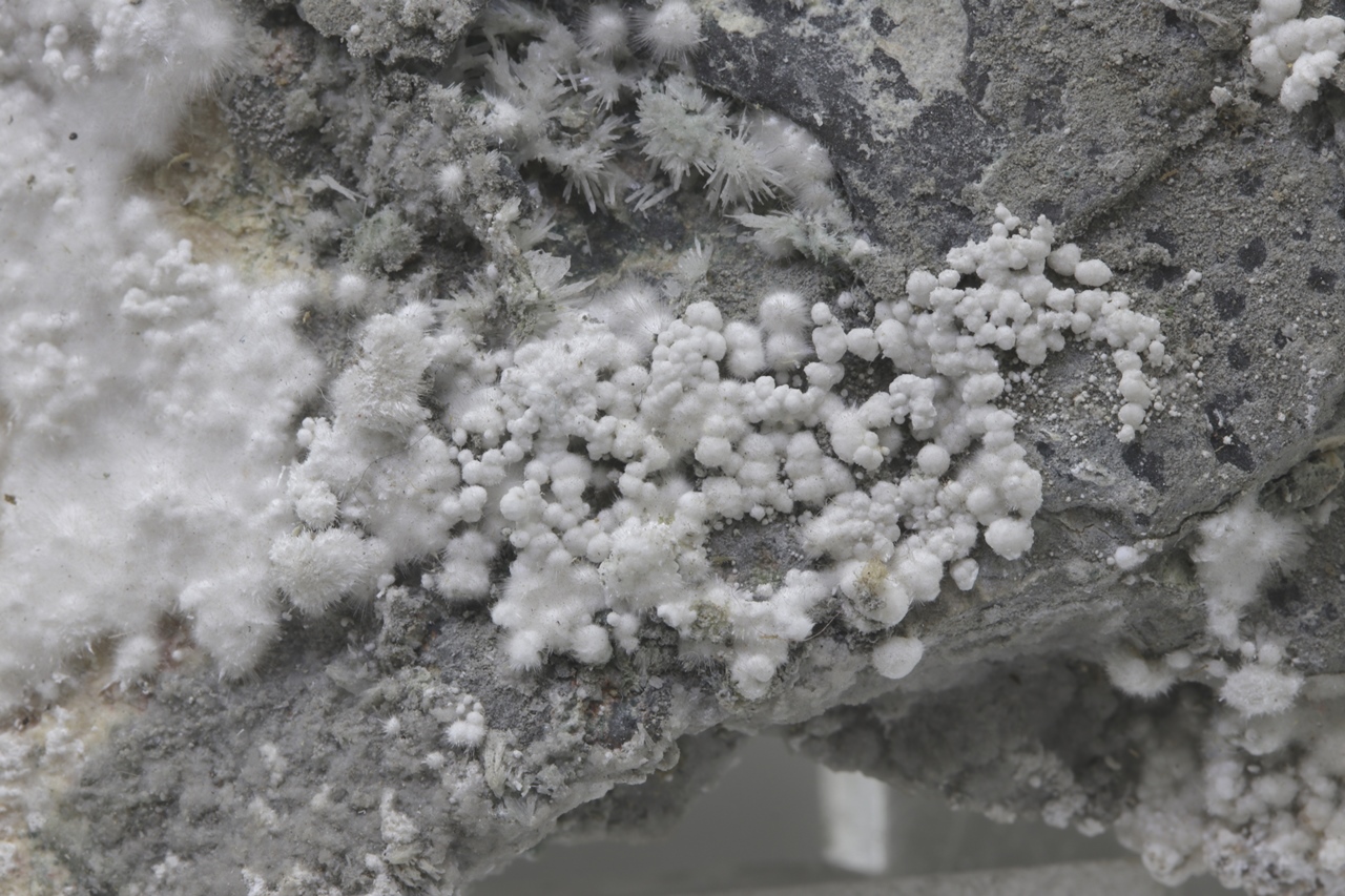 Pikrofarmakolit bildet halbkugelförmige Aggregate, seidenweißer Farbe, die aus feinen Nadeln dieses Minerals bestehen. Einzelne Aggregate von Pikrofarmakolit auf diesem Muster gruppieren sich auch oft zusammen und bilden Ansammlungen und überlagern sich auf einem grauen Grundgestein. Dies ist ein reichhaltiges Exemplar dieses Minerals aus der Svornost Mine in Jáchymov.