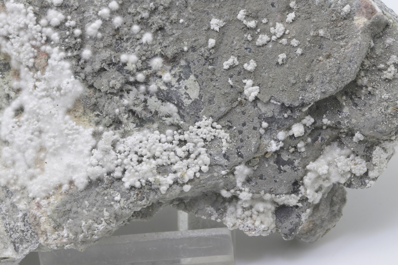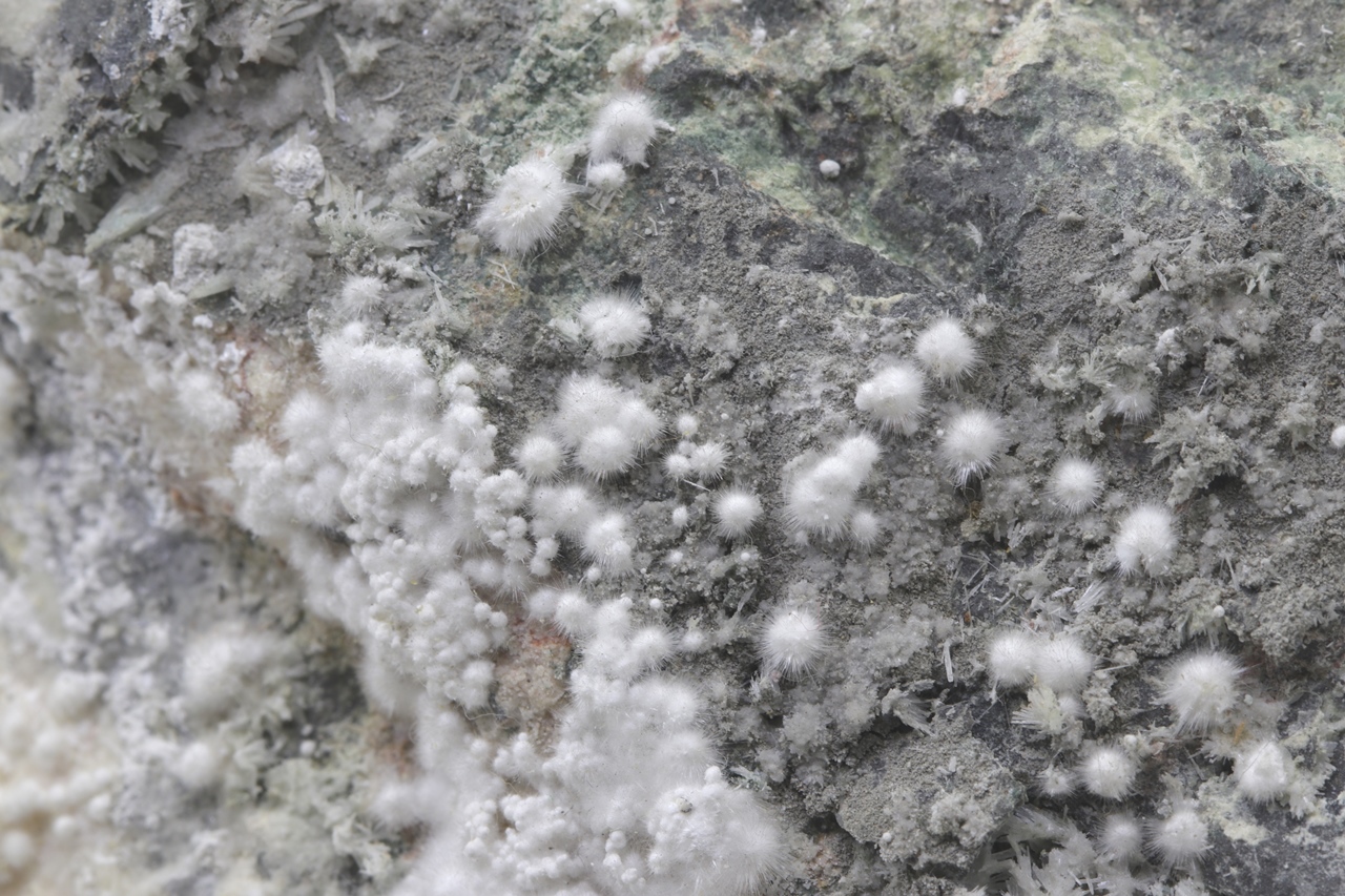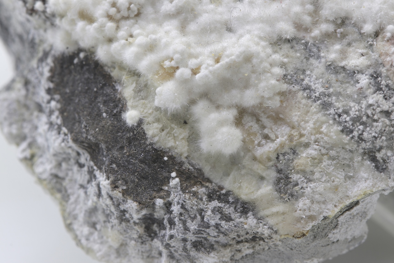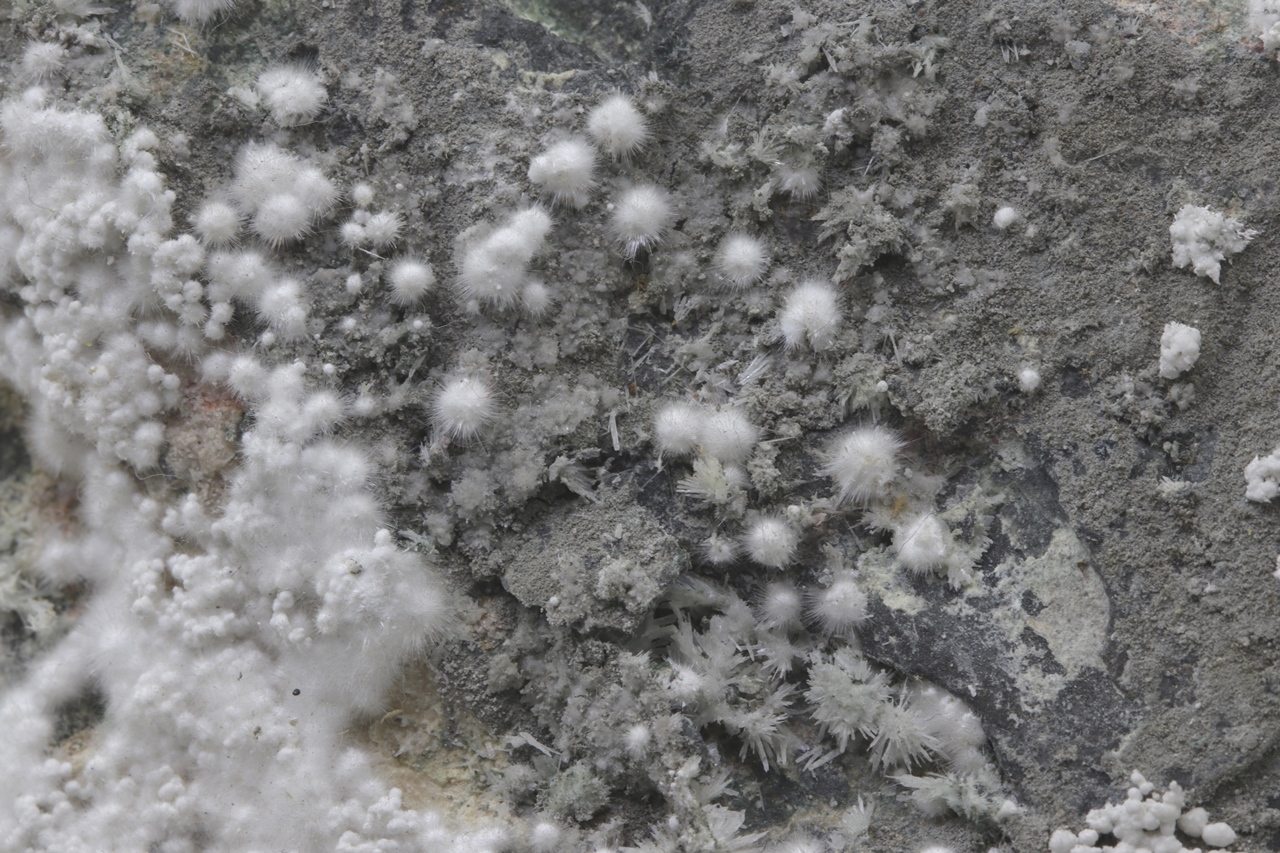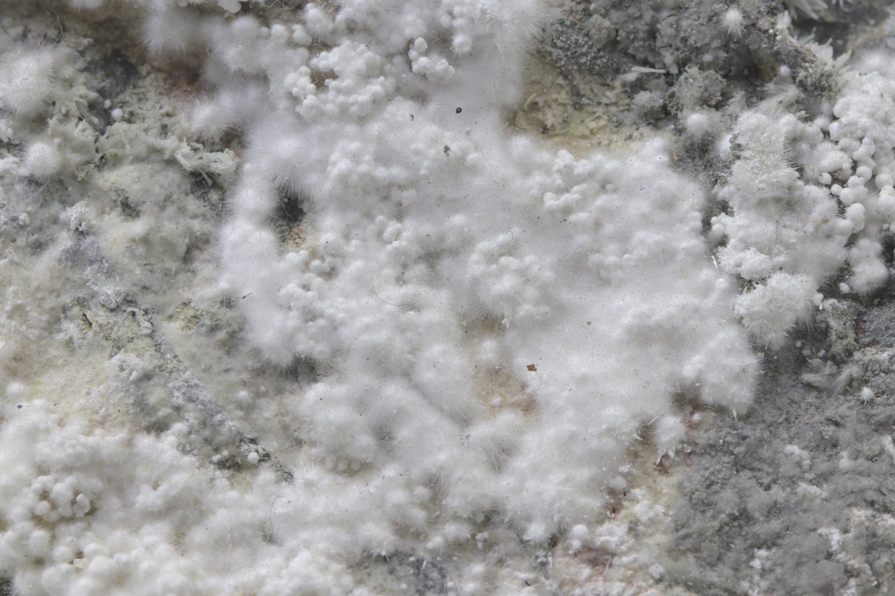Pikrofarmakolit bildet halbkugelförmige Aggregate, seidenweißer Farbe, die aus feinen Nadeln dieses Minerals bestehen. Einzelne Aggregate von Pikrofarmakolit auf diesem Muster gruppieren sich auch oft zusammen und bilden Ansammlungen und überlagern sich auf einem grauen Grundgestein. Dies ist ein reichhaltiges Exemplar dieses Minerals aus der Svornost Mine in Jáchymov.
