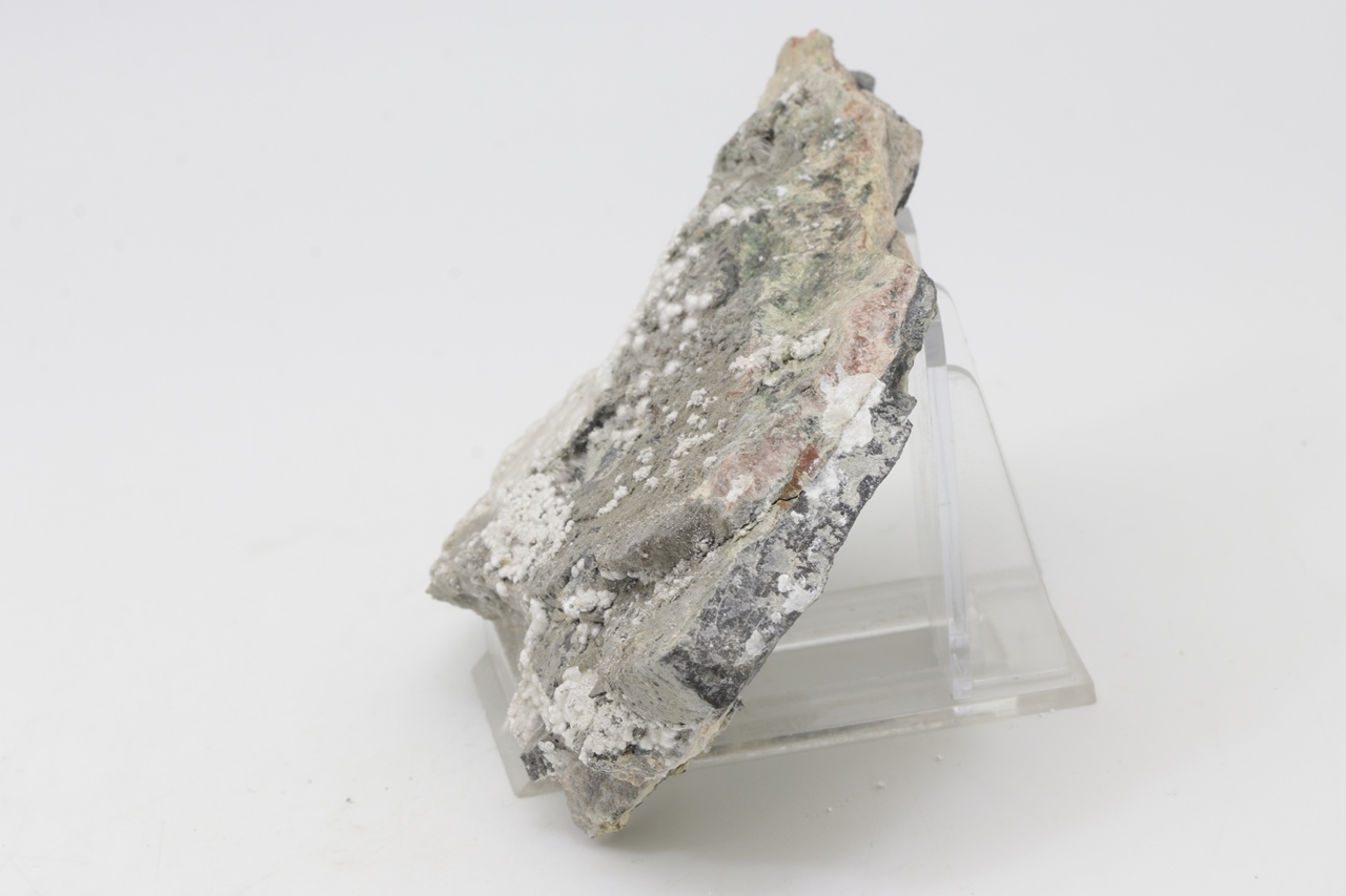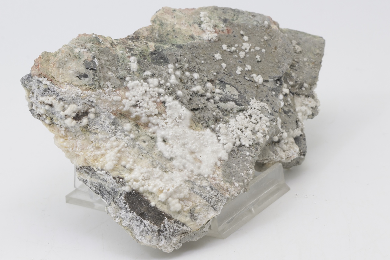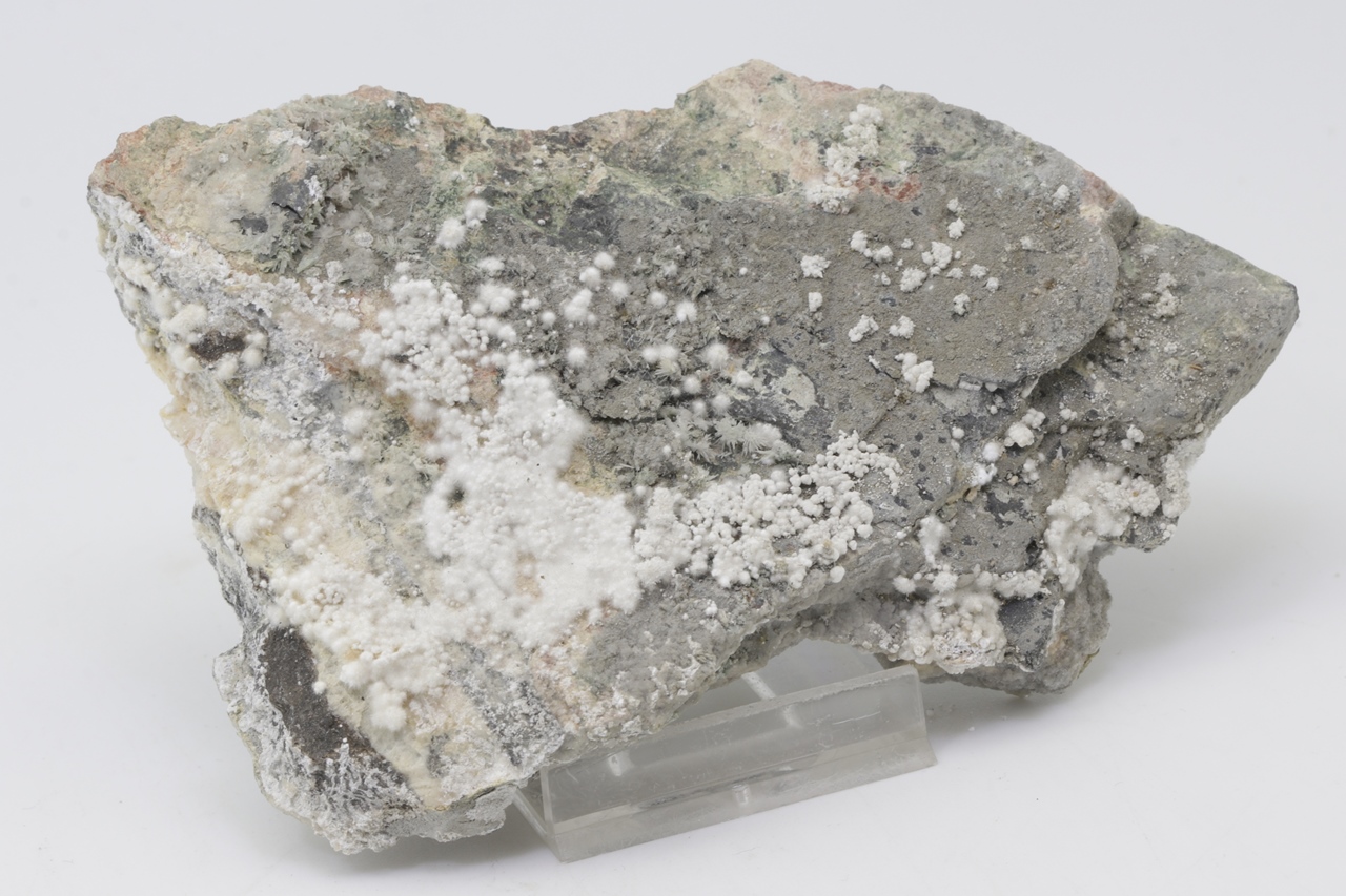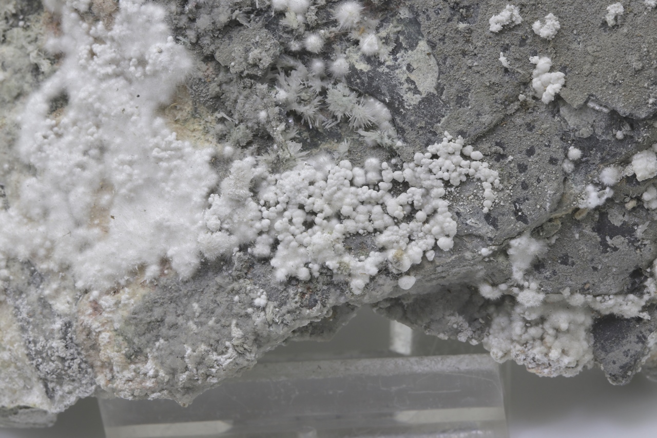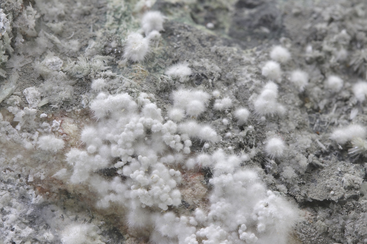 Pikrofarmakolit bildet halbkugelförmige Aggregate, seidenweißer Farbe, die aus feinen Nadeln dieses Minerals bestehen. Einzelne Aggregate von Pikrofarmakolit auf diesem Muster gruppieren sich auch oft zusammen und bilden Ansammlungen und überlagern sich auf einem grauen Grundgestein. Dies ist ein reichhaltiges Exemplar dieses Minerals aus der Svornost Mine in Jáchymov.