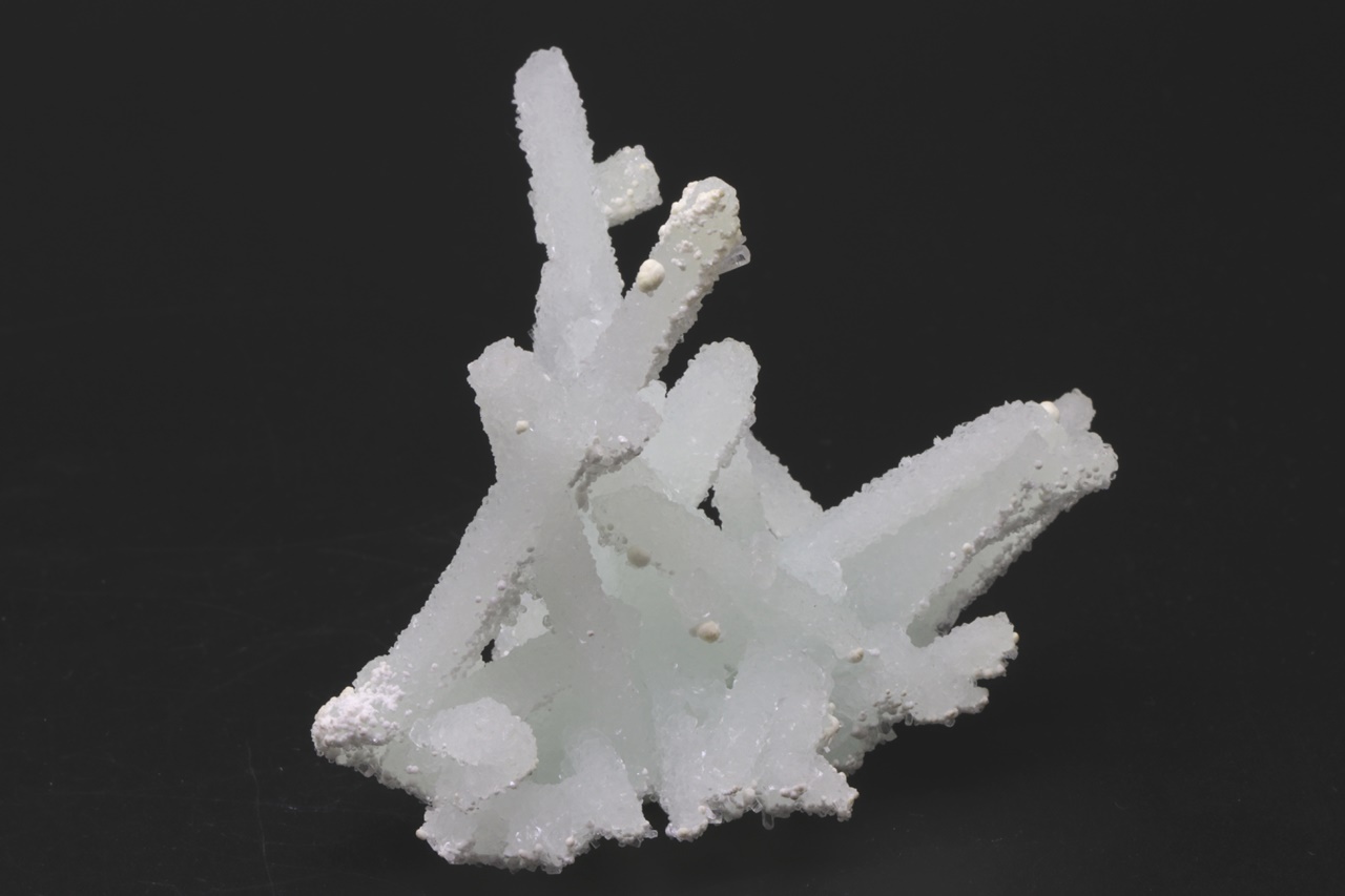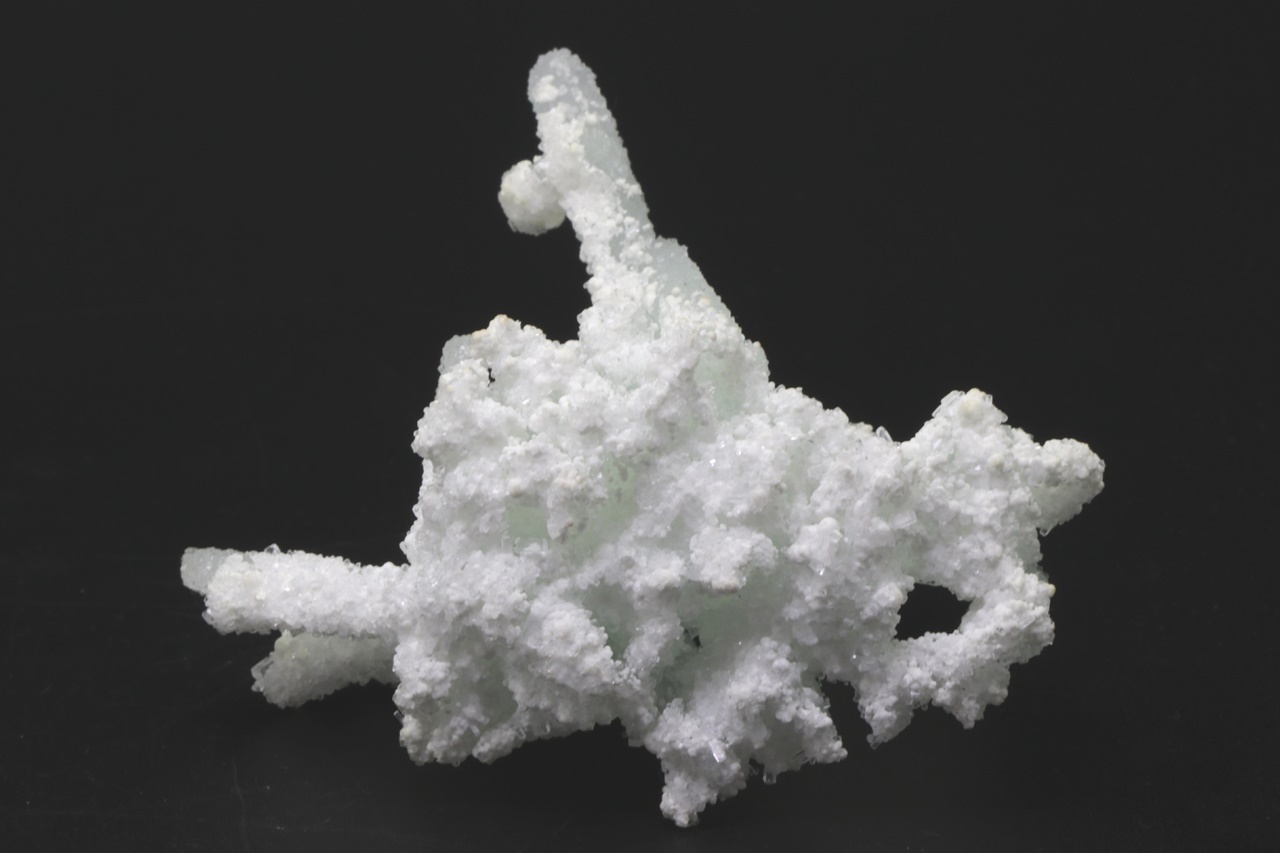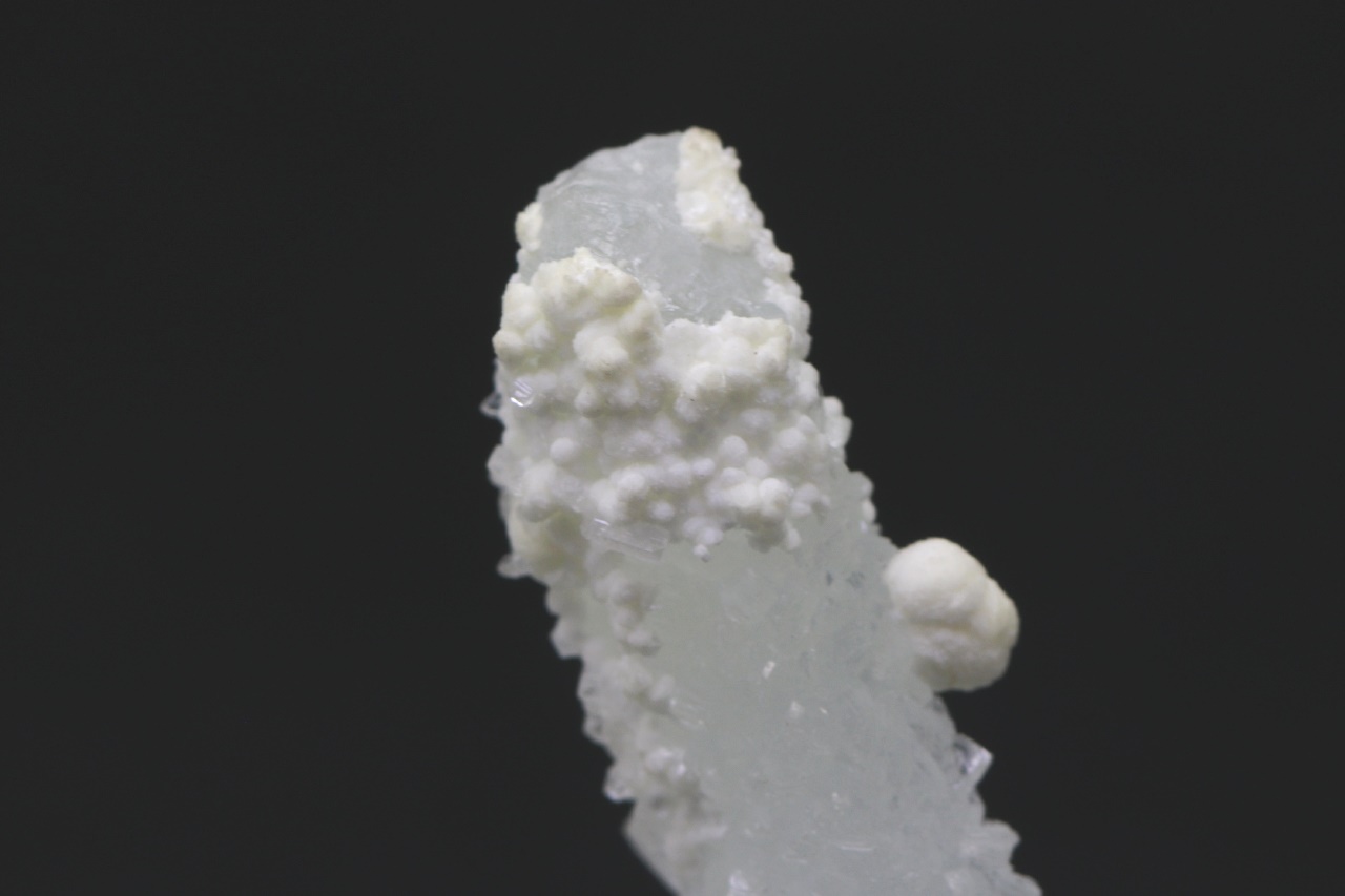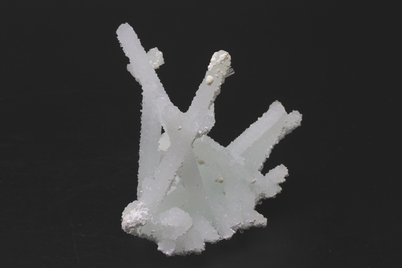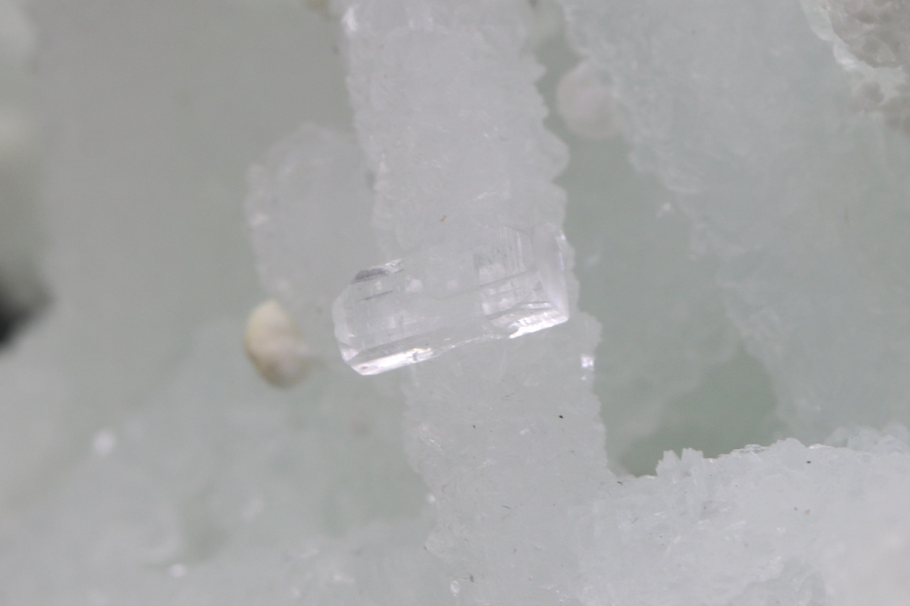 Pseudomorphosen von hellgrünem Prehnit nach Laumontit, bis zu 10 cm groß, bewachsen mit weißem Okenit und klarem Prehnit.