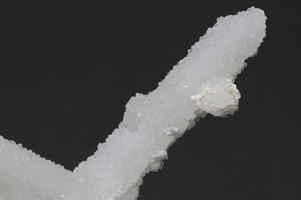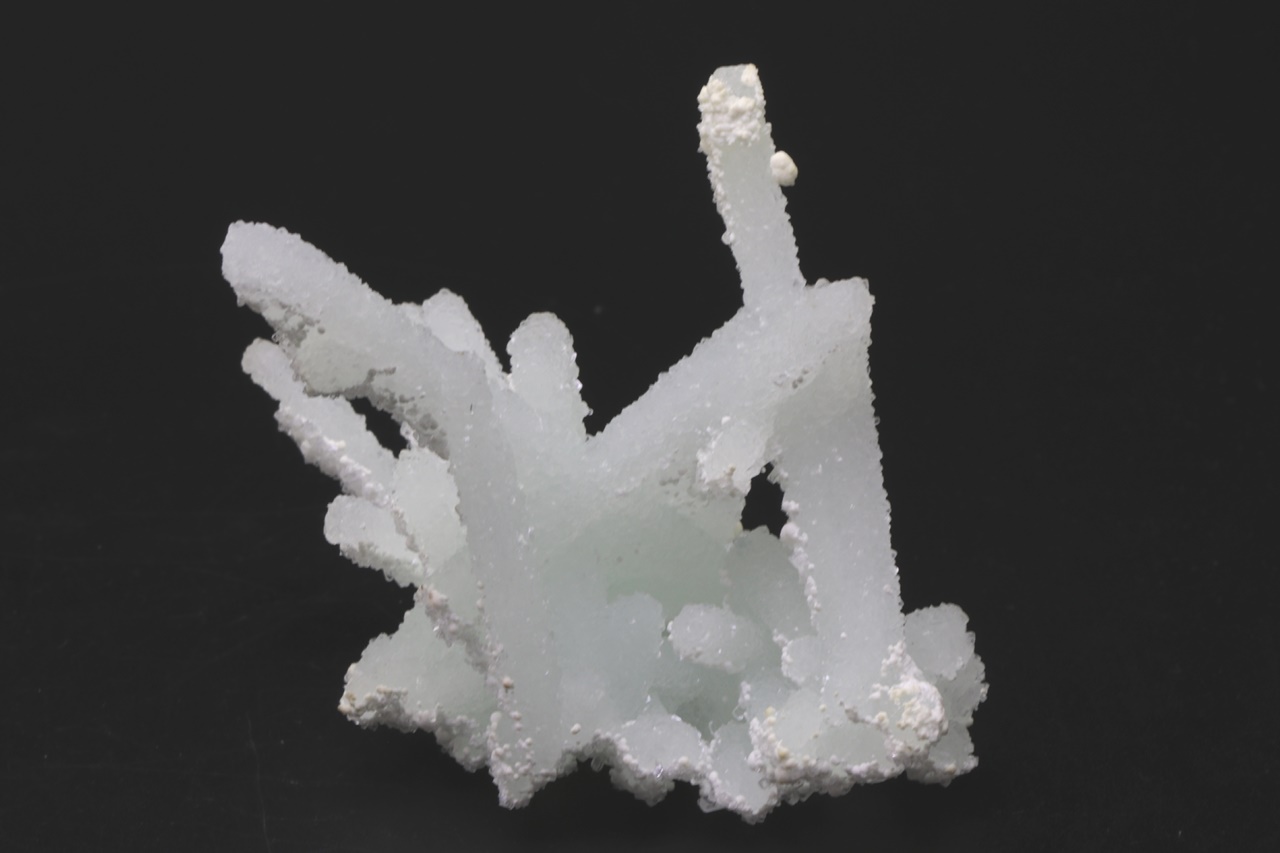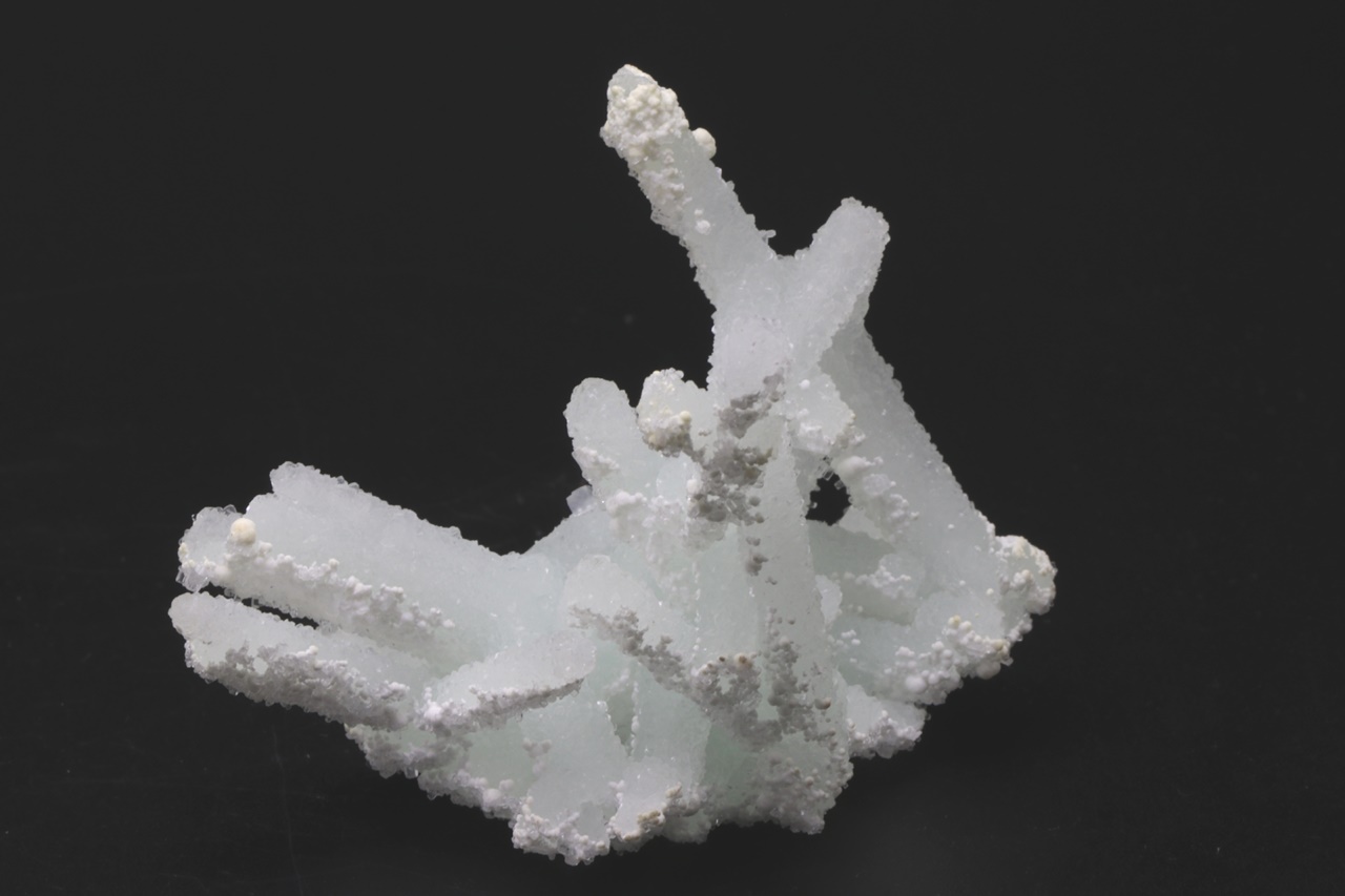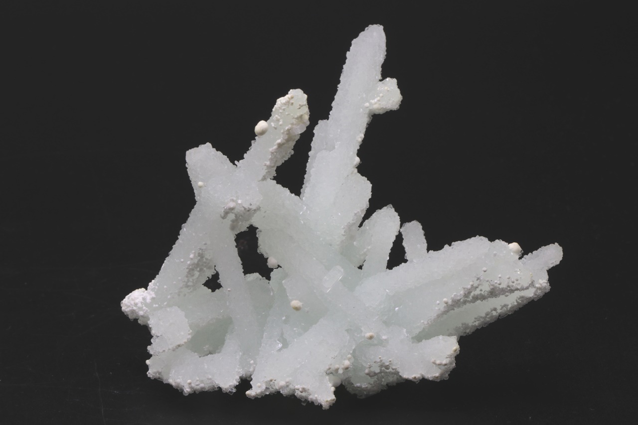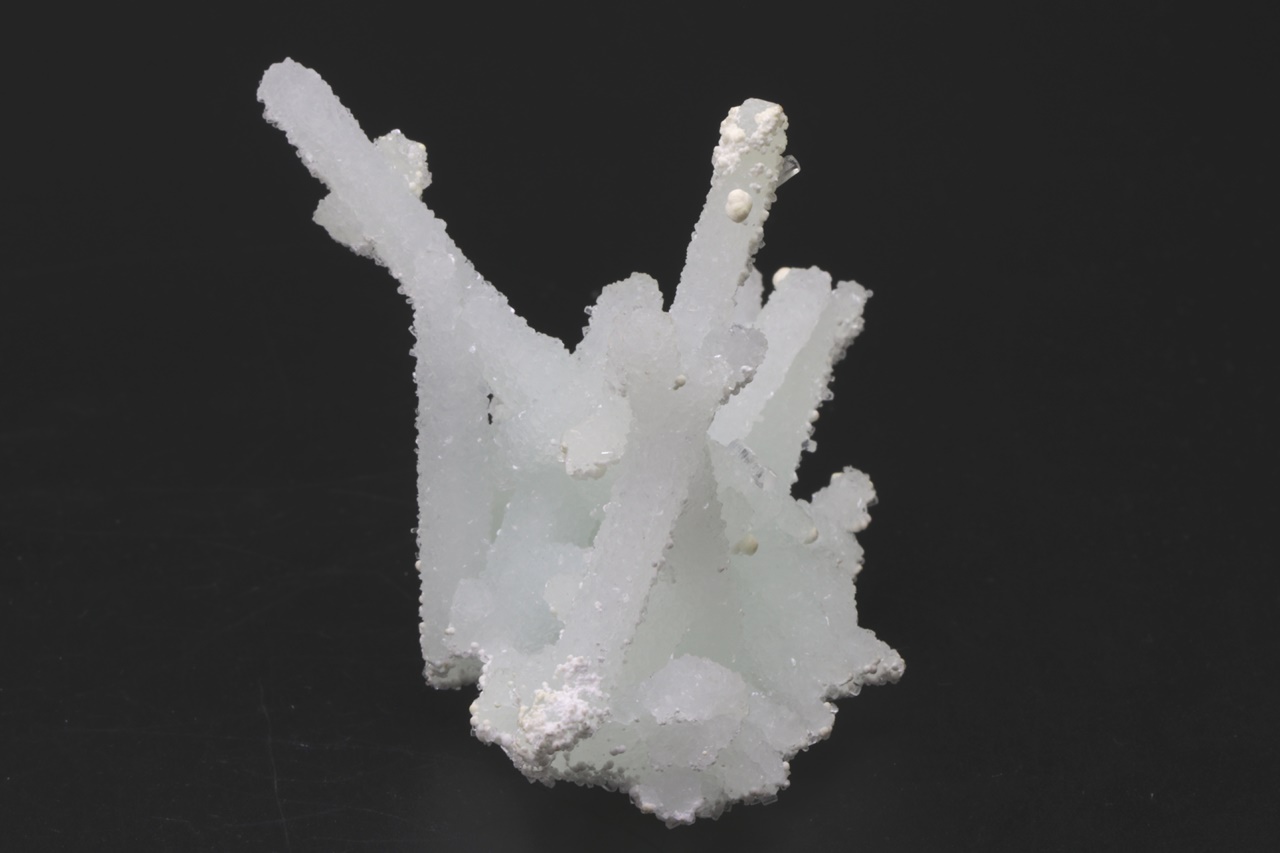 Pseudomorphosen von hellgrünem Prehnit nach Laumontit, bis zu 10 cm groß, bewachsen mit weißem Okenit und klarem Prehnit.