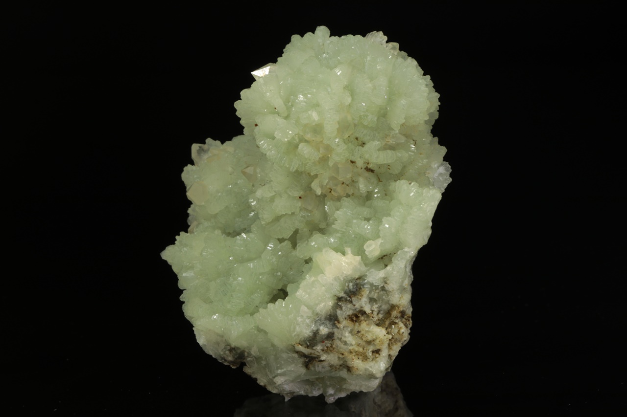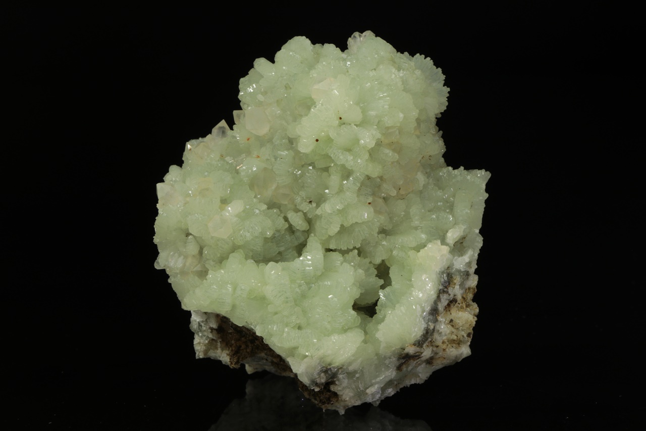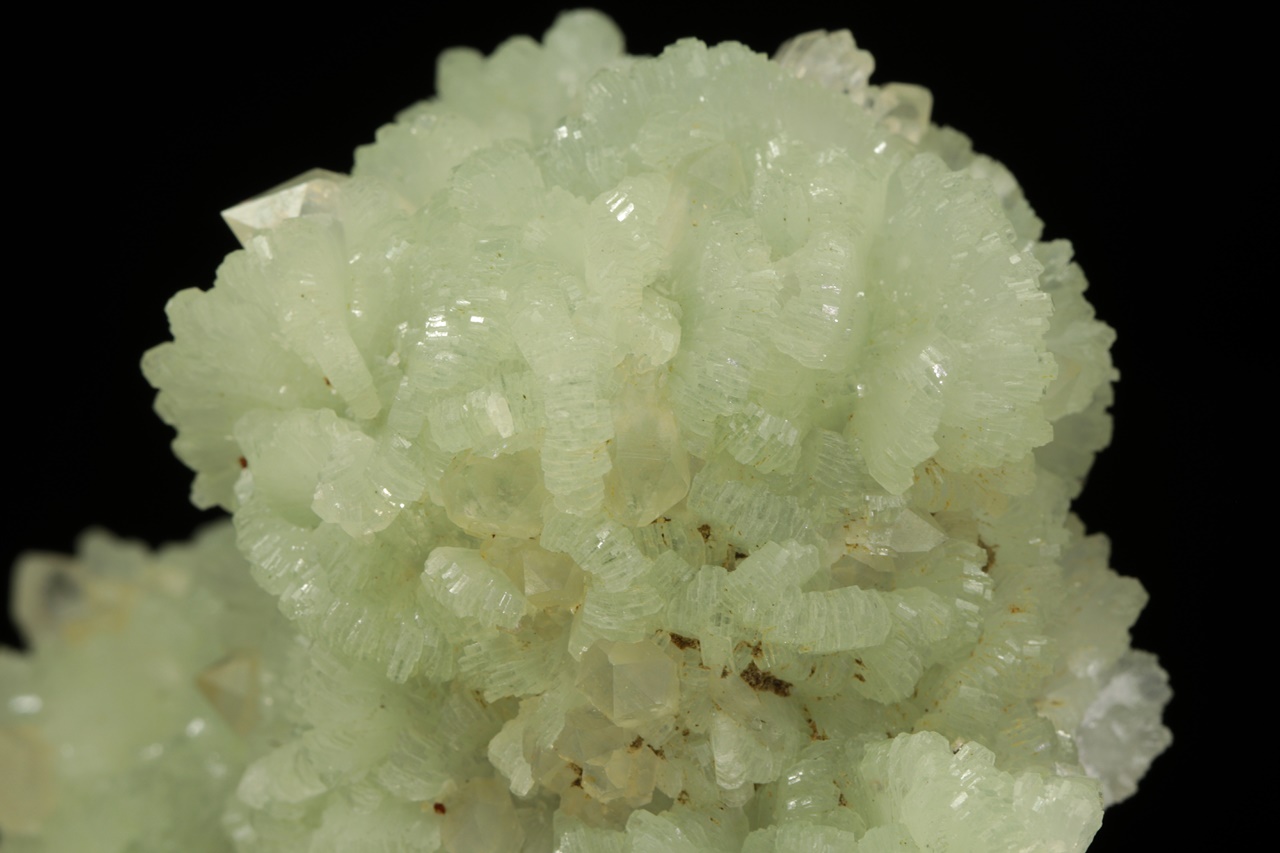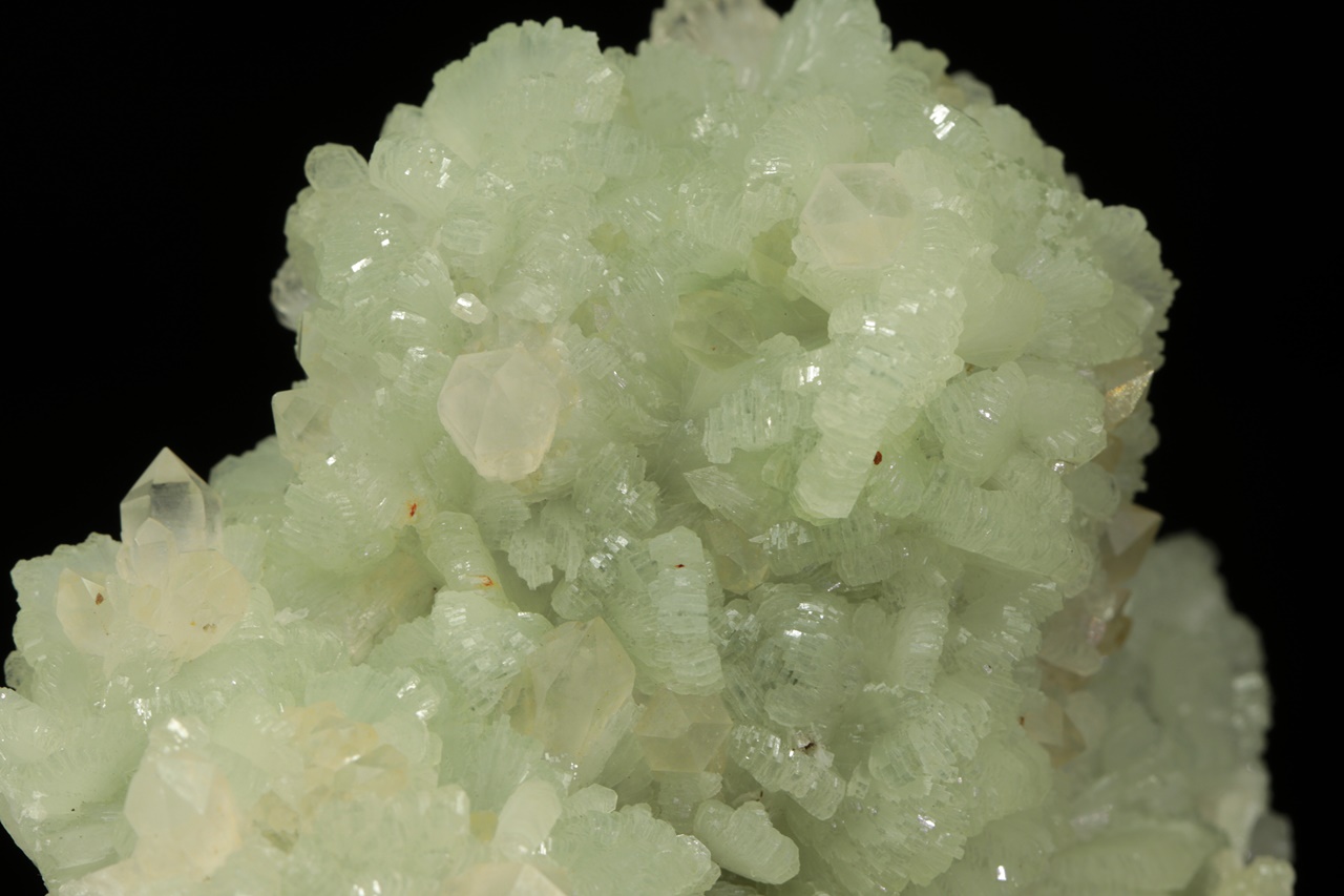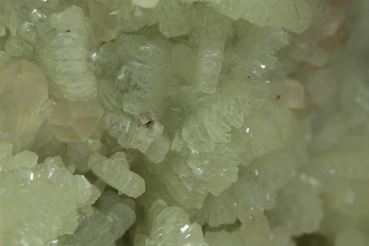 Tabellarische Kristalle von hellgrünem Prehnit, die Fächer bis zu 1,5 cm Größe bilden, verwachsen mit Křišťálem.
