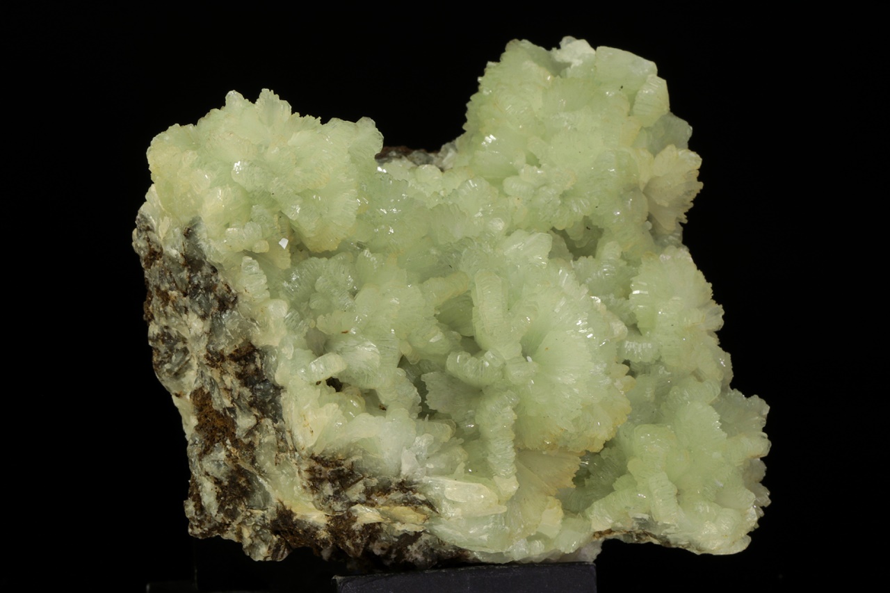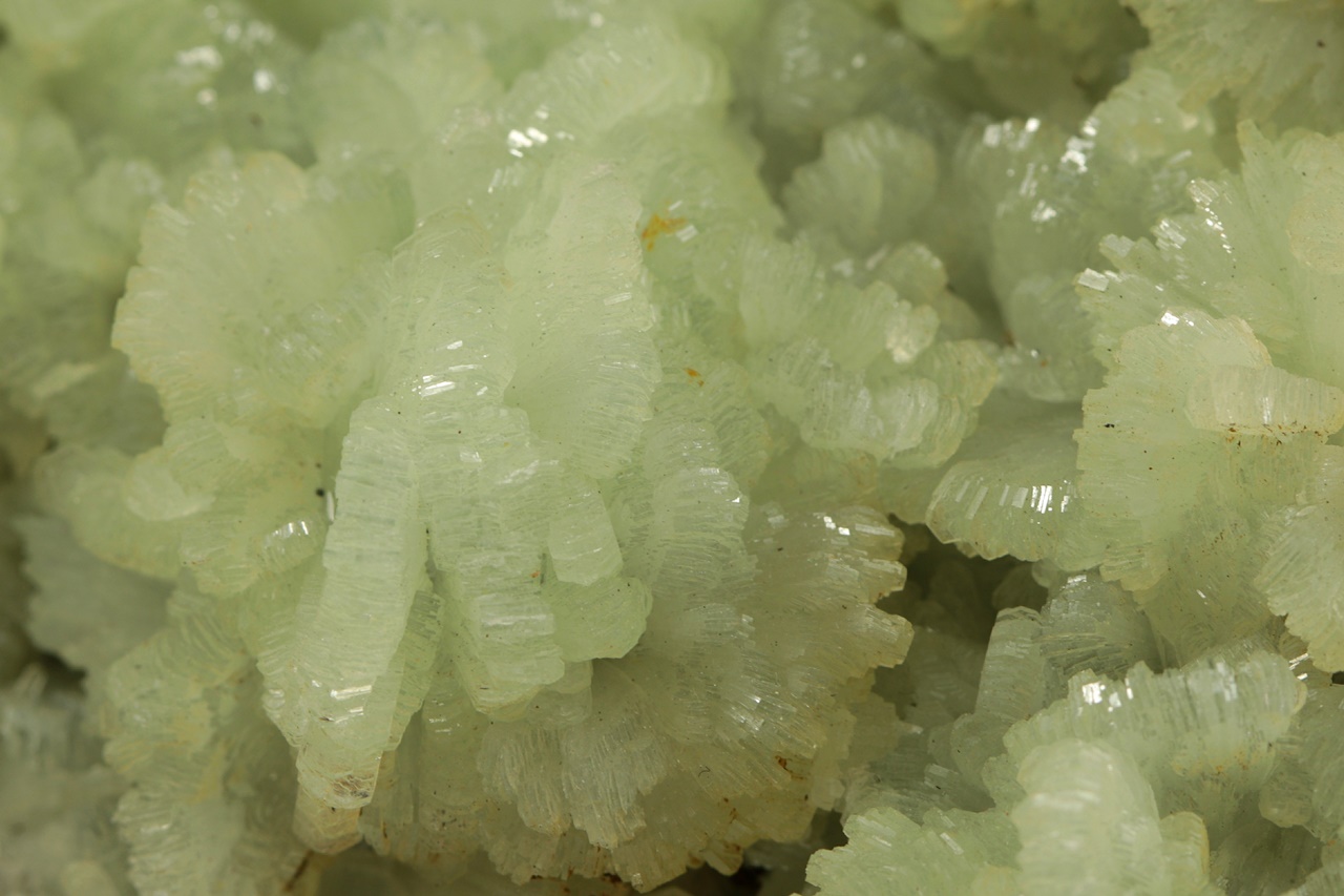 Fächerförmige Aggregate aus hellgrünem glänzenden Prehnit. Die Prehnitfächer sind bis zu 1,5 cm groß.