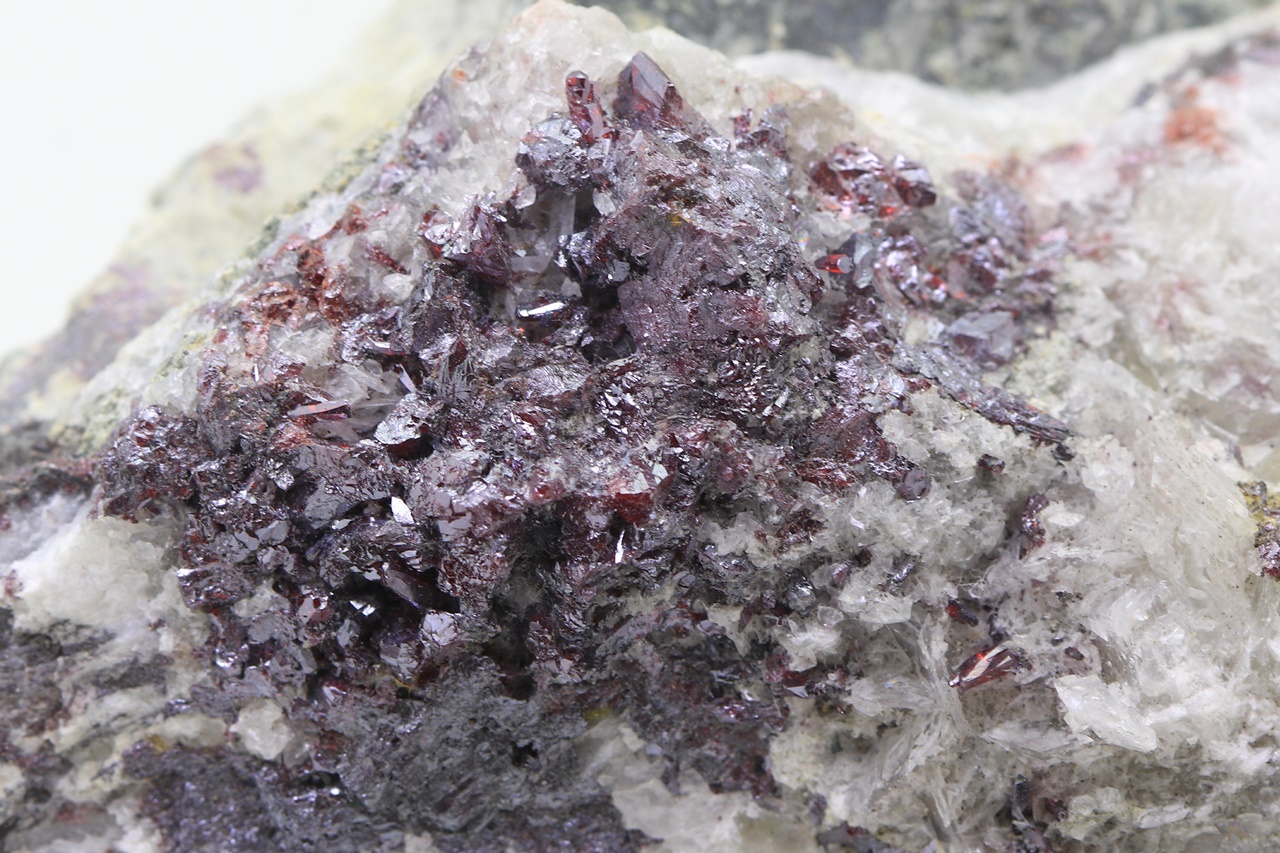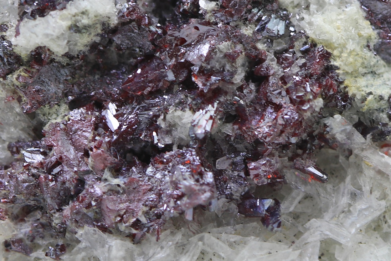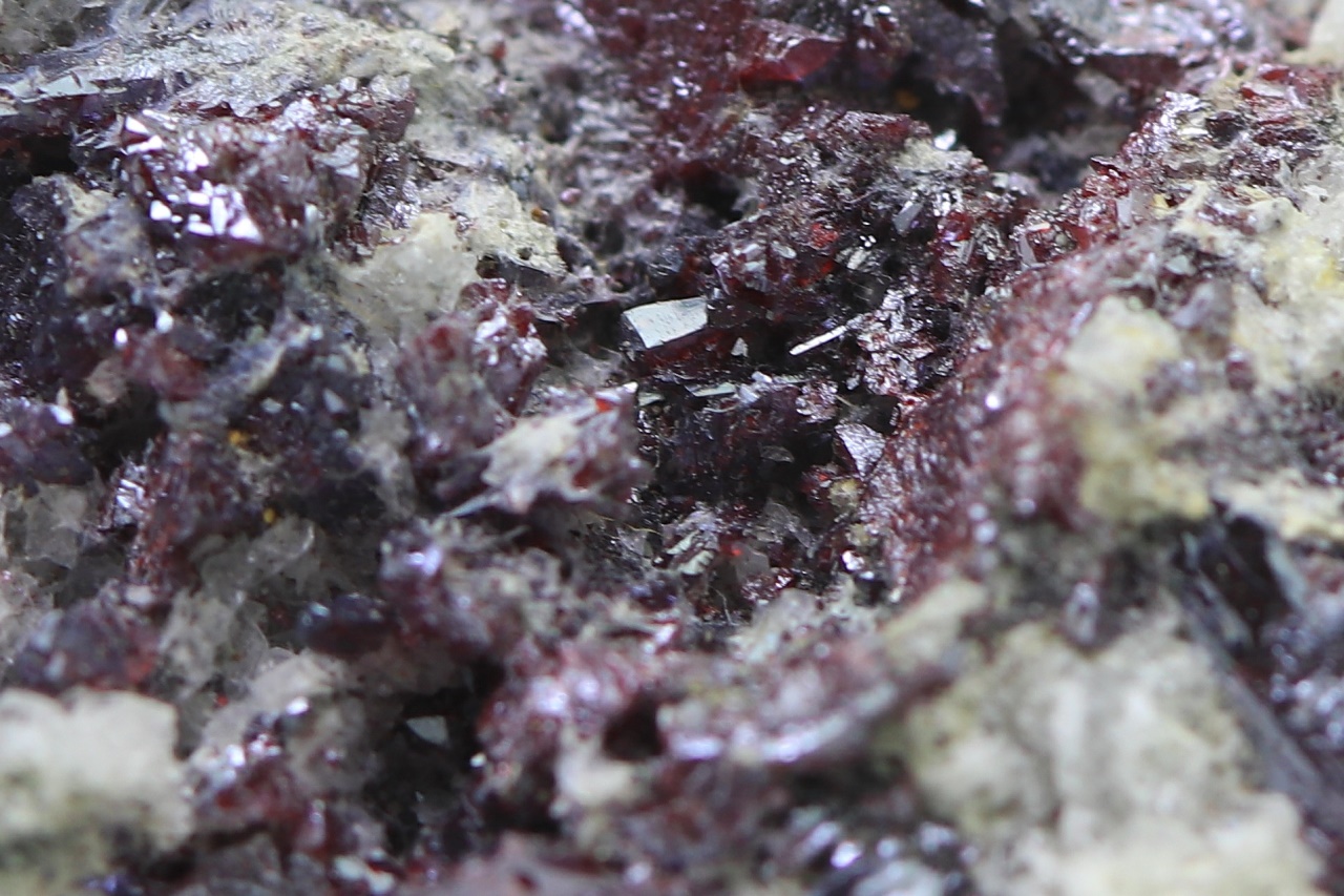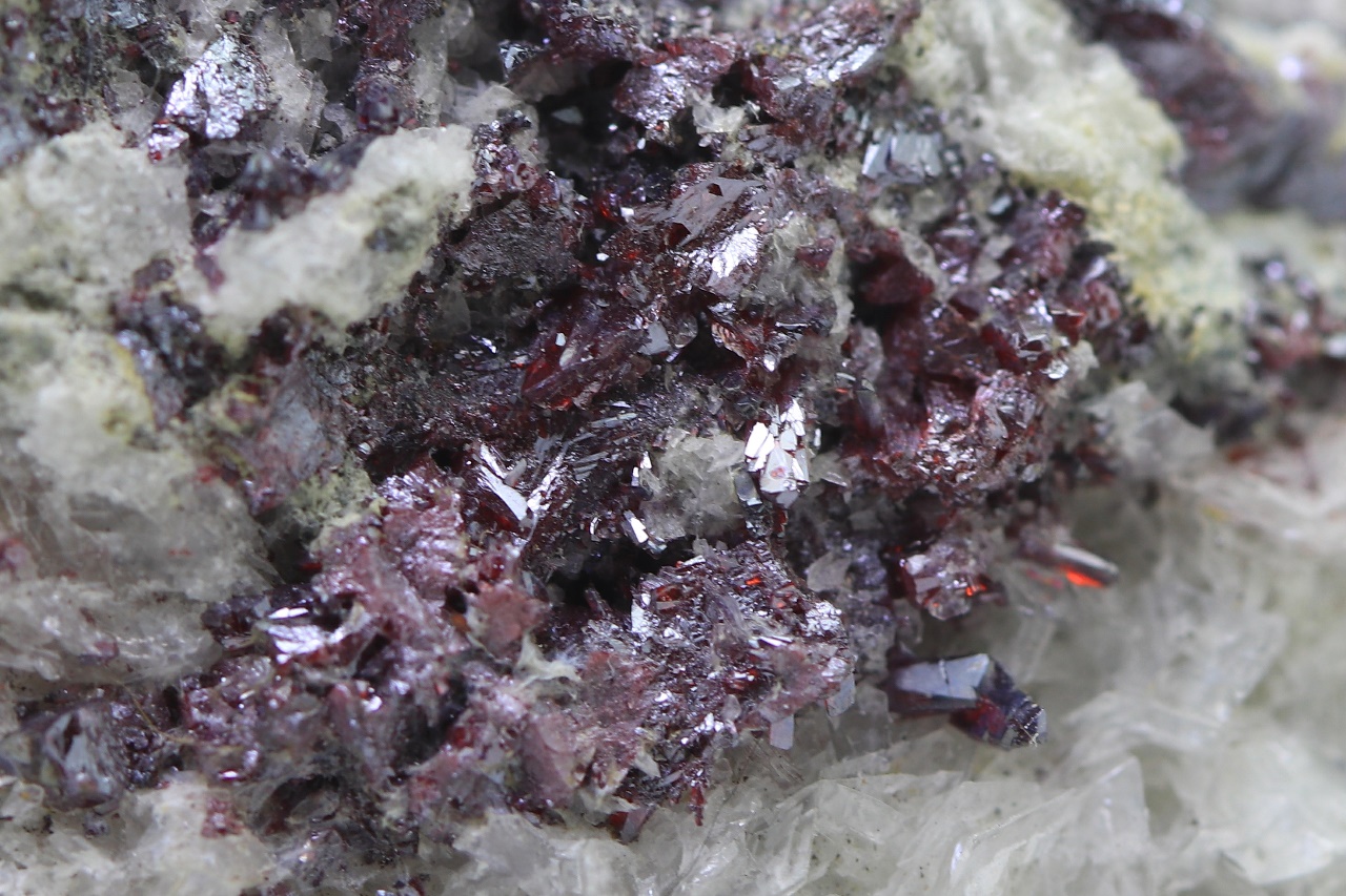 Kristalle von dunkelrotem, glänzendem Proustit gewachsen auf weißem Calcit. Der größte Kristall ist 5 mm groß.