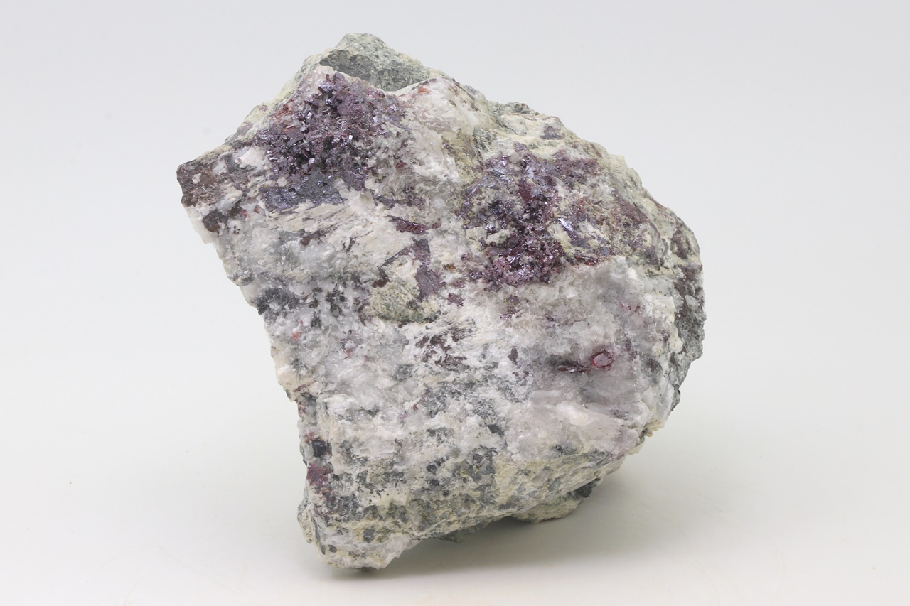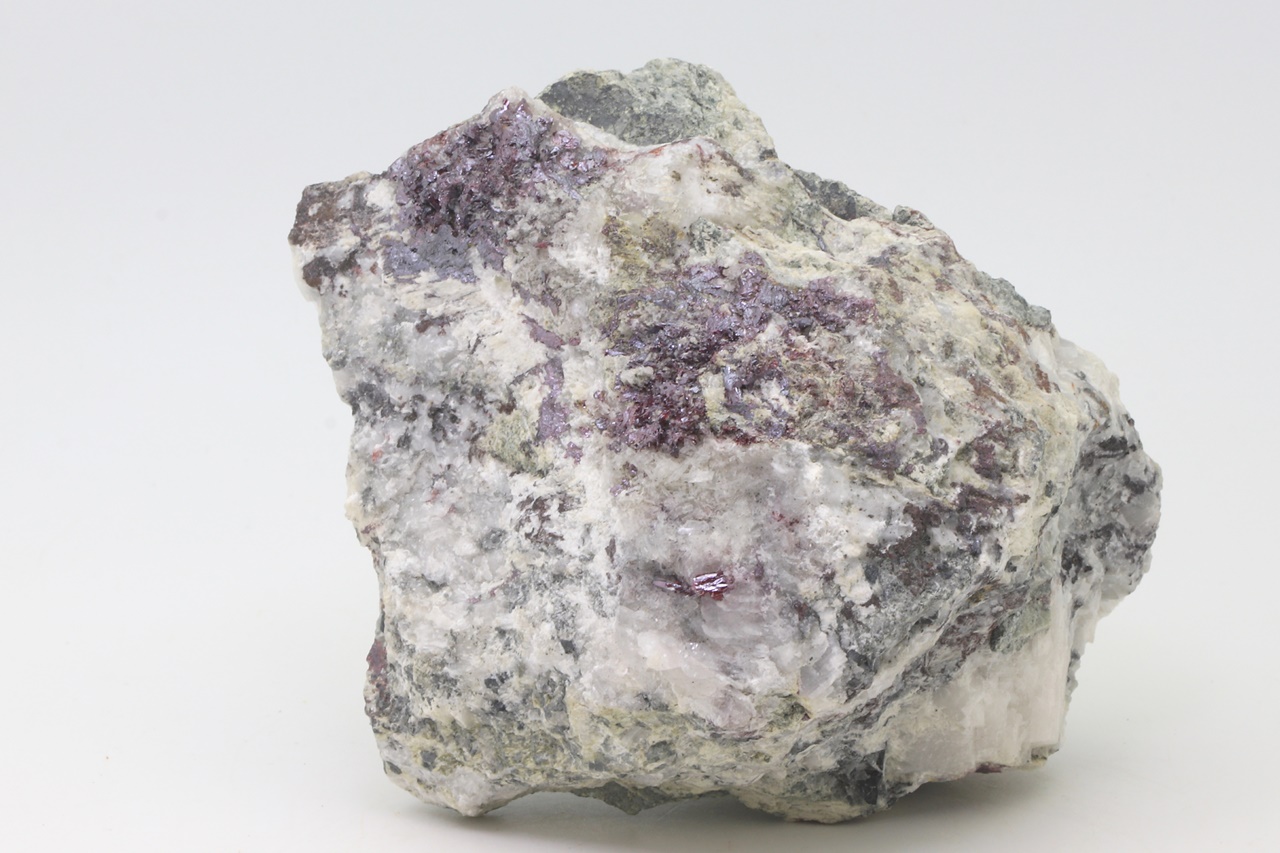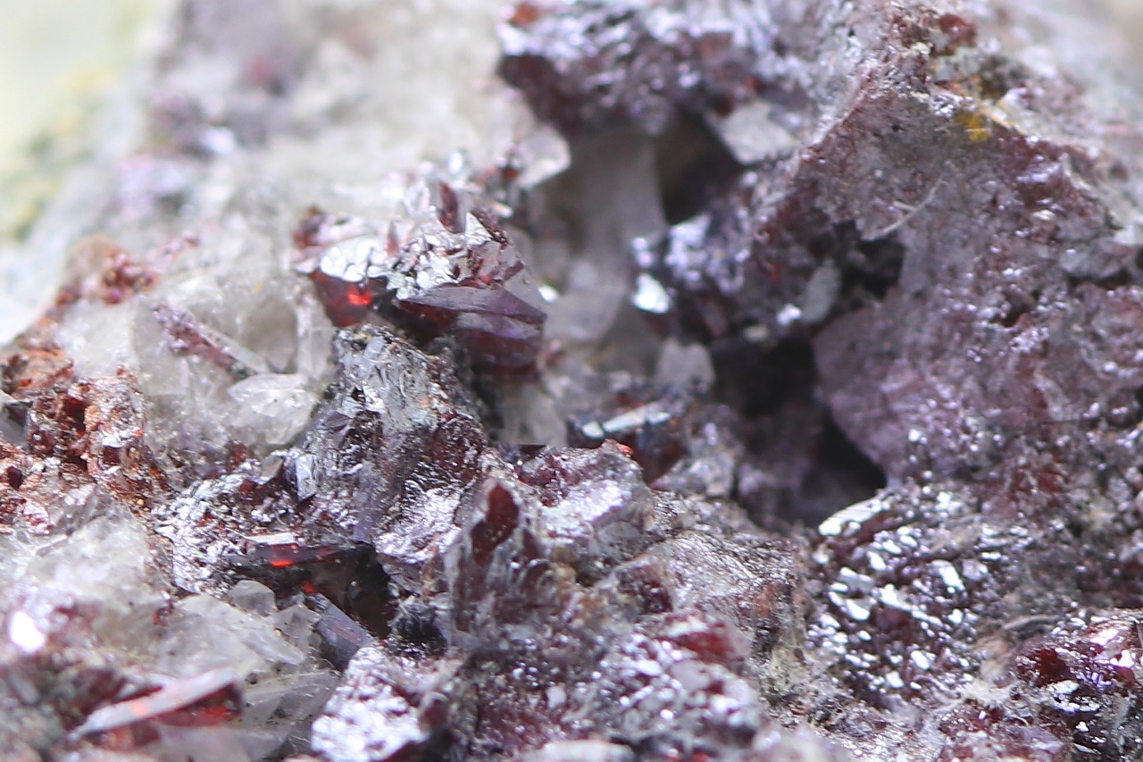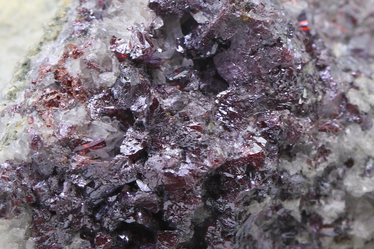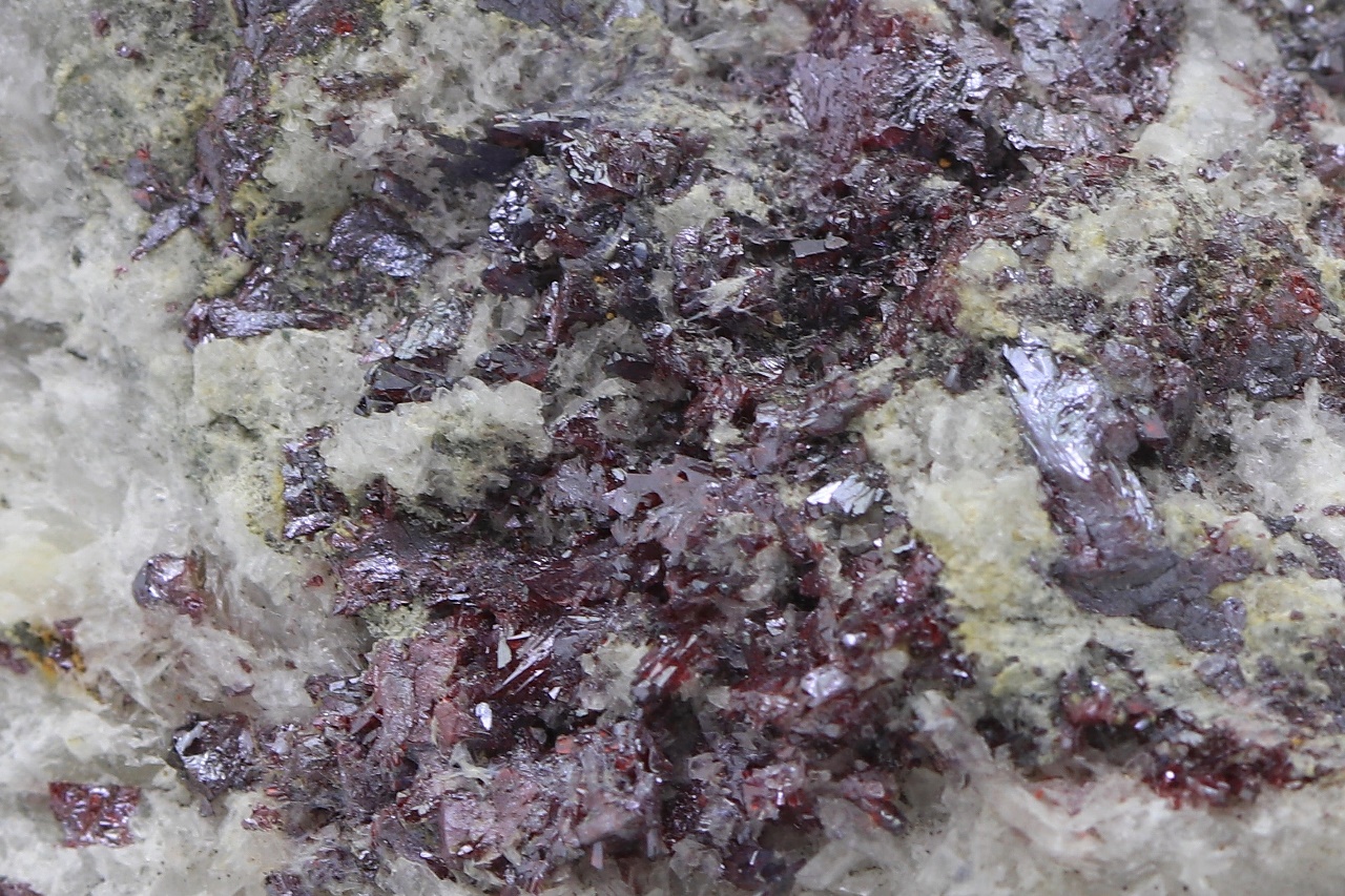 Kristalle von dunkelrotem, glänzendem Proustit gewachsen auf weißem Calcit. Der größte Kristall ist 5 mm groß.