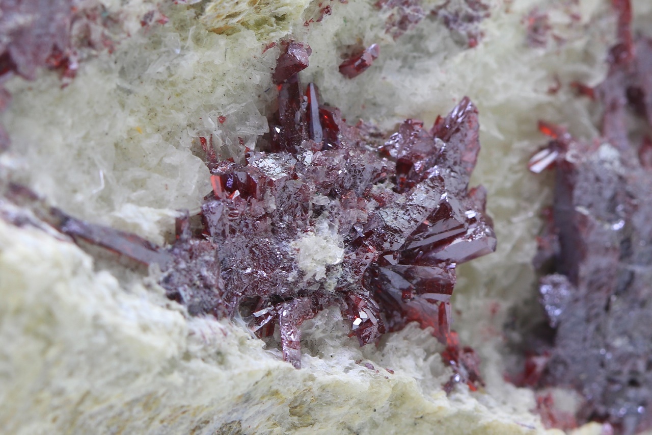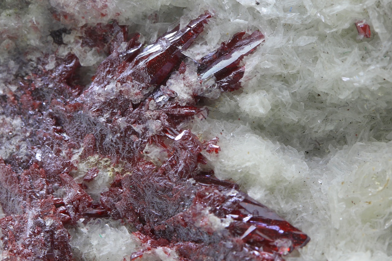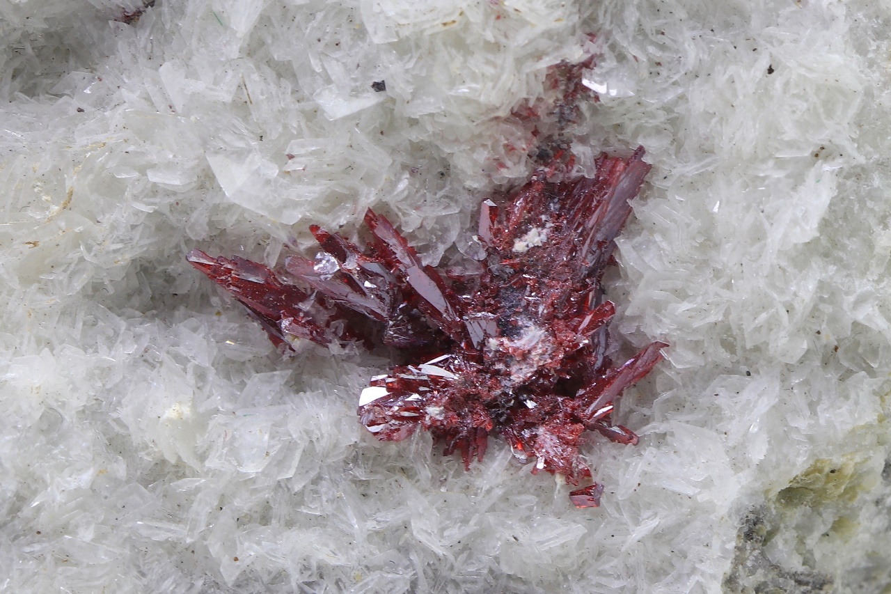 Reichhaltige Probe herrlicher, glänzender Kristalle von intensiv rotem Proustit auf kontrastierendem weißem Kalkstein. Der größte Kristall ist 7 mm groß.