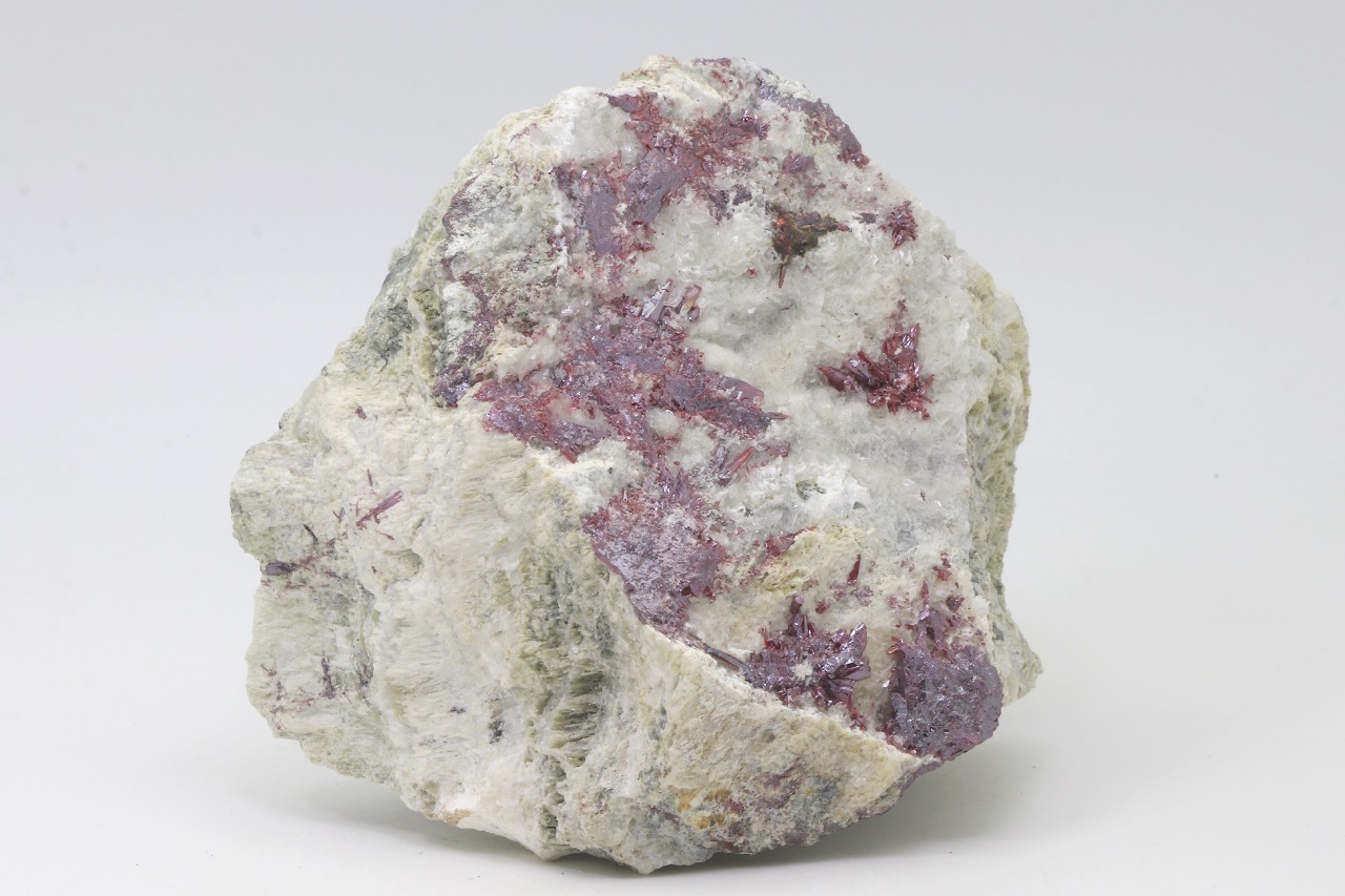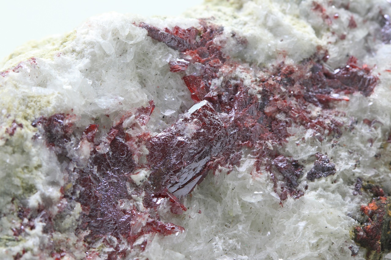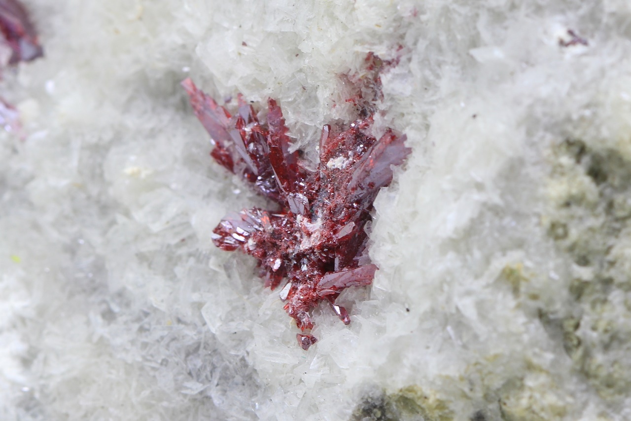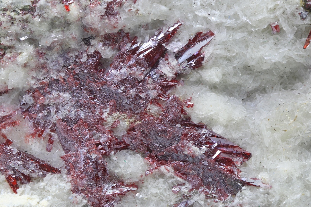 Reichhaltige Probe herrlicher, glänzender Kristalle von intensiv rotem Proustit auf kontrastierendem weißem Kalkstein. Der größte Kristall ist 7 mm groß.