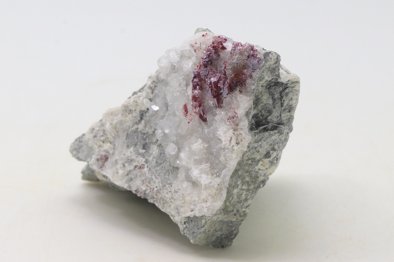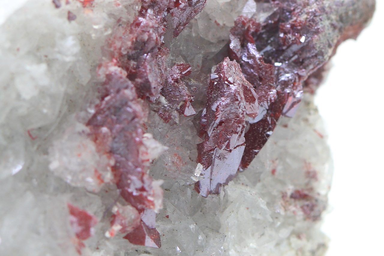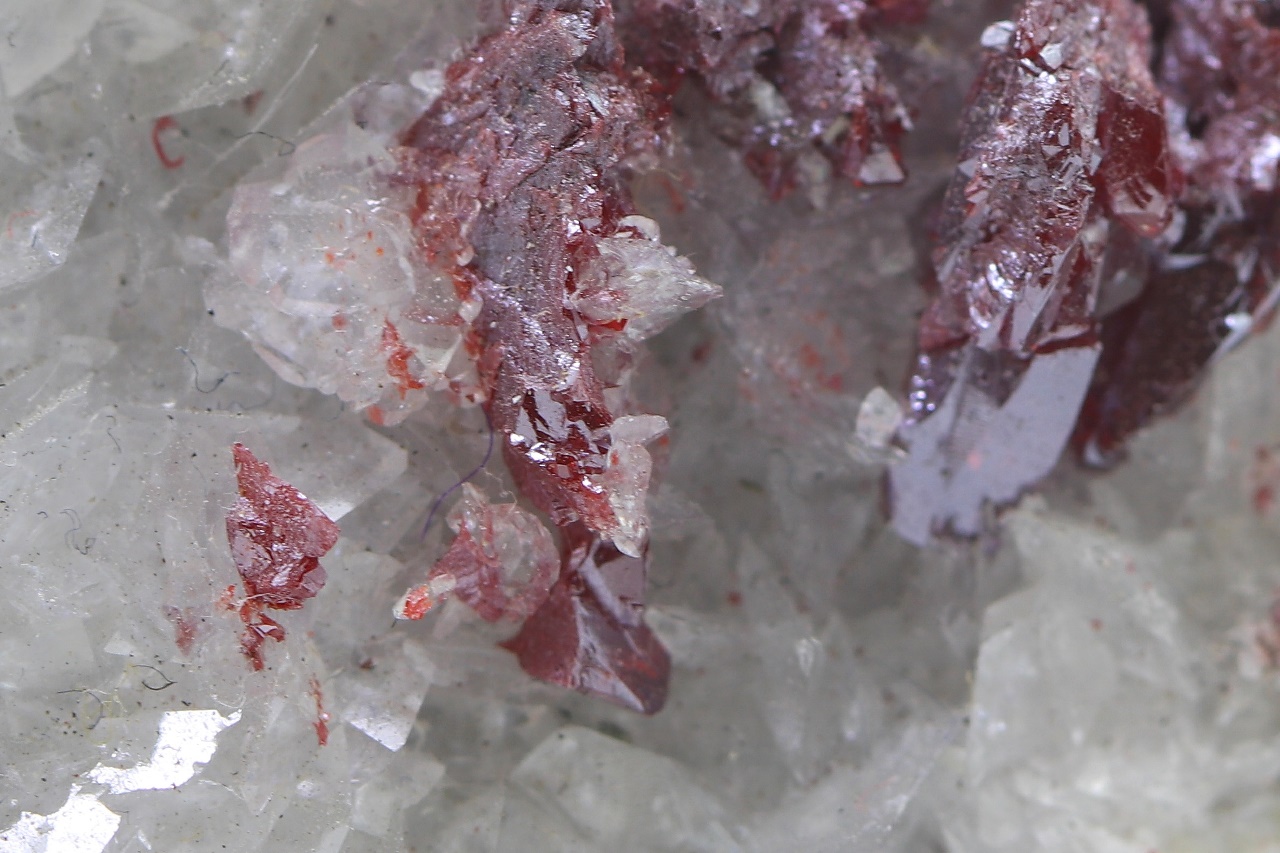 Intensiv rote Proustit-Kristalle auf weißem Calcit. Der größte Kristall ist 8 mm groß.
