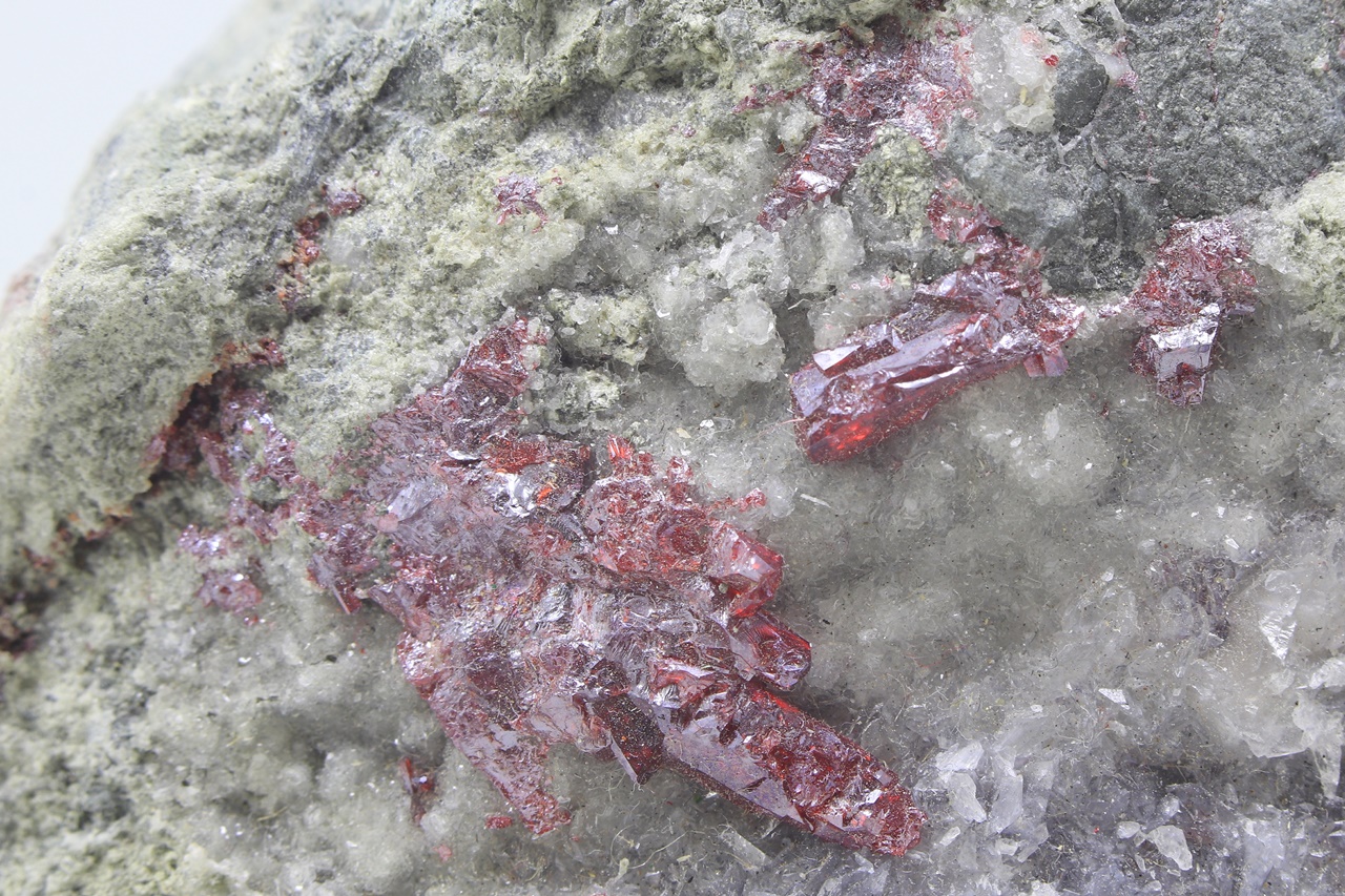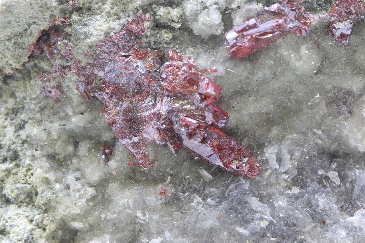 Satt rote, durchscheinende Kristalle von Silbersulfid, gewachsen auf klarem Kalcit. Der untere Bündel von Kristallen ist 23 mm groß, der obere Kristall ist 10 mm groß.