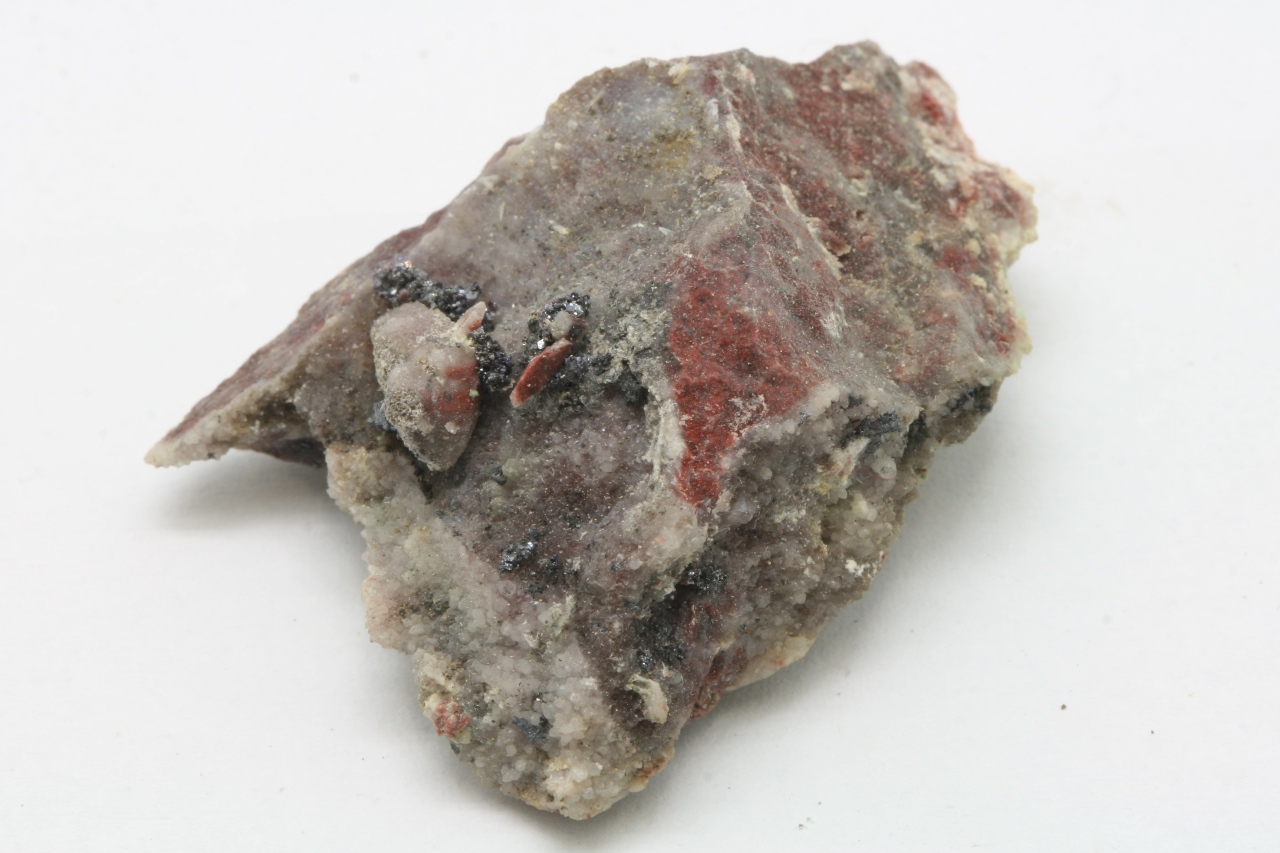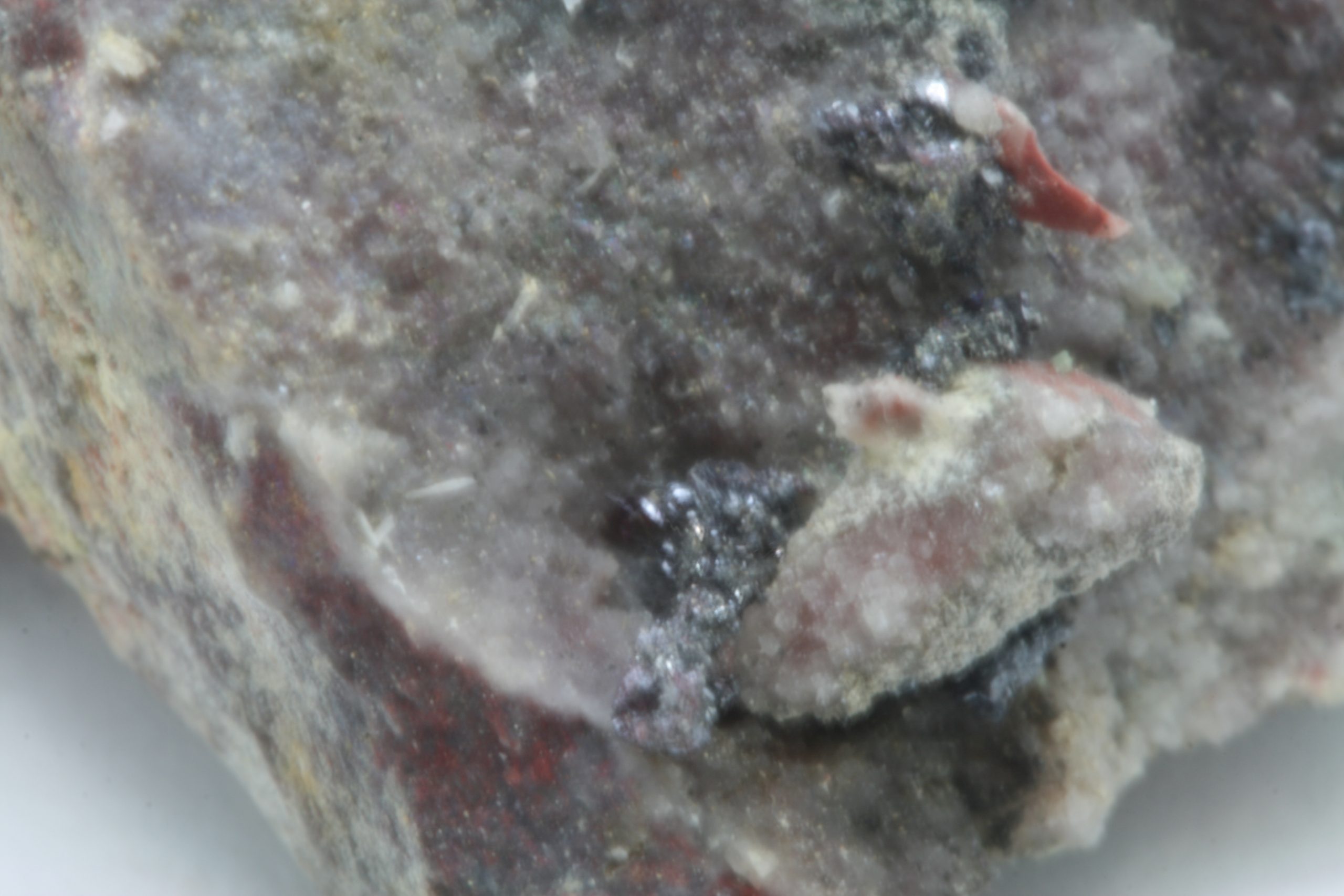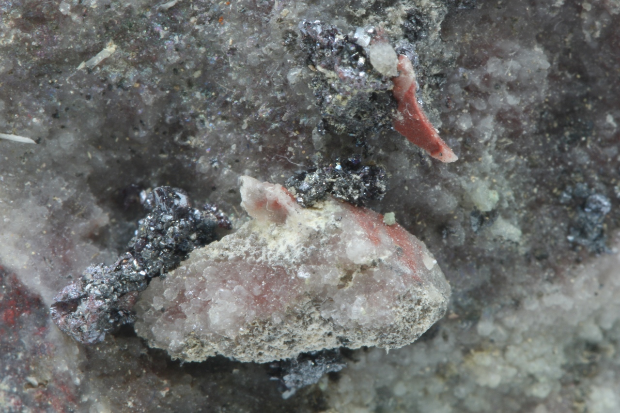 Cluster von metallischen, stellenweise rötlich gefärbten Proustit-Kristallen. Der größte Cluster ist 6 mm groß.