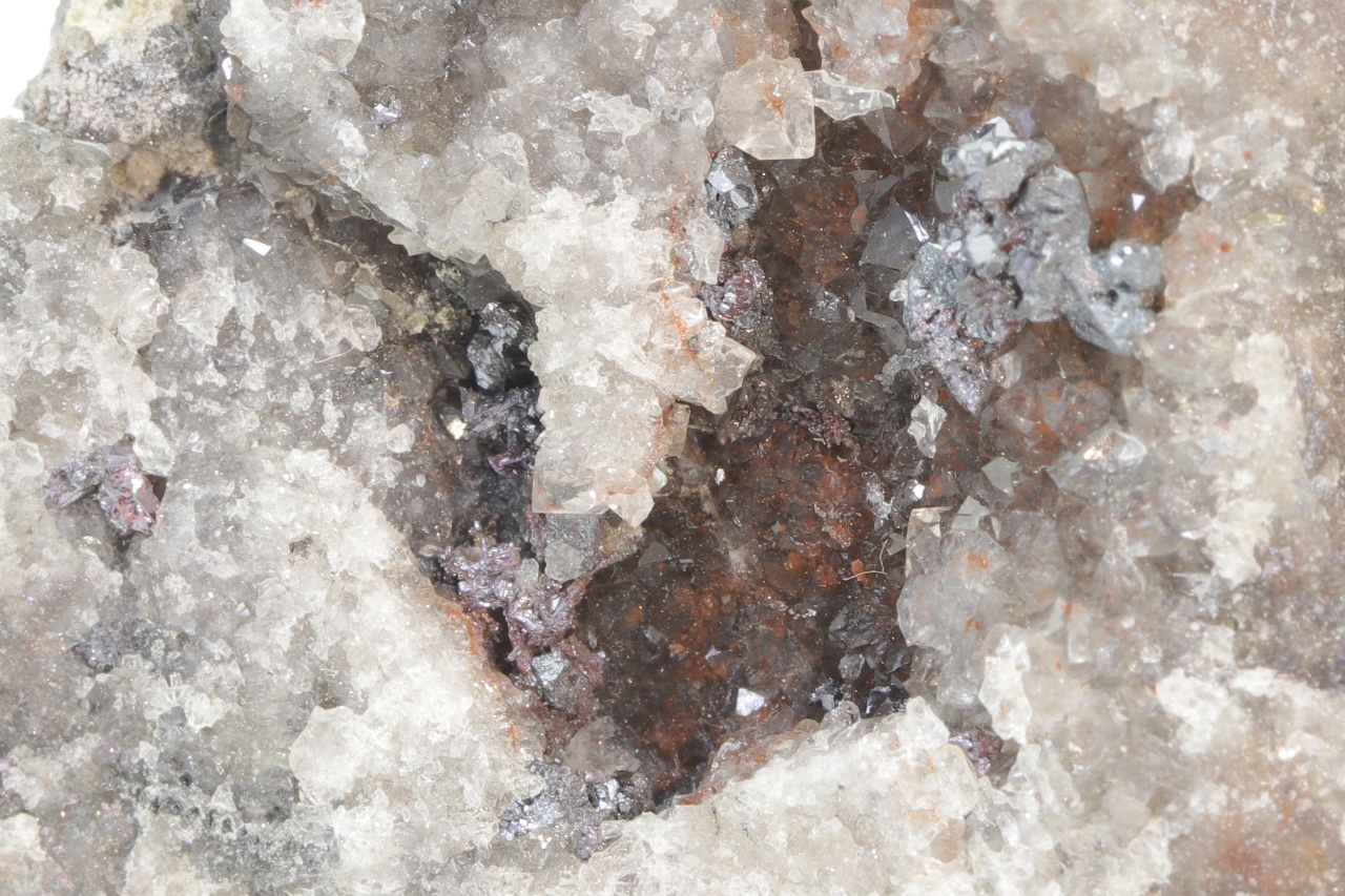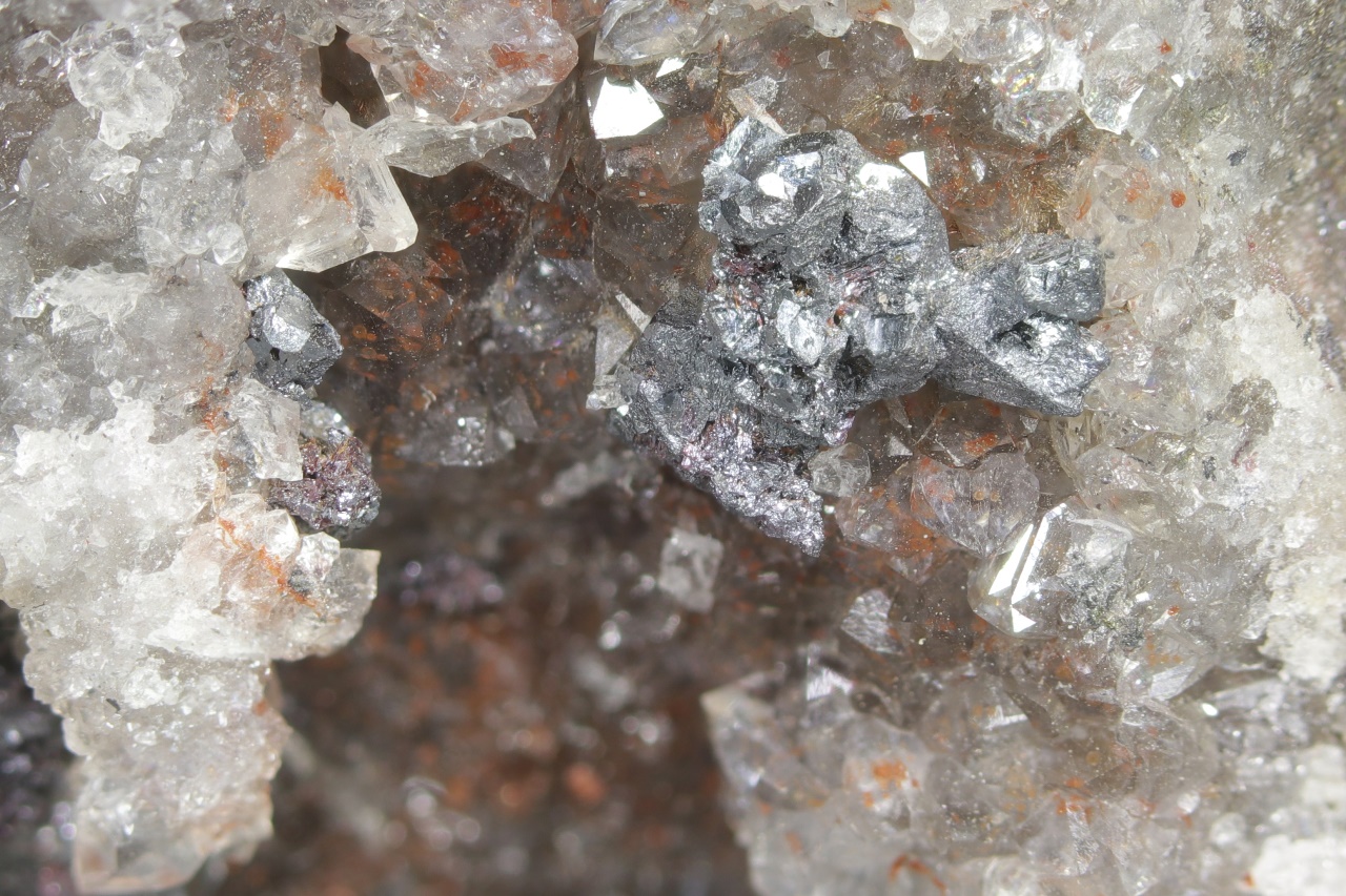 Clusters aus glänzenden, arsenhaltigen Silberkristallen von Proustit, eingebettet in einer Quarzhöhle. Das größte Cluster ist 6 mm groß.【4:4†cz_to_de.json】